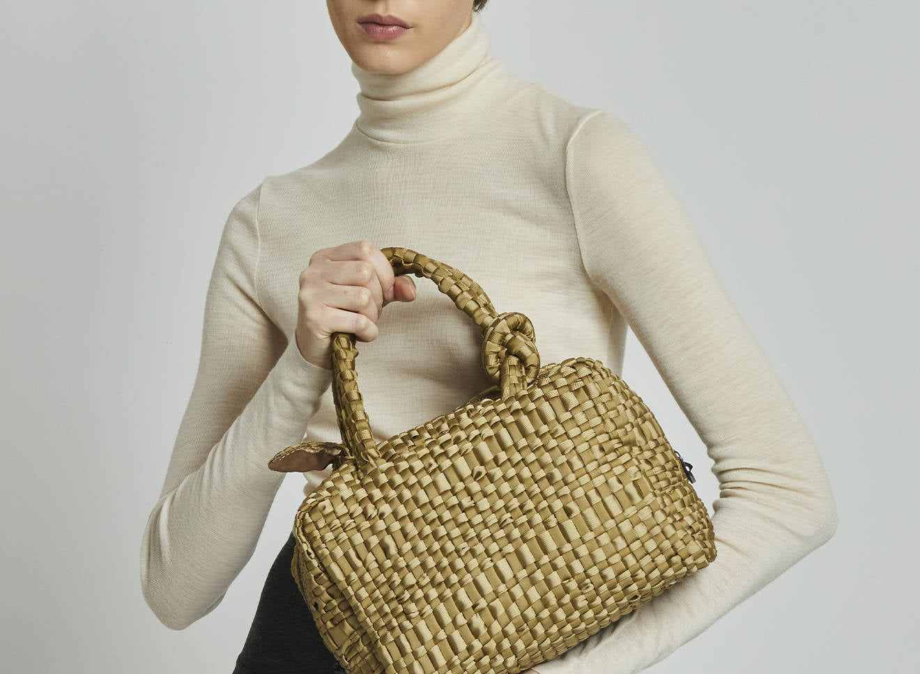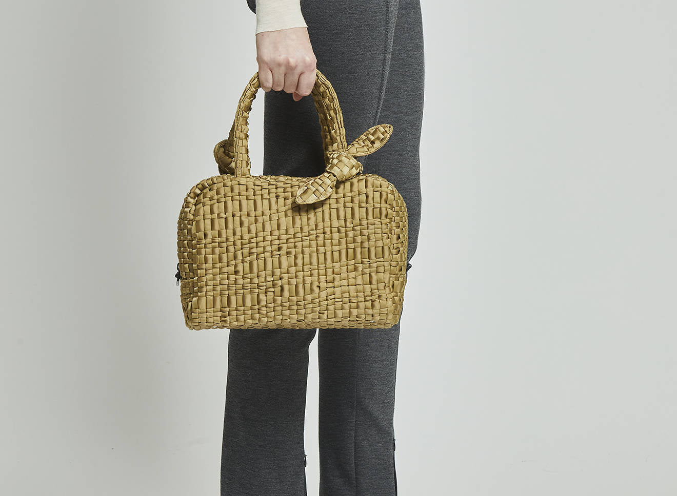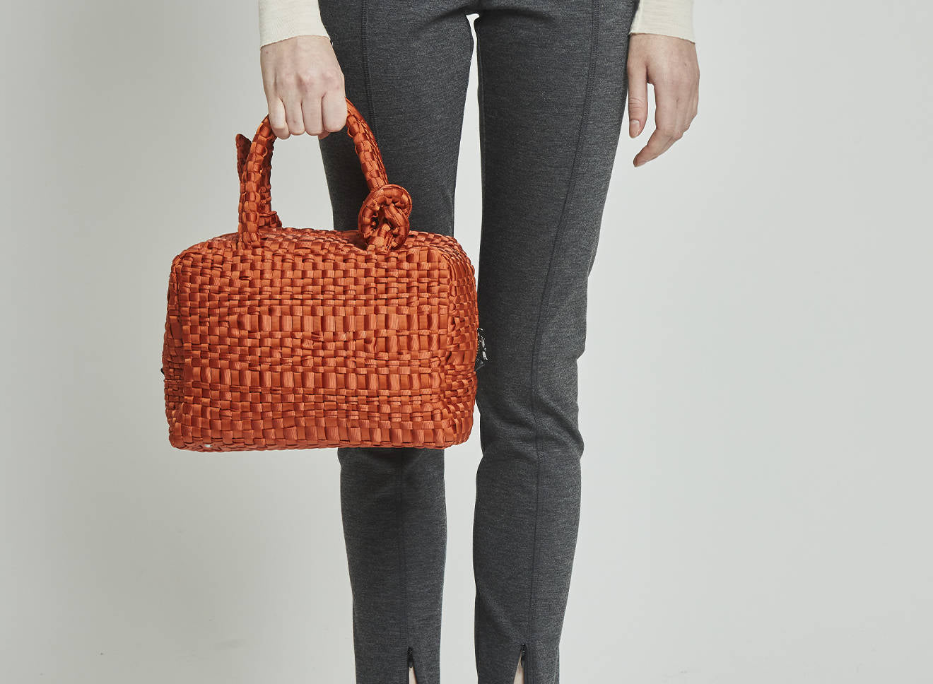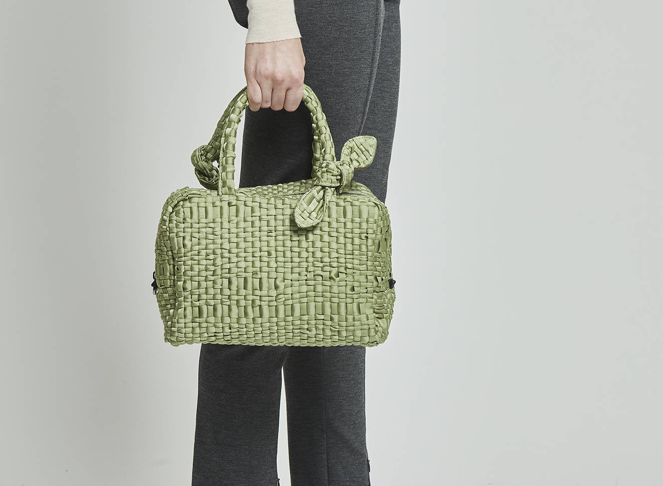 Hand-woven on a loom, this bag exudes authenticity and distinctive character. The artisanal craftsmanship creates a soft and original texture, enhanced by the decorative knotted handles. Spacious and functional, it's the ideal accessory to complete everyday looks with a touch of sophisticated style. Entirely designed and manufactured in Italy.