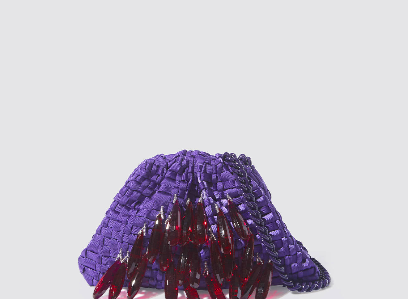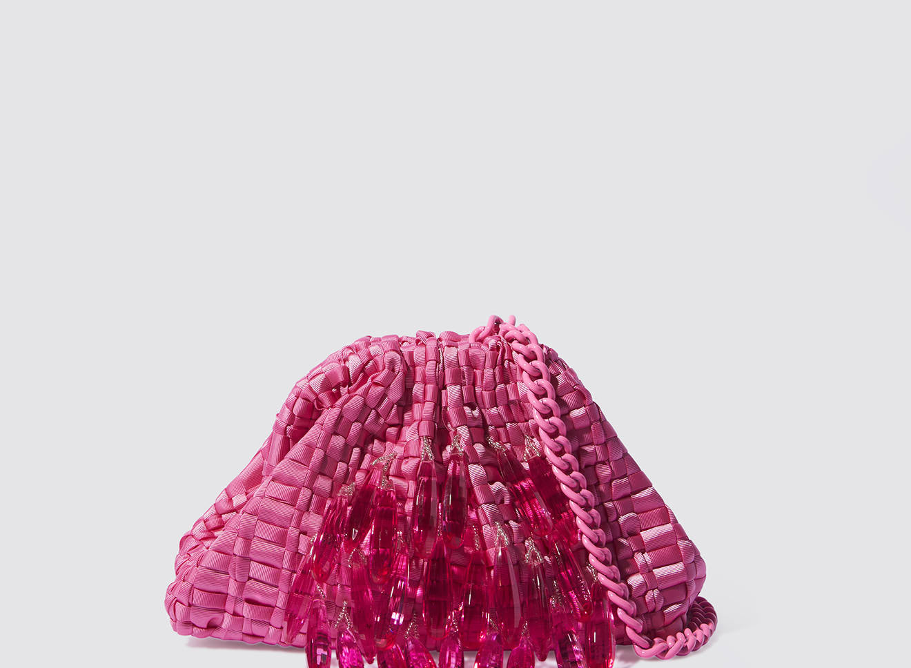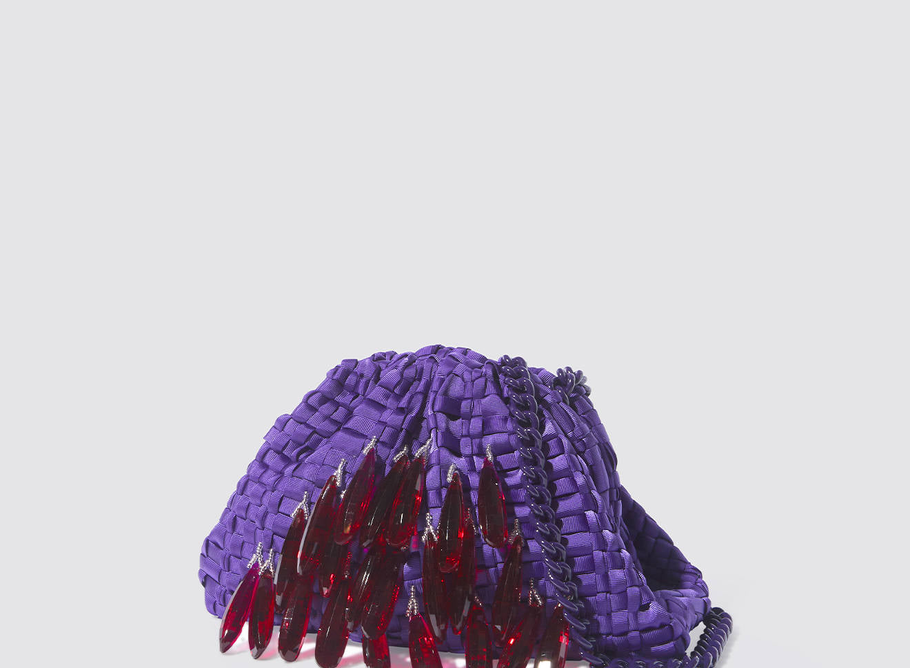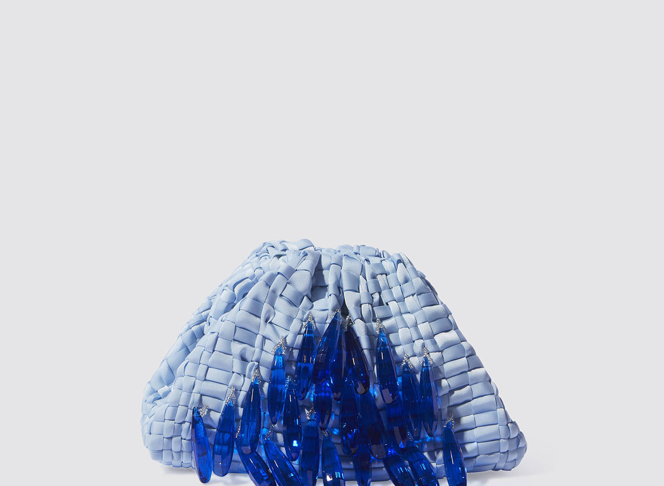 A small women's clutch bag made of hand-woven ribbon fabric on antique looms. It's embellished with hand-sewn, elongated, sparkling stone jewels. It's roomy enough to carry your essentials. Perfect for all seasons, it epitomizes a new urban elegance. It features a matching chain so you can also wear it crossbody.