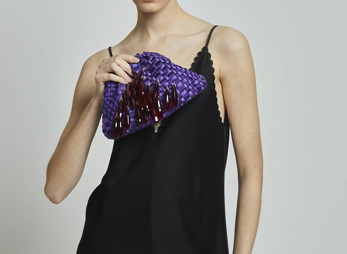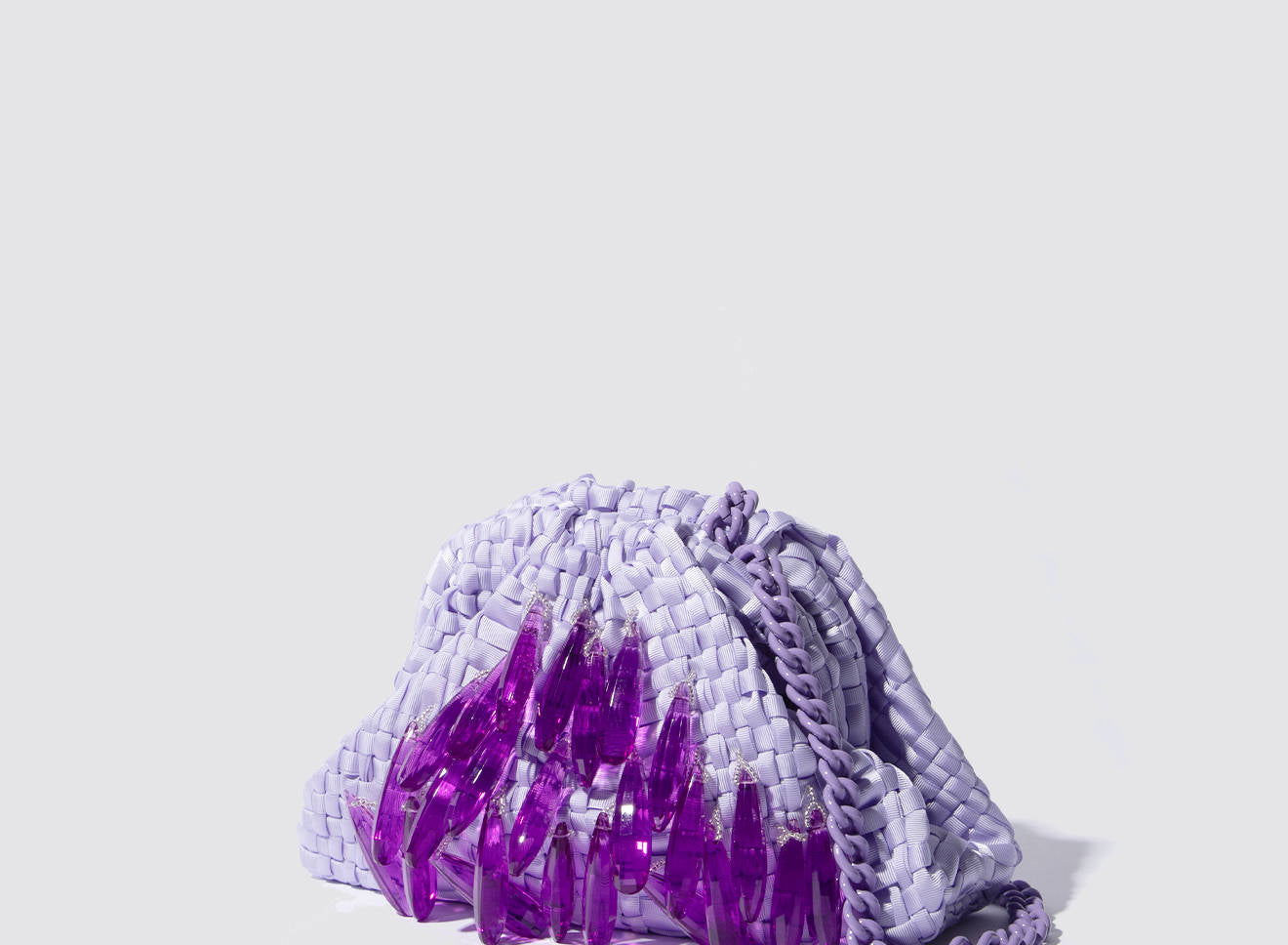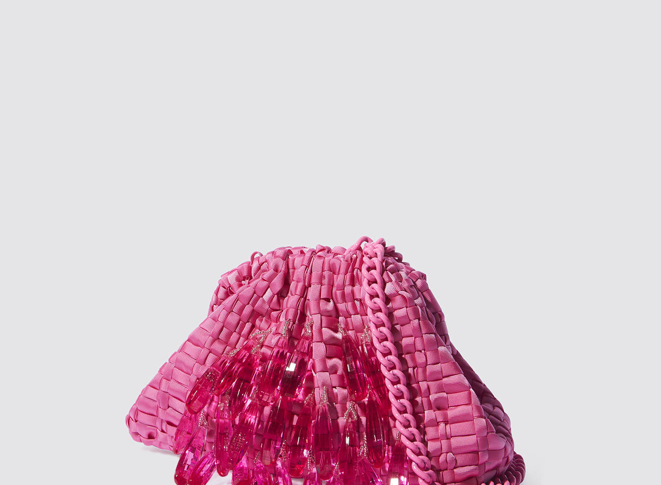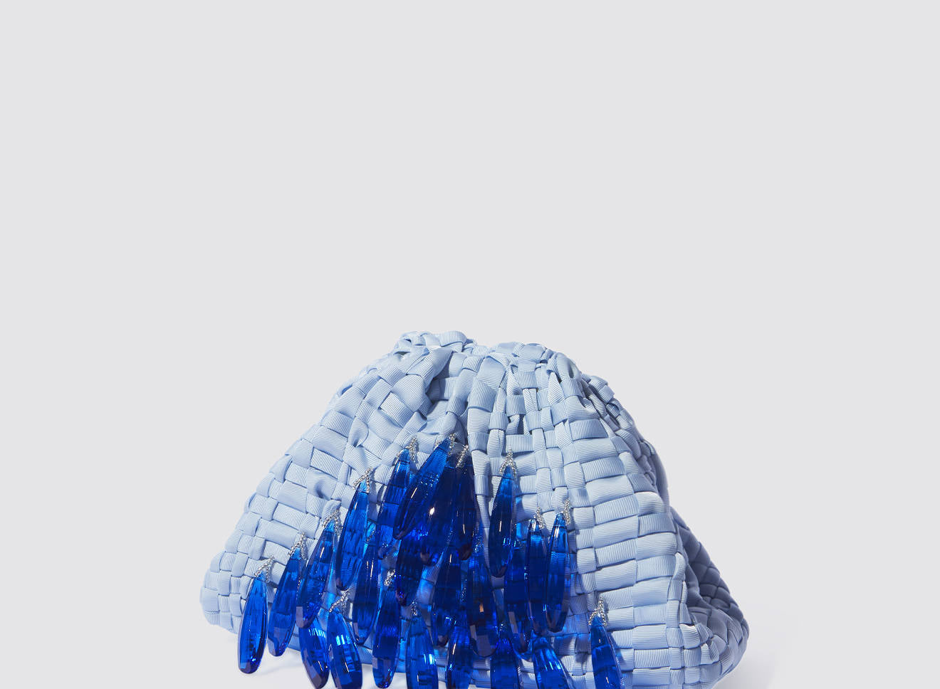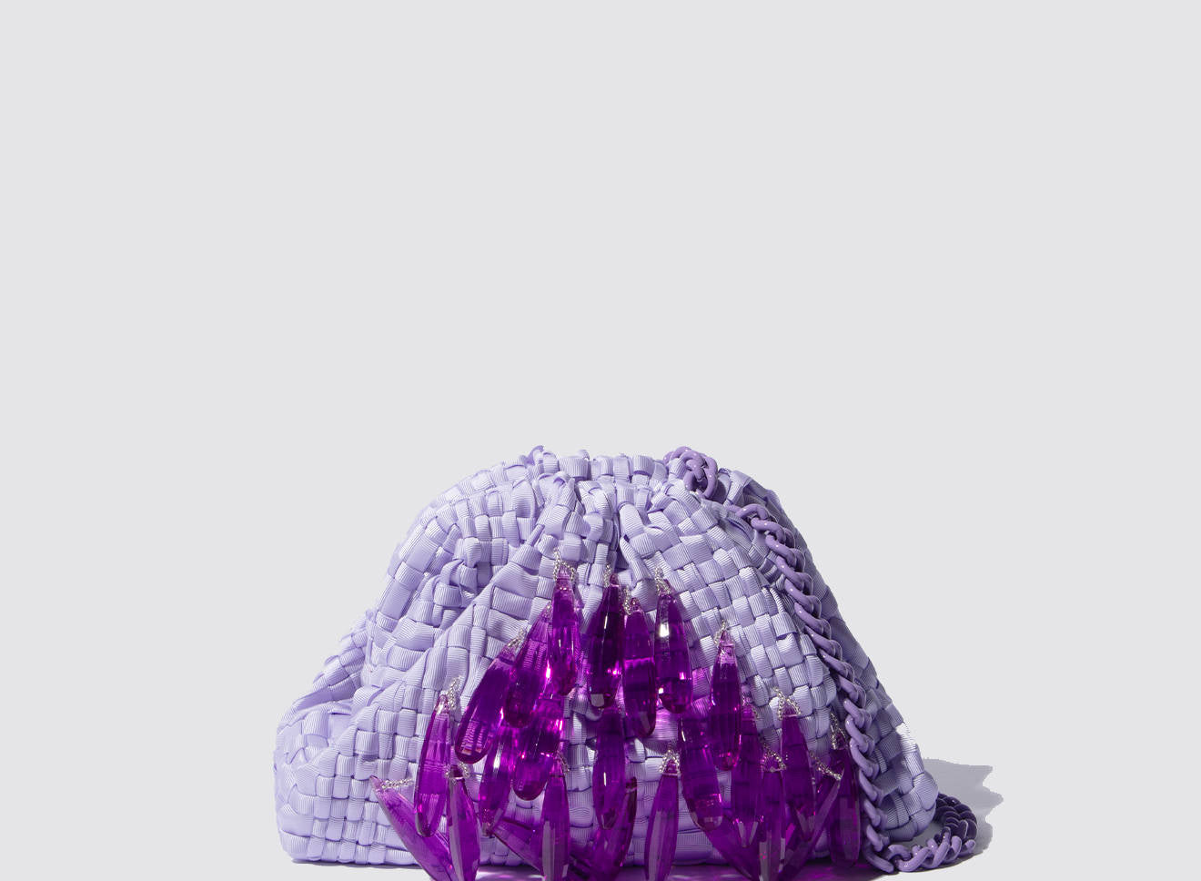 A small women's clutch bag made of hand-woven ribbon fabric on antique looms. It's embellished with hand-sewn, elongated, sparkling stone jewels. It's roomy enough to carry your essentials. Perfect for all seasons, it epitomizes a new urban elegance. It features a matching chain so you can also wear it crossbody.
