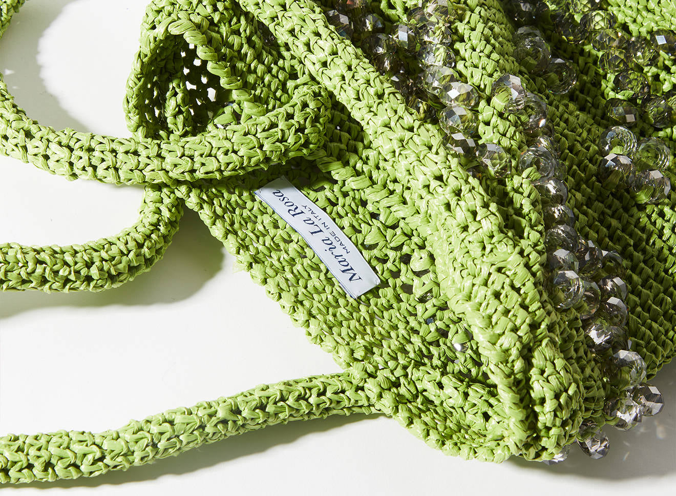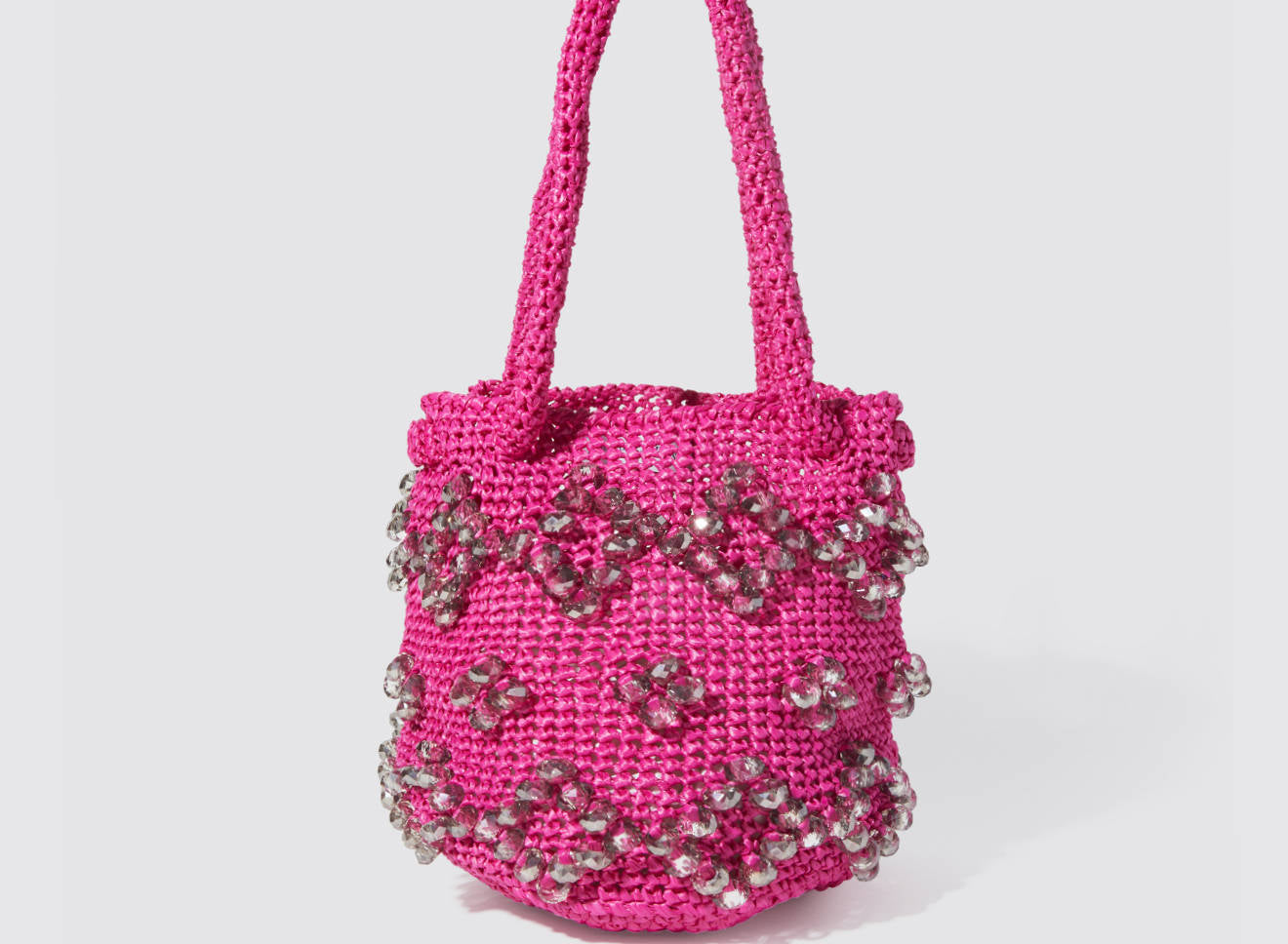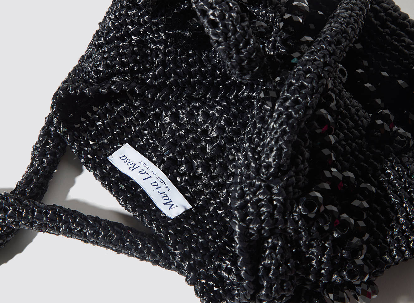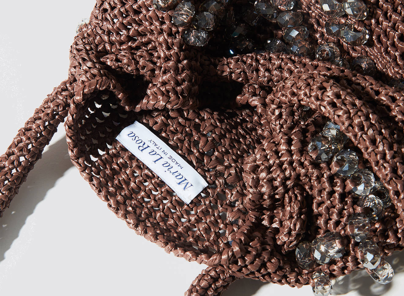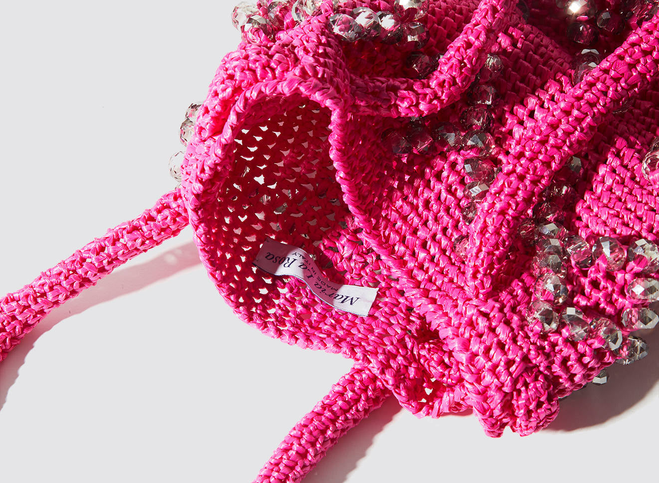 A medium-sized women's bag in raffia fabric, handmade on antique looms. It's Maria La Rosa's take on the ever-popular bucket bag trend. Its minimalist shape is enhanced by a precious constellation of hand-embroidered stones.