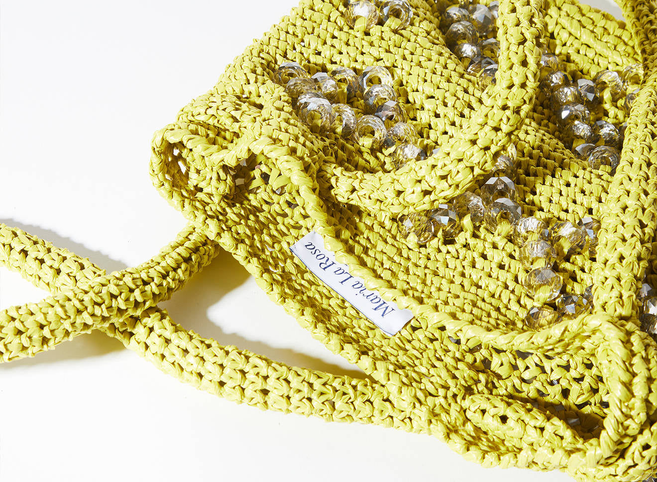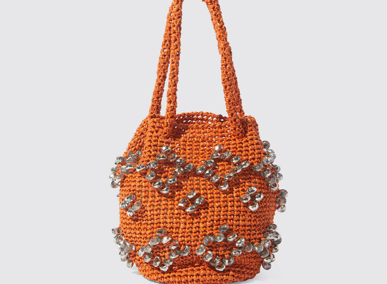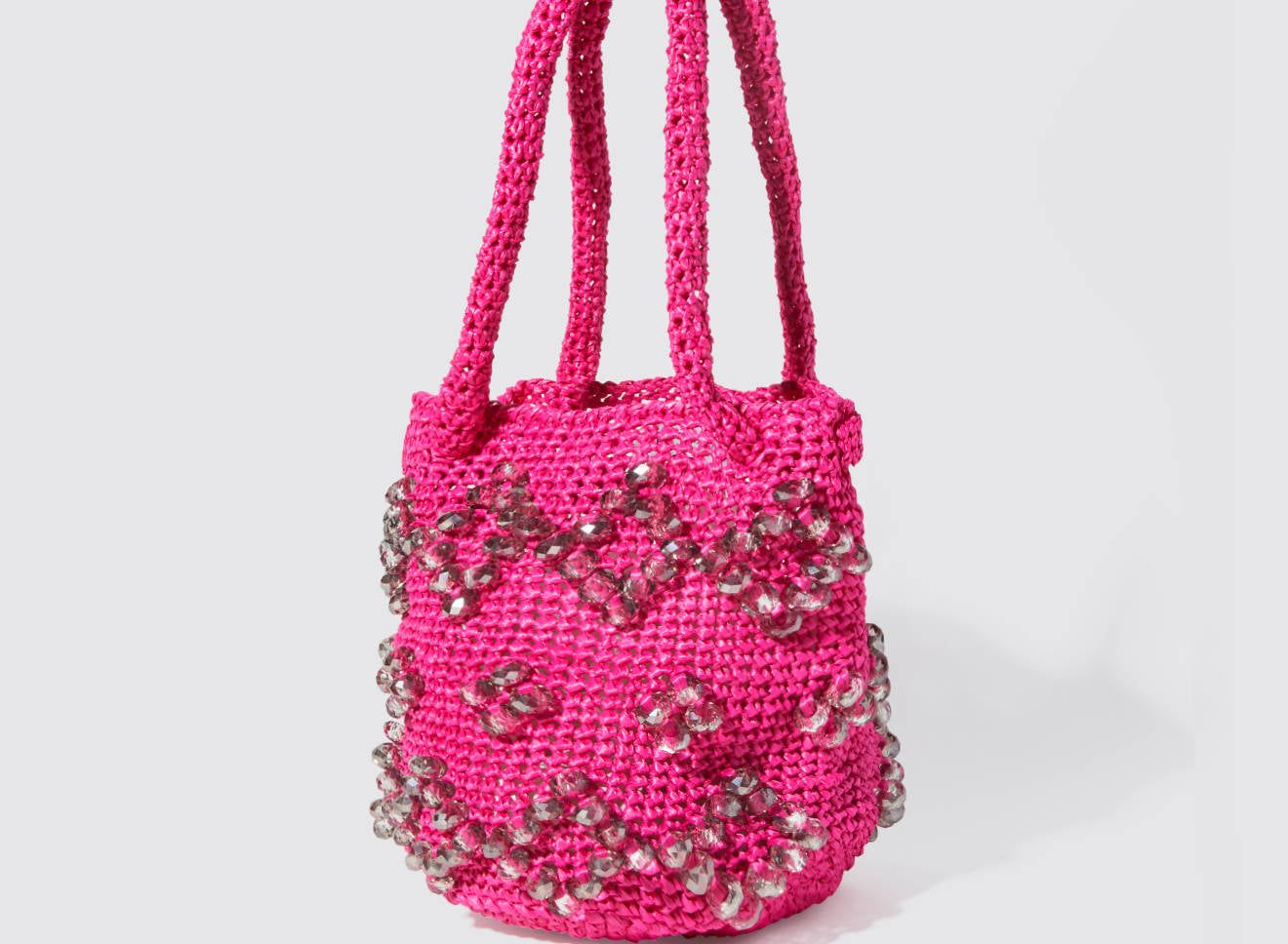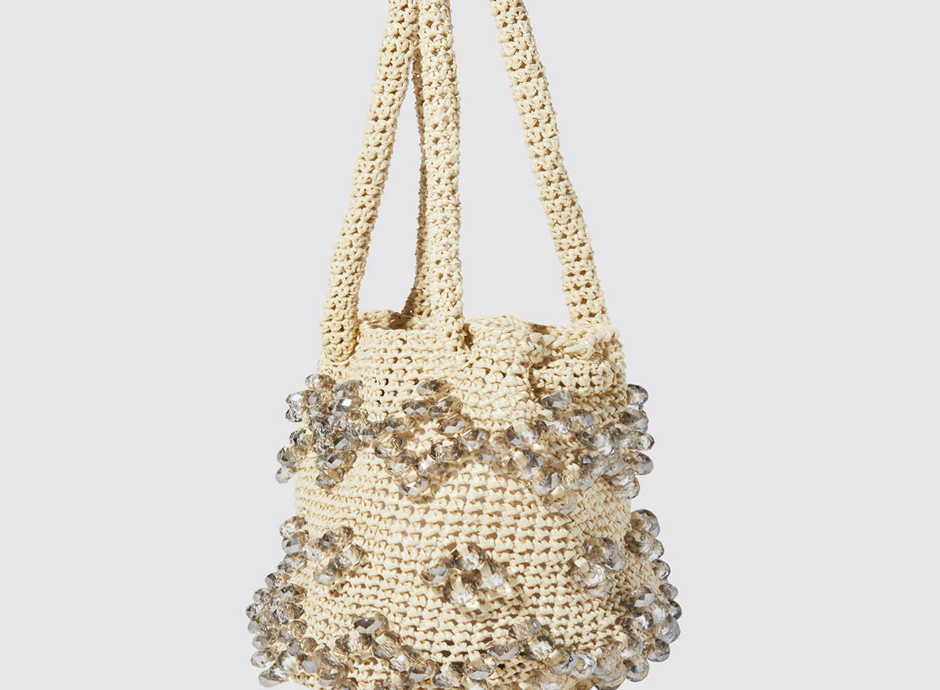 A medium-sized women's bag in raffia fabric, handmade on antique looms. It's Maria La Rosa's take on the ever-popular bucket bag trend. Its minimalist shape is enhanced by a precious constellation of hand-embroidered stones.