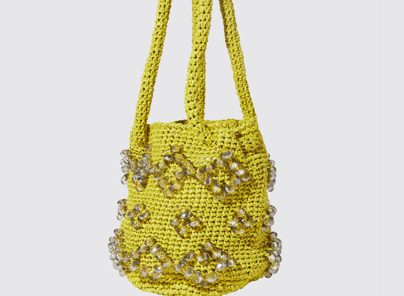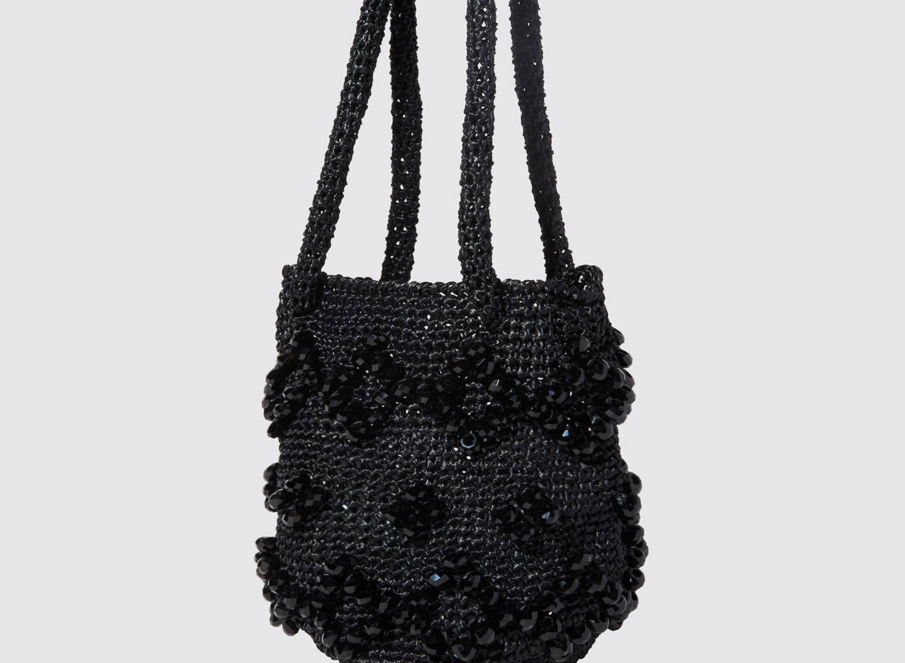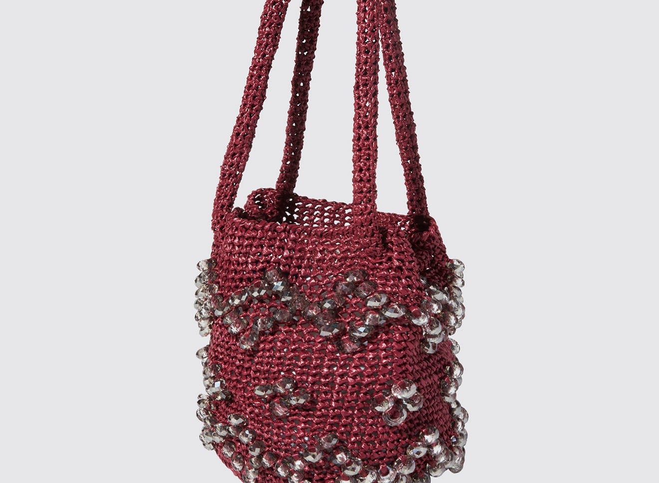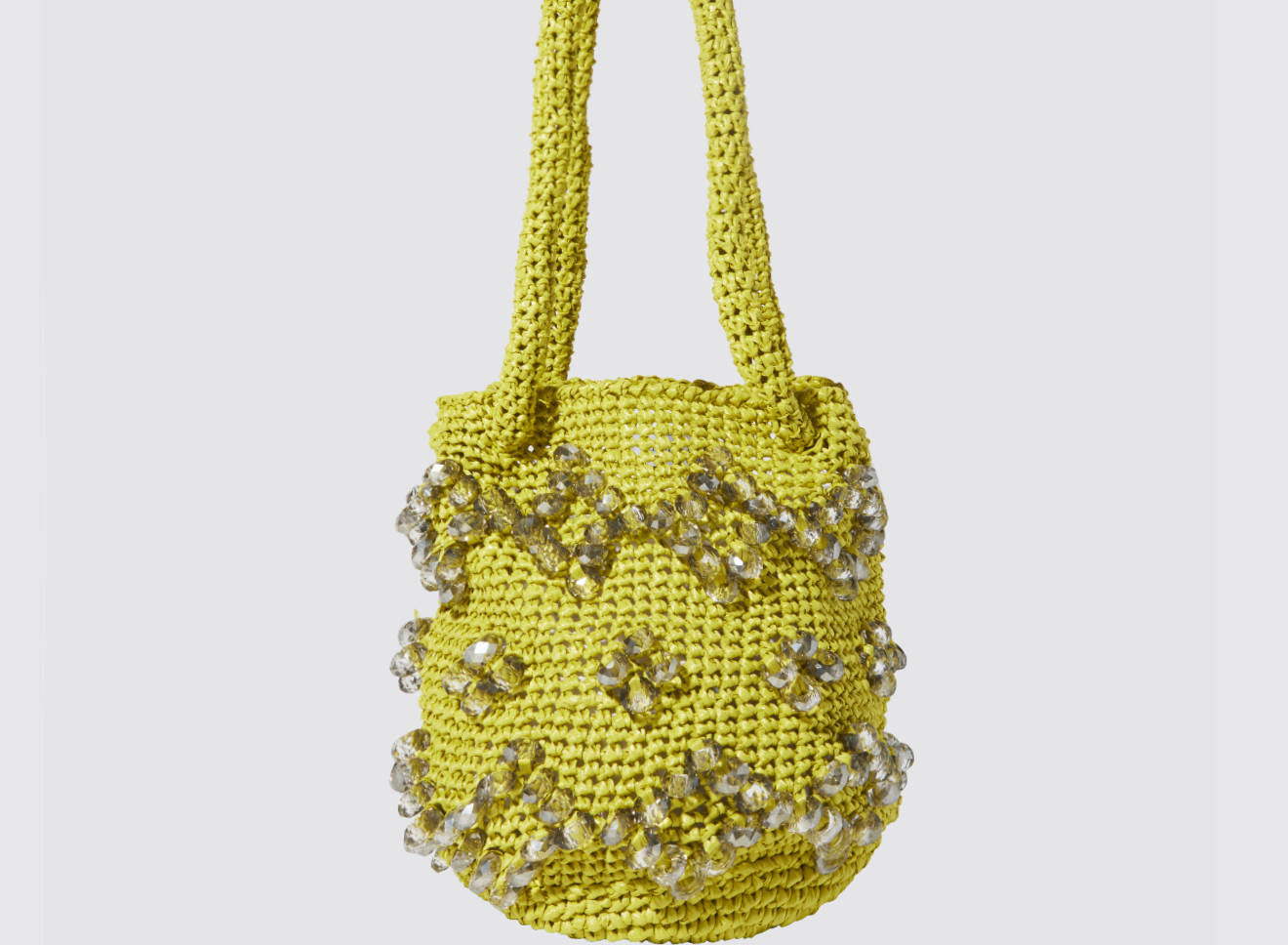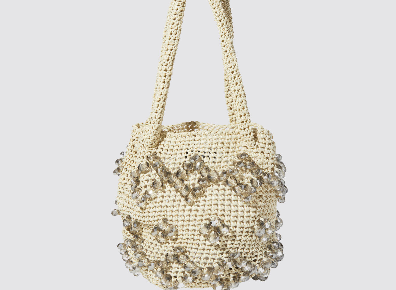 A medium-sized women's bag in raffia fabric, handmade on antique looms. It's Maria La Rosa's take on the ever-popular bucket bag trend. Its minimalist shape is enhanced by a precious constellation of hand-embroidered stones.