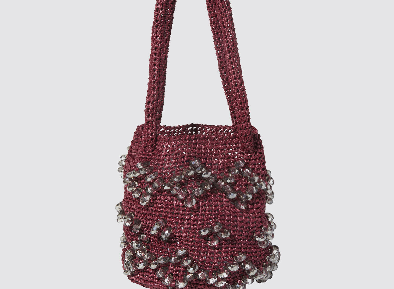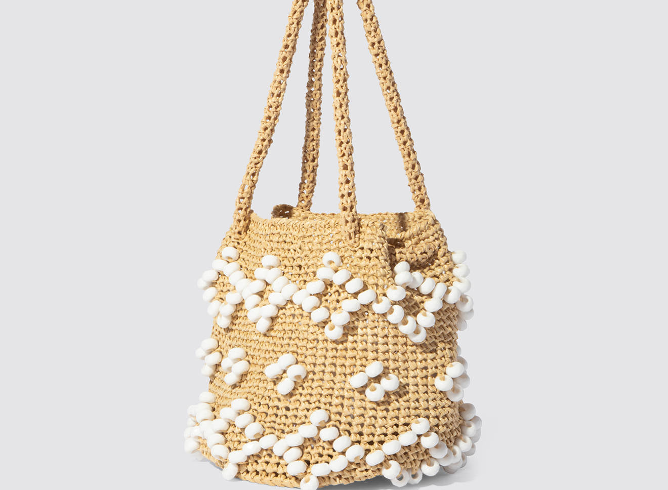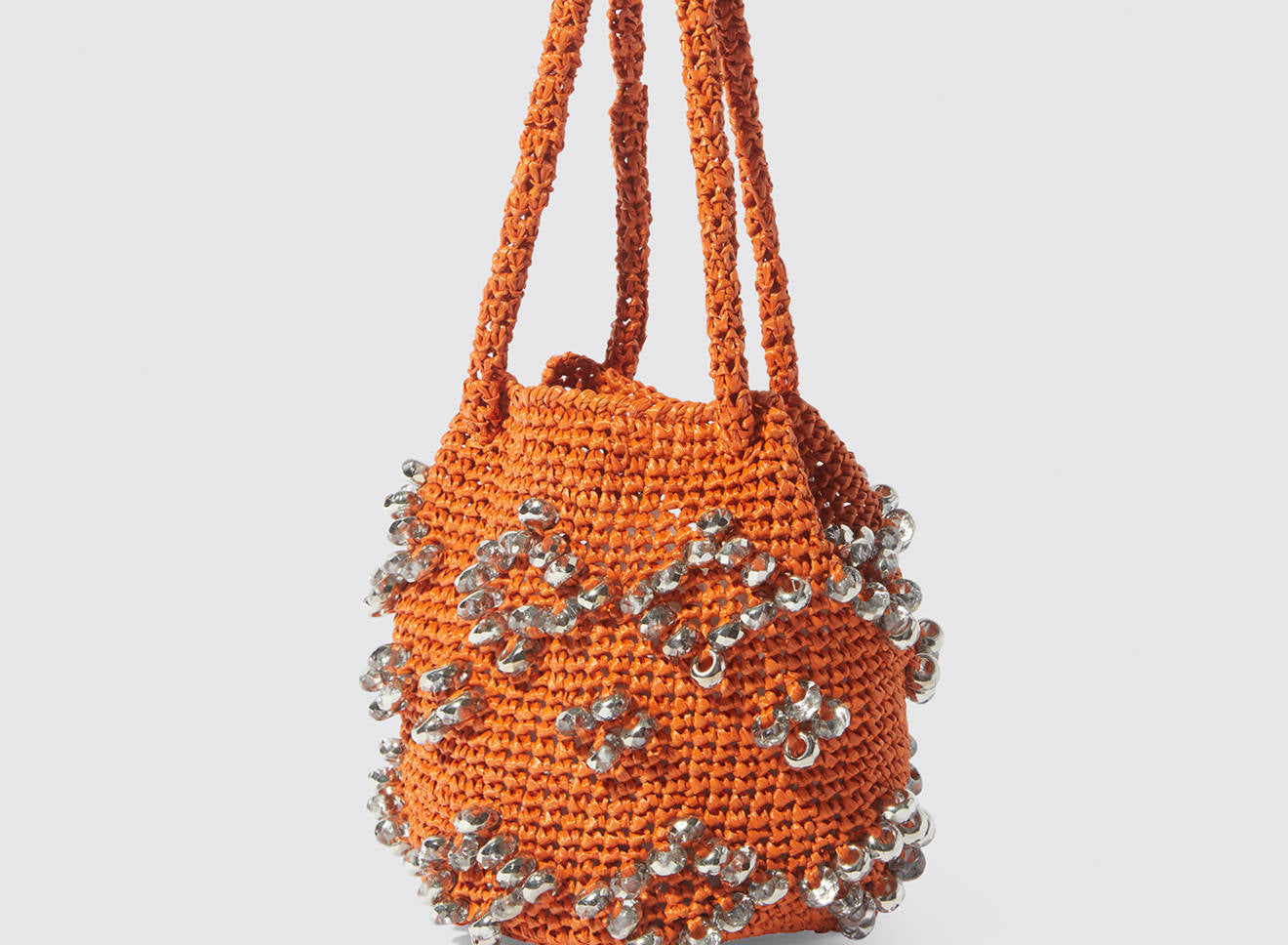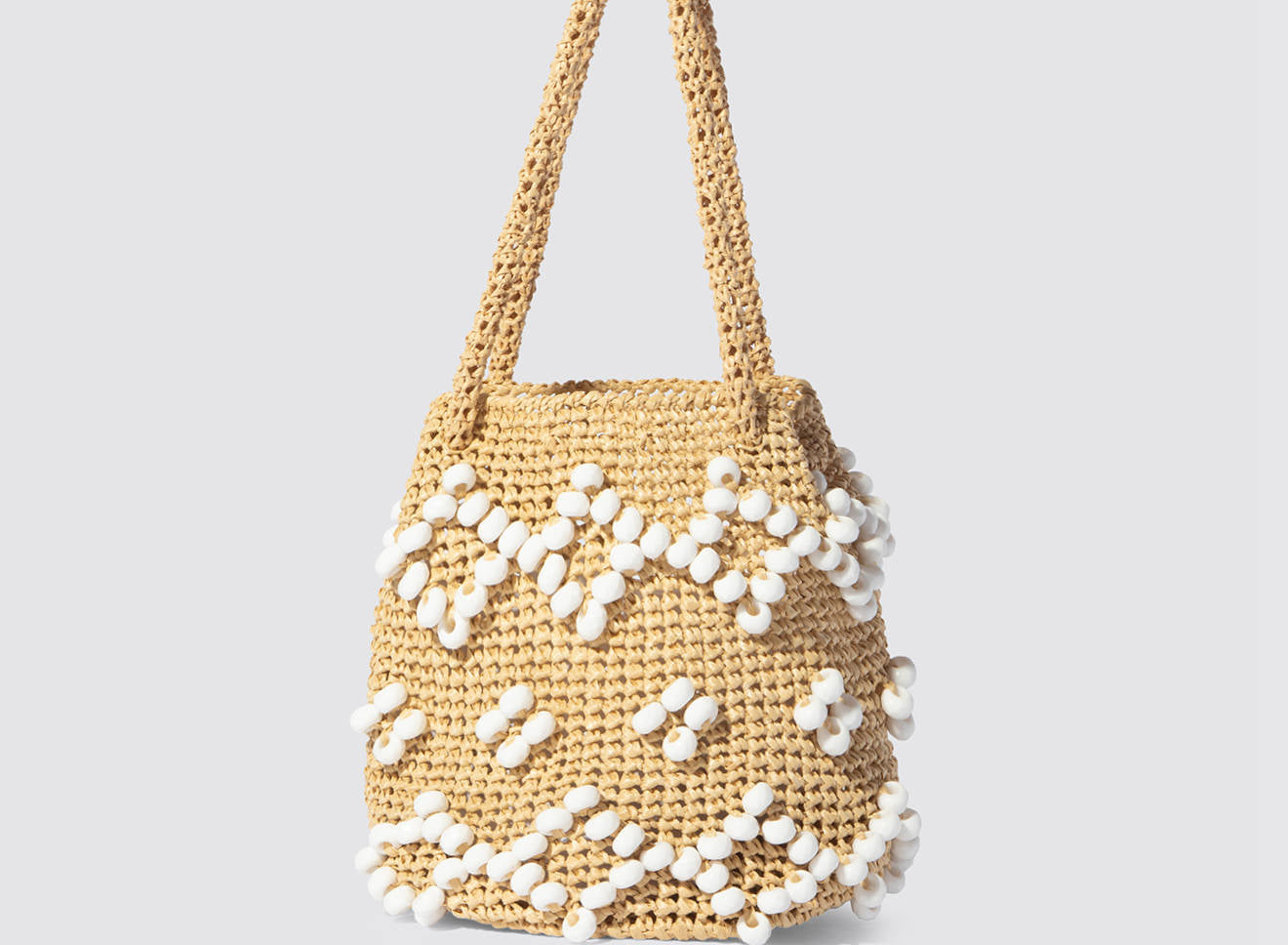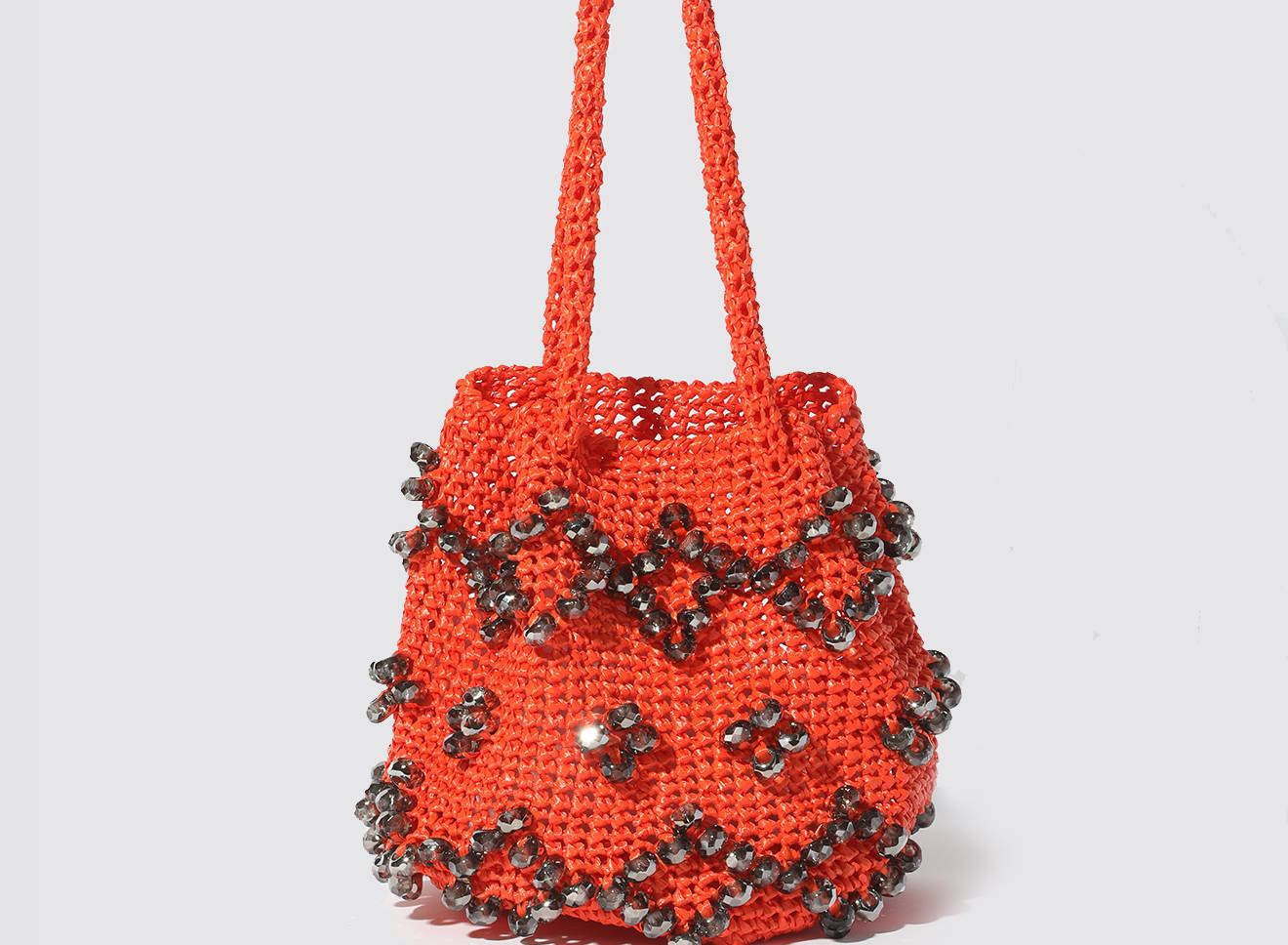 A medium-sized women's bag in raffia fabric, handmade on antique looms. It's Maria La Rosa's take on the ever-popular bucket bag trend. Its minimalist shape is enhanced by a precious constellation of hand-embroidered stones.