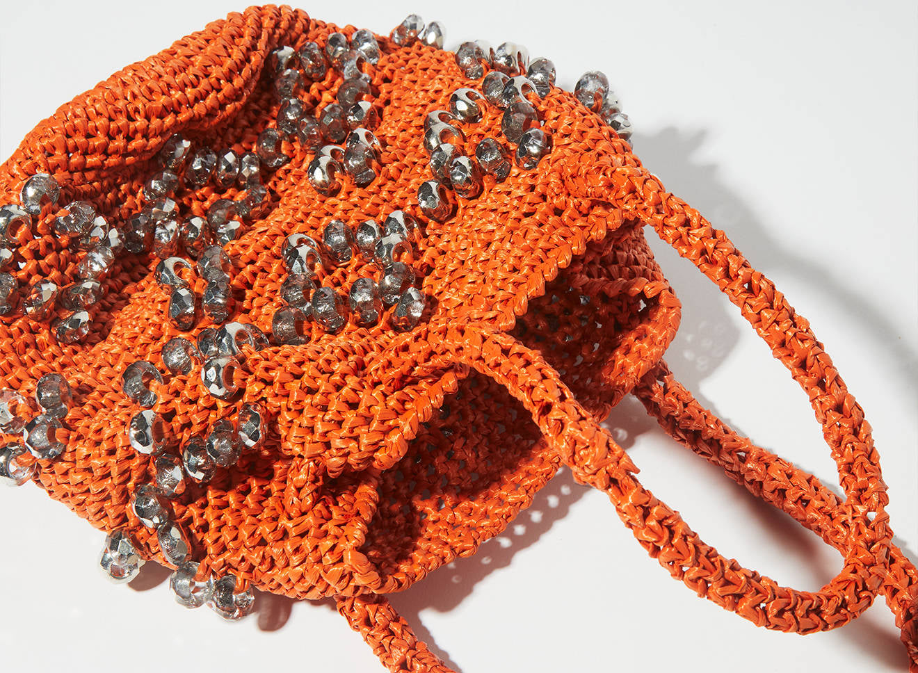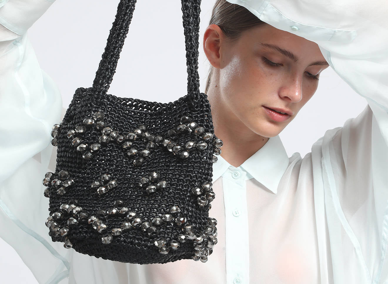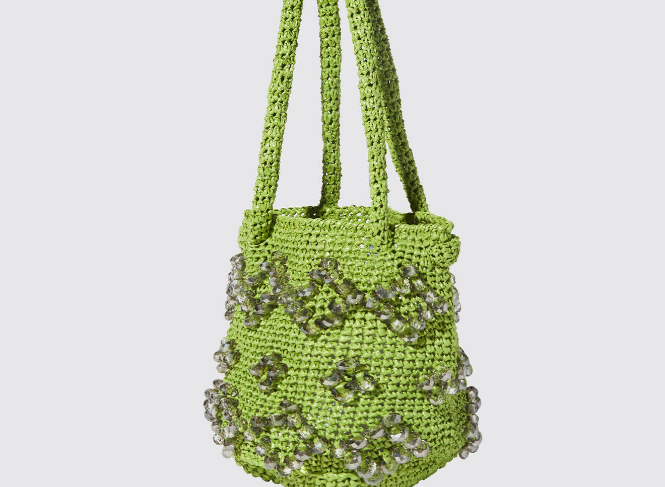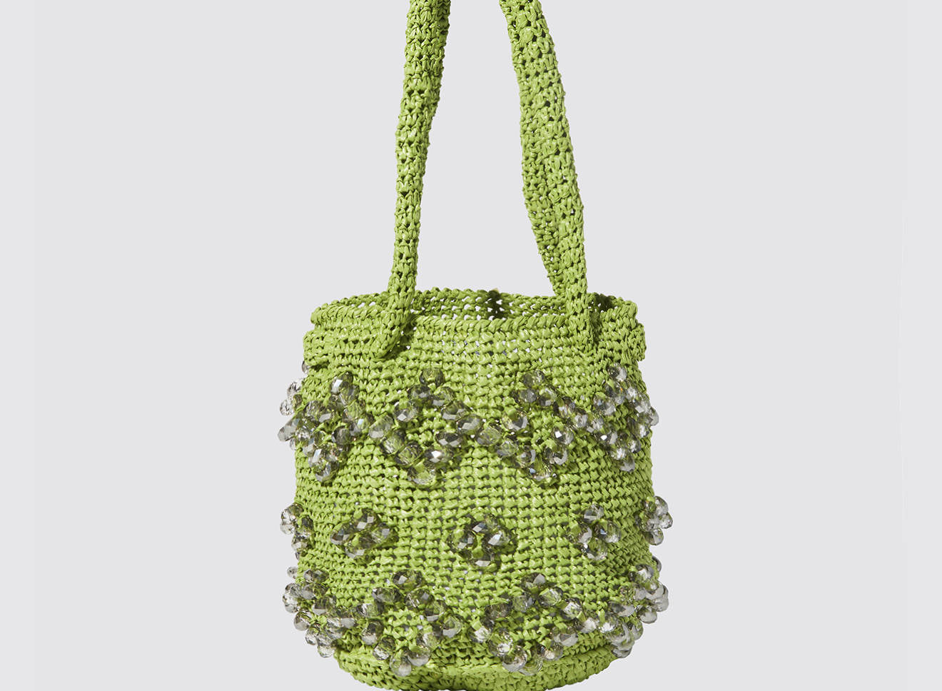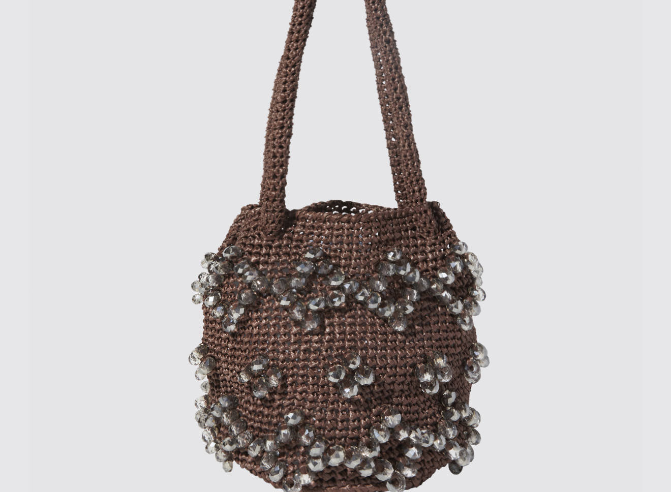 A medium-sized women's bag in raffia fabric, handmade on antique looms. It's Maria La Rosa's take on the ever-popular bucket bag trend. Its minimalist shape is enhanced by a precious constellation of hand-embroidered stones.