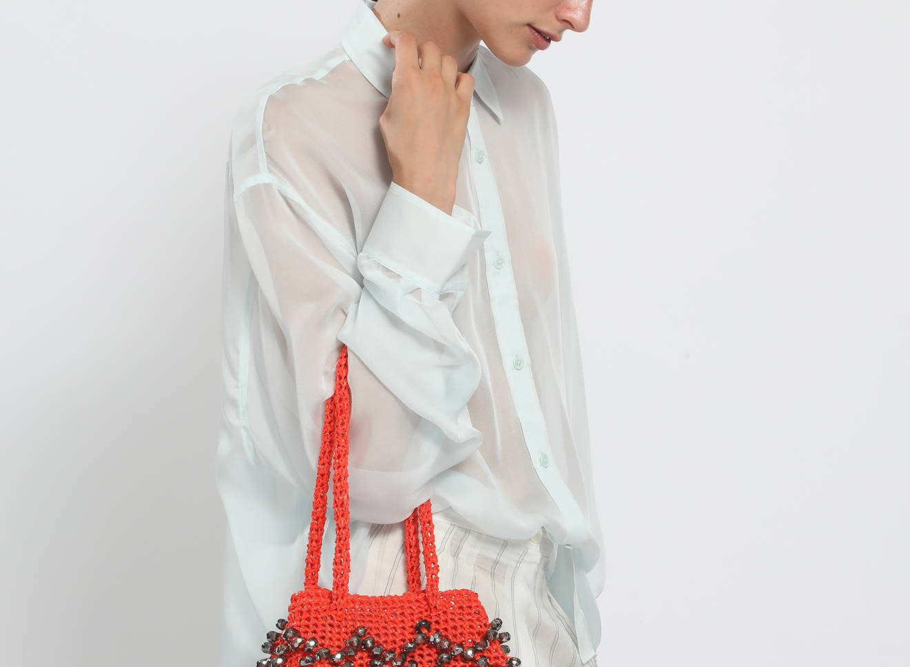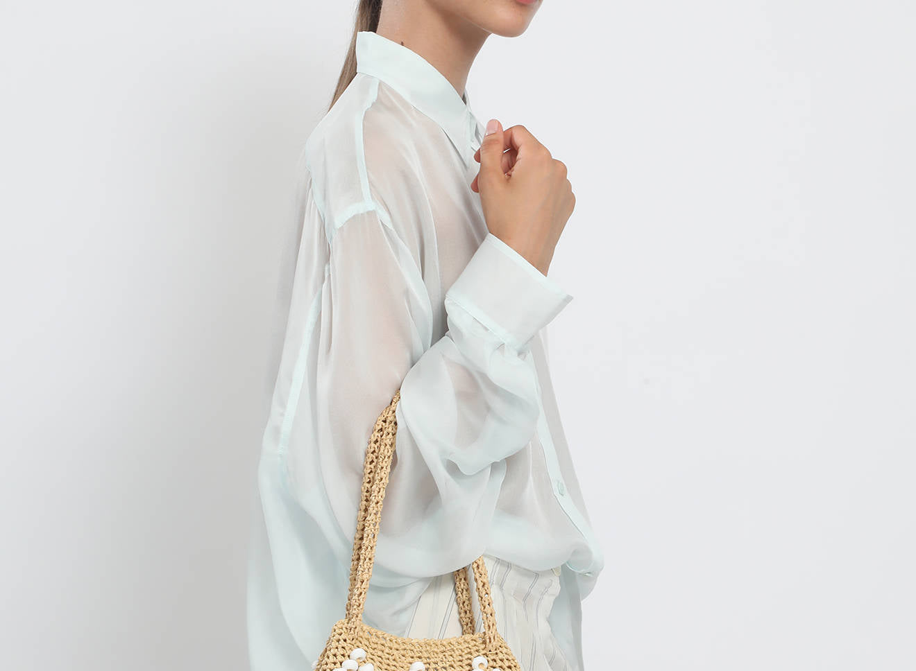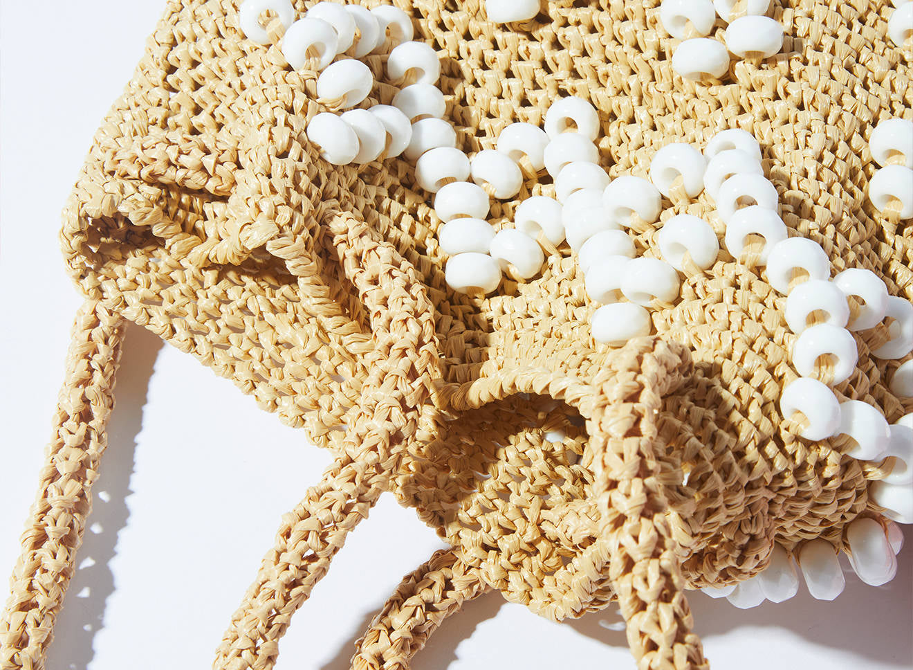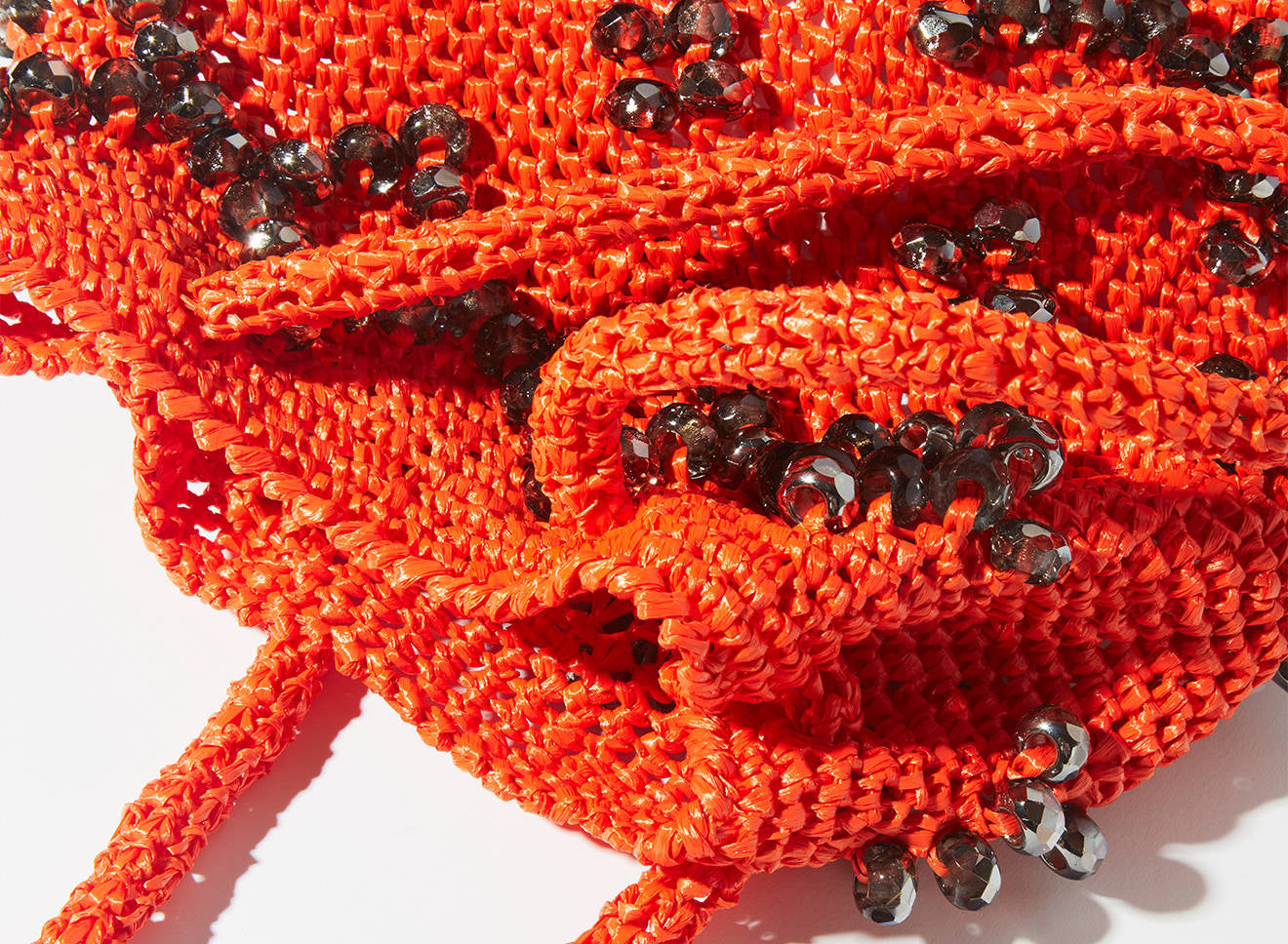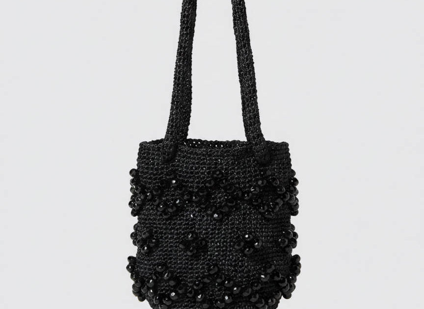A medium-sized women's bag in raffia fabric, handmade on antique looms. It's Maria La Rosa's take on the ever-popular bucket bag trend. Its minimalist shape is enhanced by a precious constellation of hand-embroidered stones.