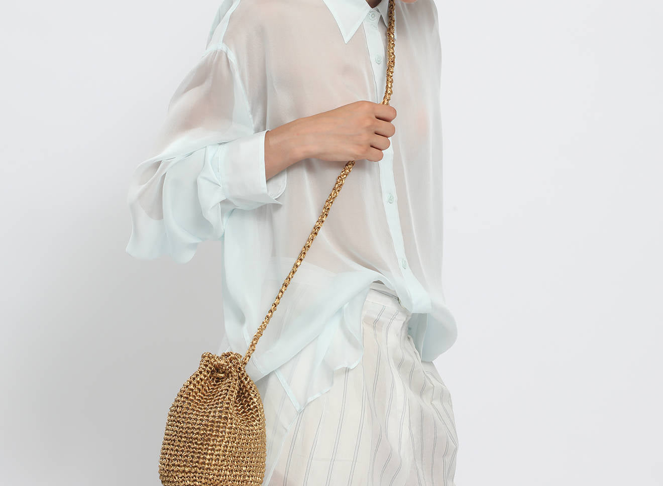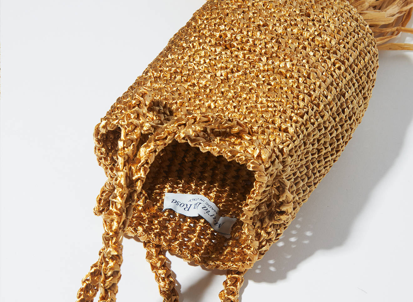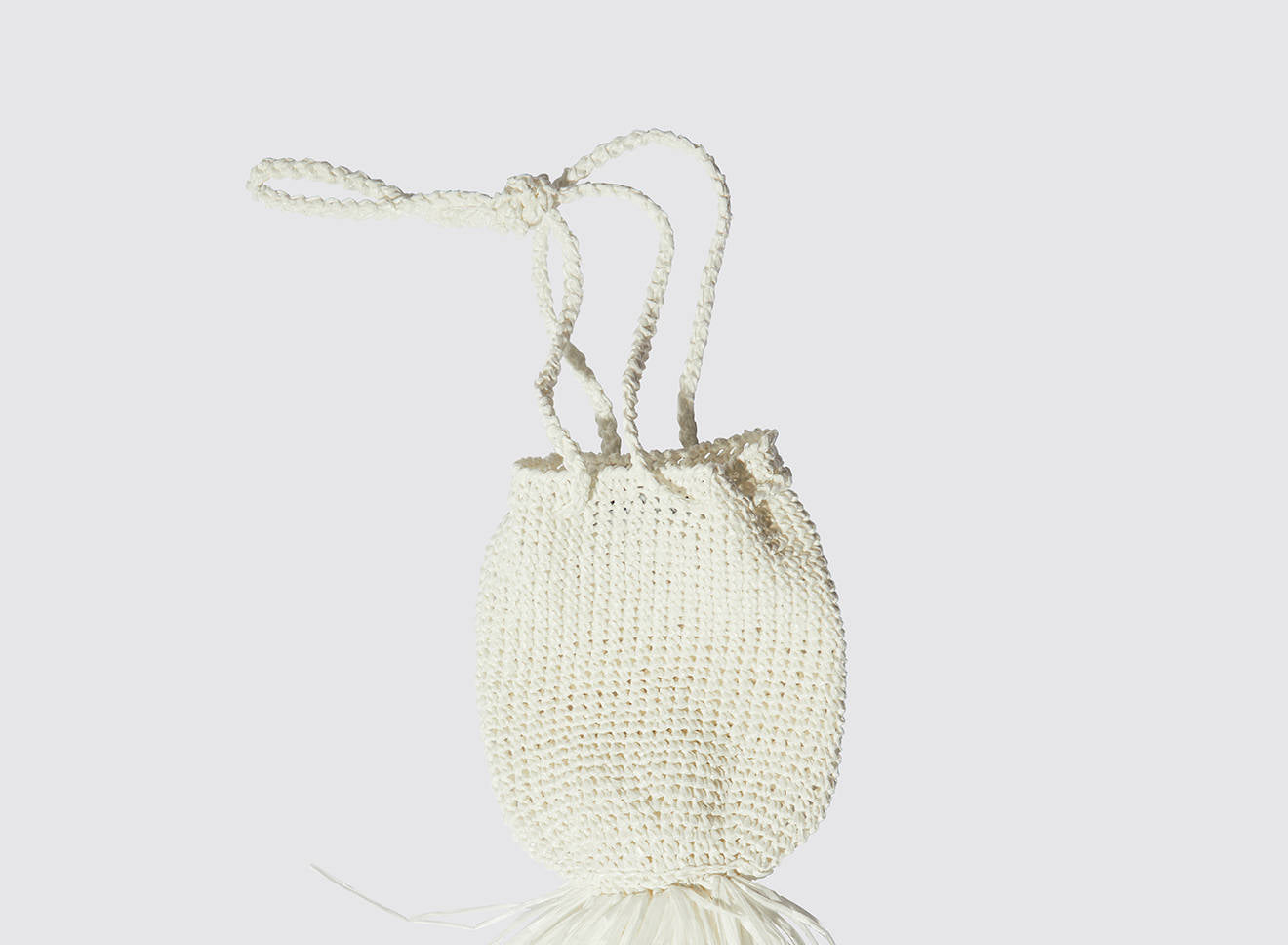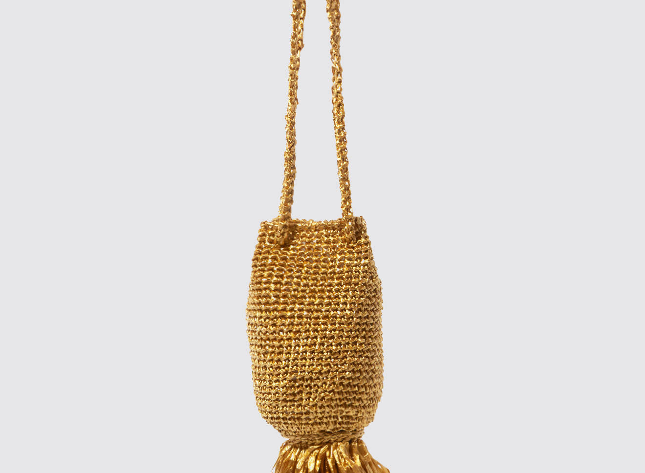 A small textile jewel that captures the light. This bag is entirely crocheted, hand-woven with a luminous thread that enhances the compact, three-dimensional texture of the weave.