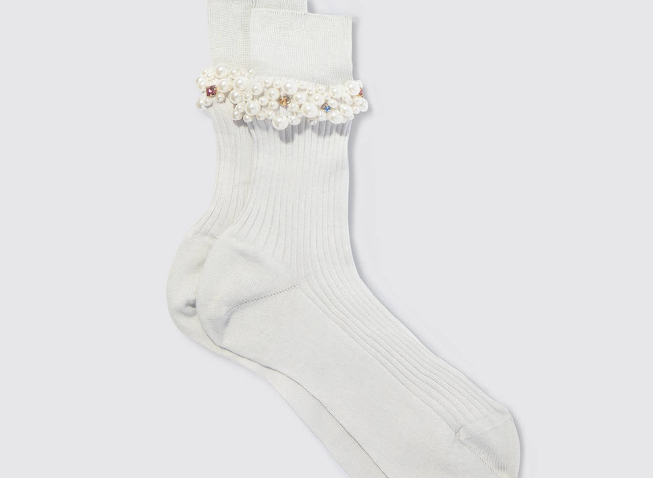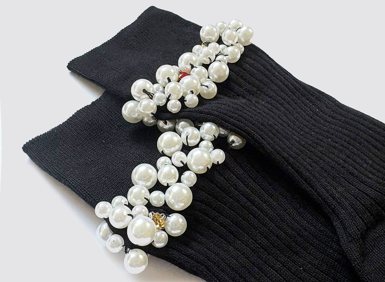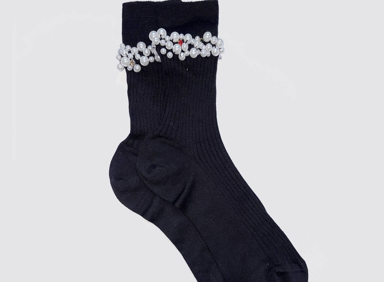 Calzini realizzati in morbido cotone biologico certificato, garantiscono comfort naturale e traspirabilità per tutto il giorno. Il tessuto ecologico rispetta la pelle e l'ambiente. Il bordo è decorato con un prezioso ricamo fatto a mano che combina perle bianche di diverse dimensioni e un raffinato accento di cristallo rosso. Ogni calza è un pezzo unico, testimonianza dell'arte della lavorazione artigianale italiana. Perfette per occasioni speciali o per chi ama distinguersi con discrezione anche nella vita quotidiana.