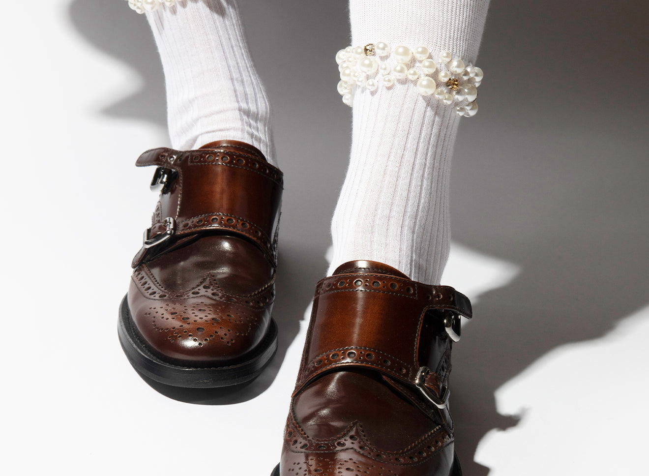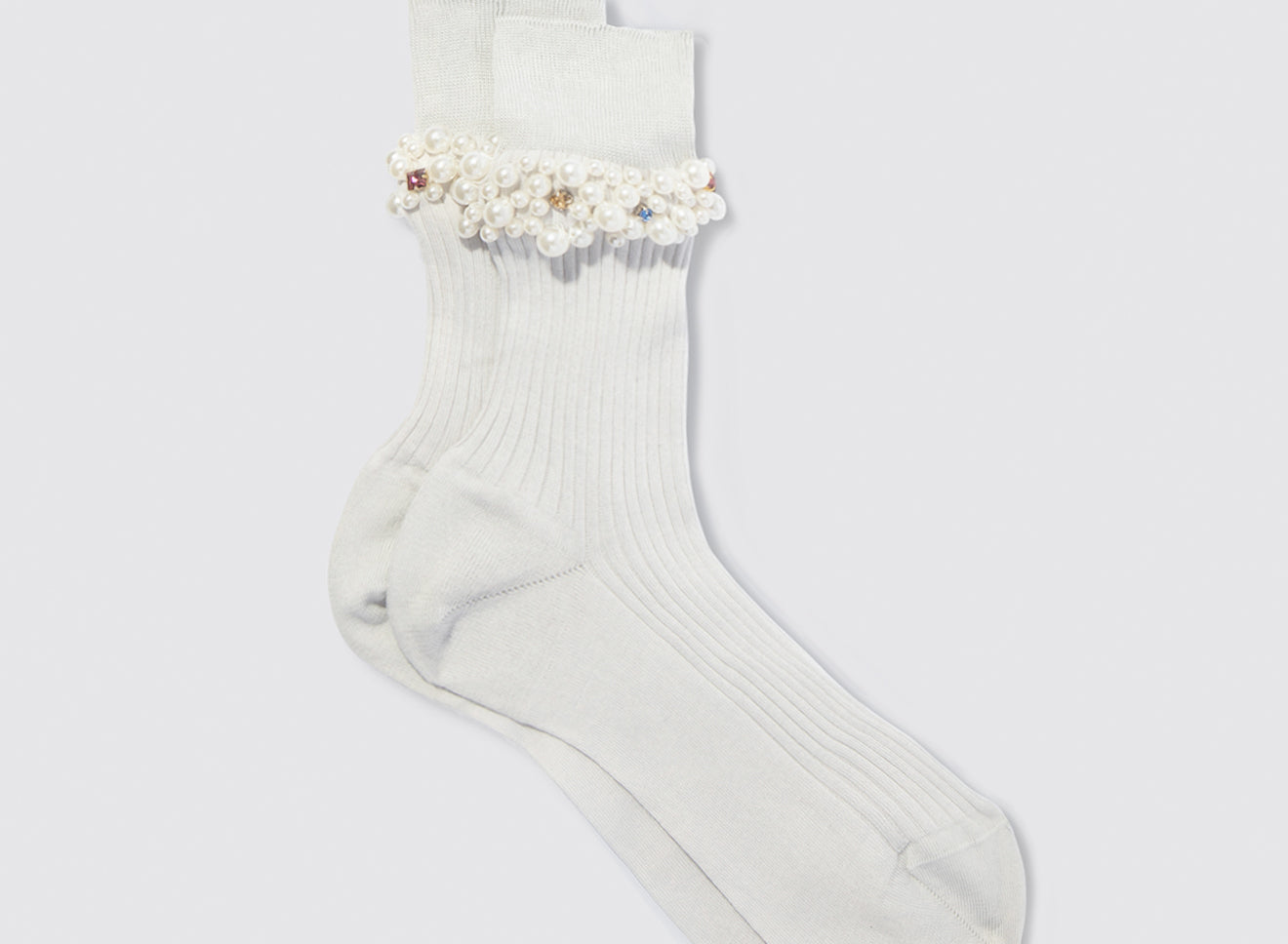 Socks made from soft, certified organic cotton, guaranteeing natural comfort and breathability all day long. The eco-friendly fabric is respectful of both the skin and the environment. The edge is decorated with exquisite hand-embroidered detailing, combining white pearls of varying sizes and a refined red crystal accent. Each sock is unique, a testament to the art of Italian craftsmanship. Perfect for special occasions or for those who enjoy discreetly standing out even in everyday life.