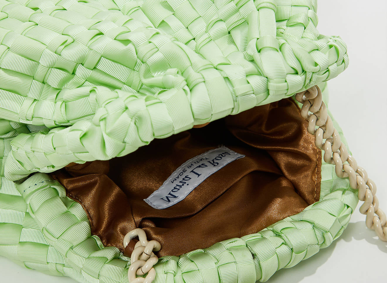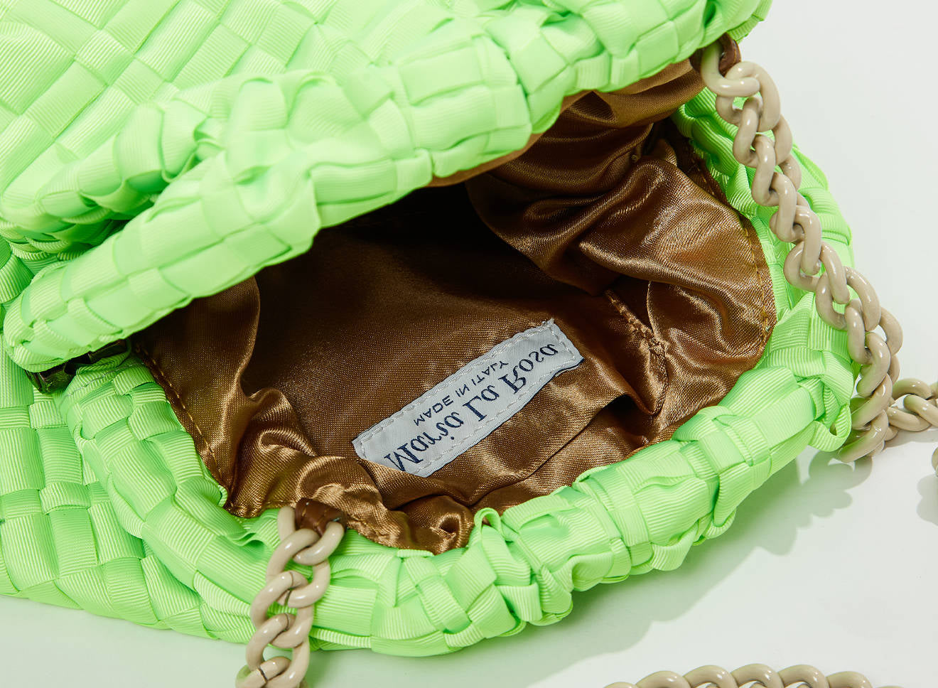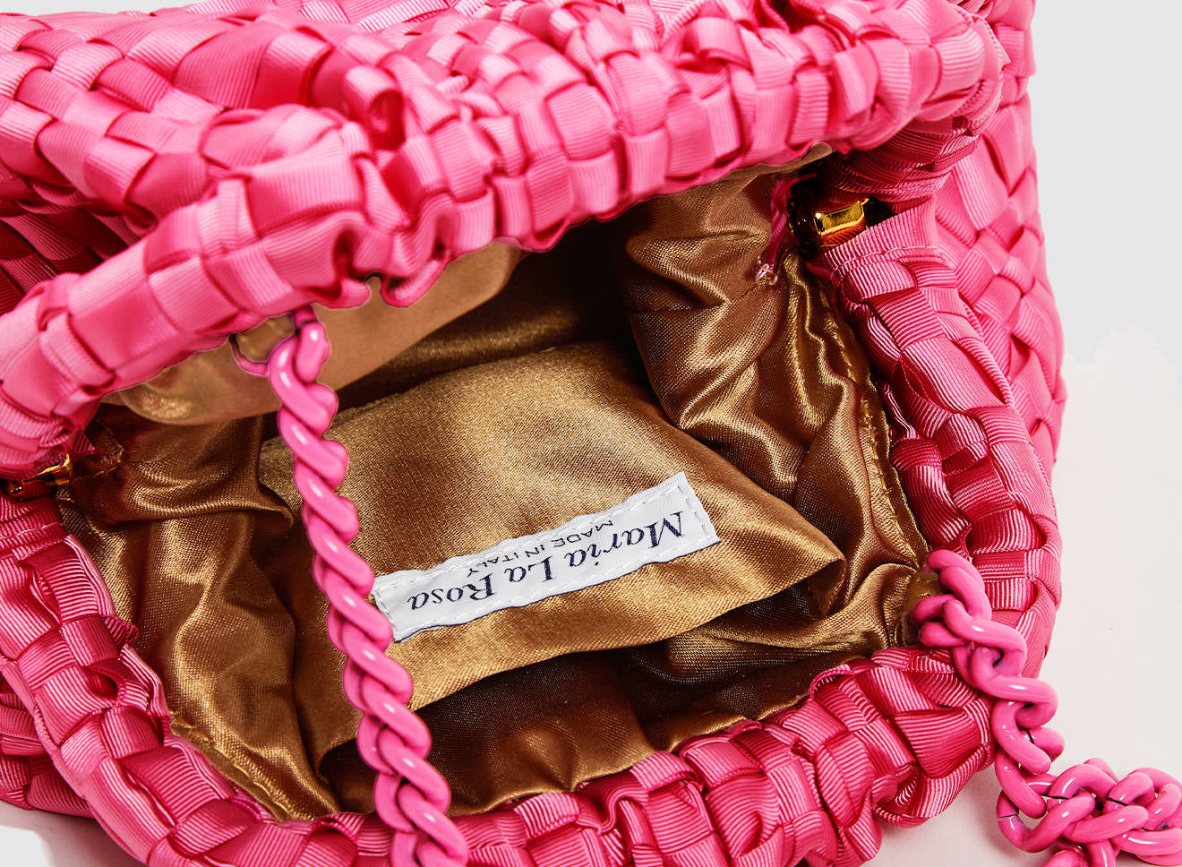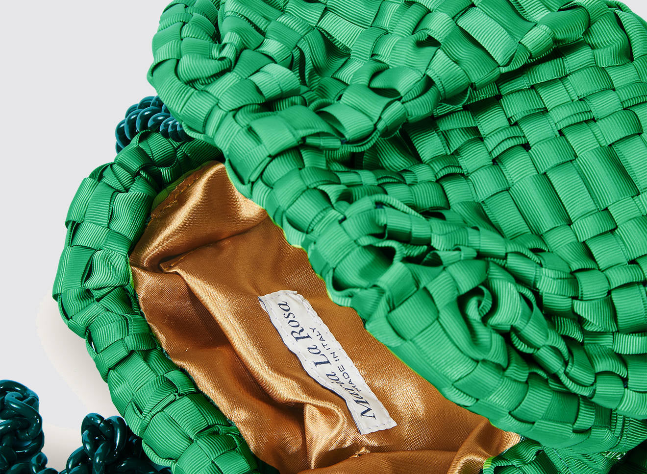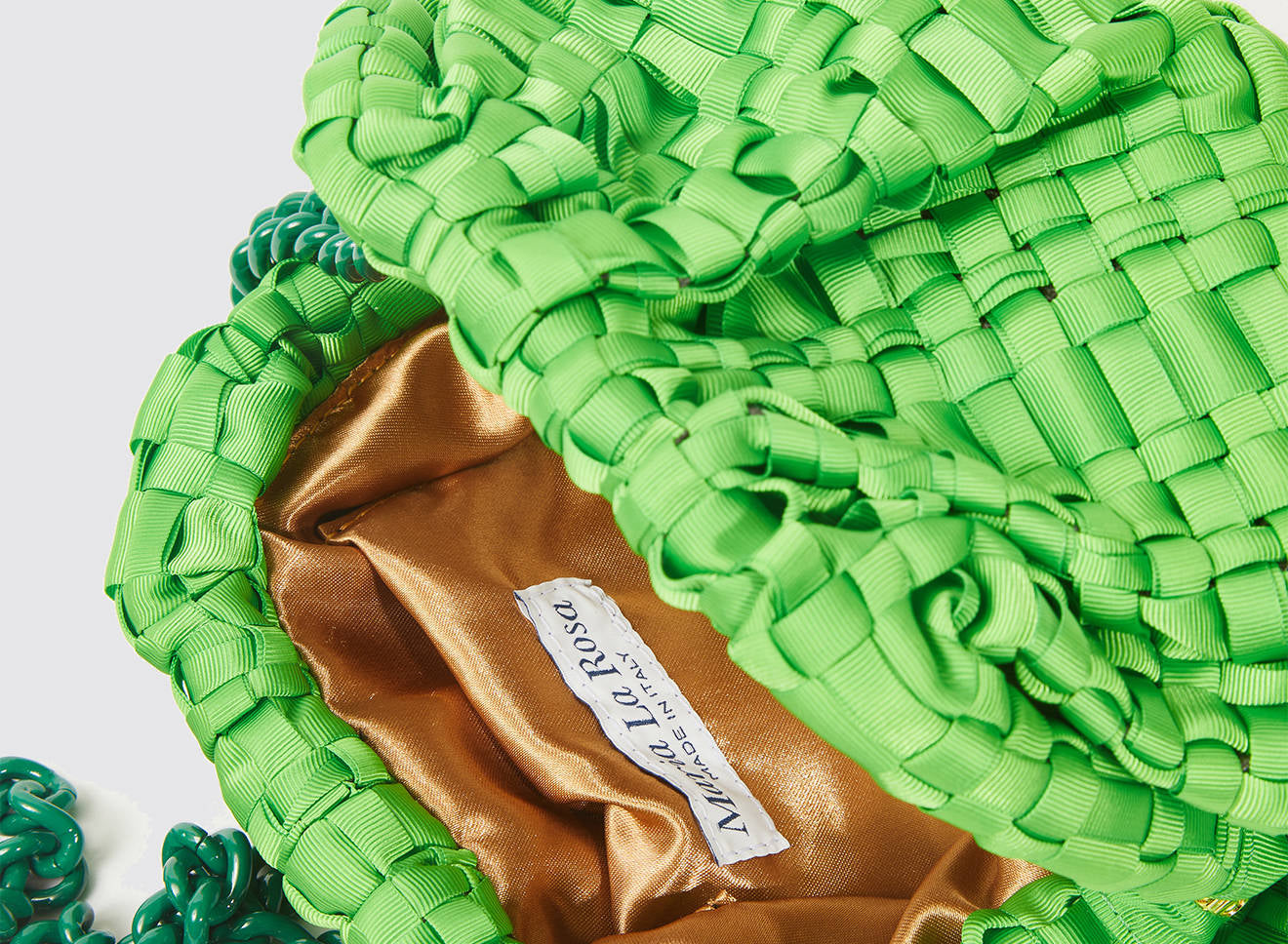 Small women's clutch in woven ribbon fabric, handmade on ancient looms. This unprecedented reduced version of the Maria La Rosa icon bag is roomy enough to carry the essentials with you. Perfect for all seasons, it is the emblem of a new metropolitan elegance. It is equipped with a ton sur ton chain to wear it even over the shoulder and there are many chromatic varieties to choose from: from natural to fluorescent shades, up to darker shades, such as forest green and black.