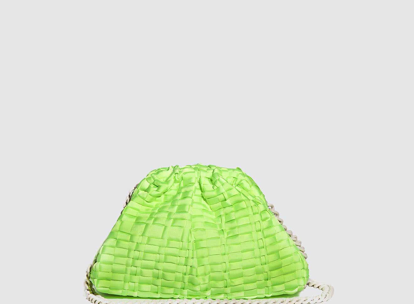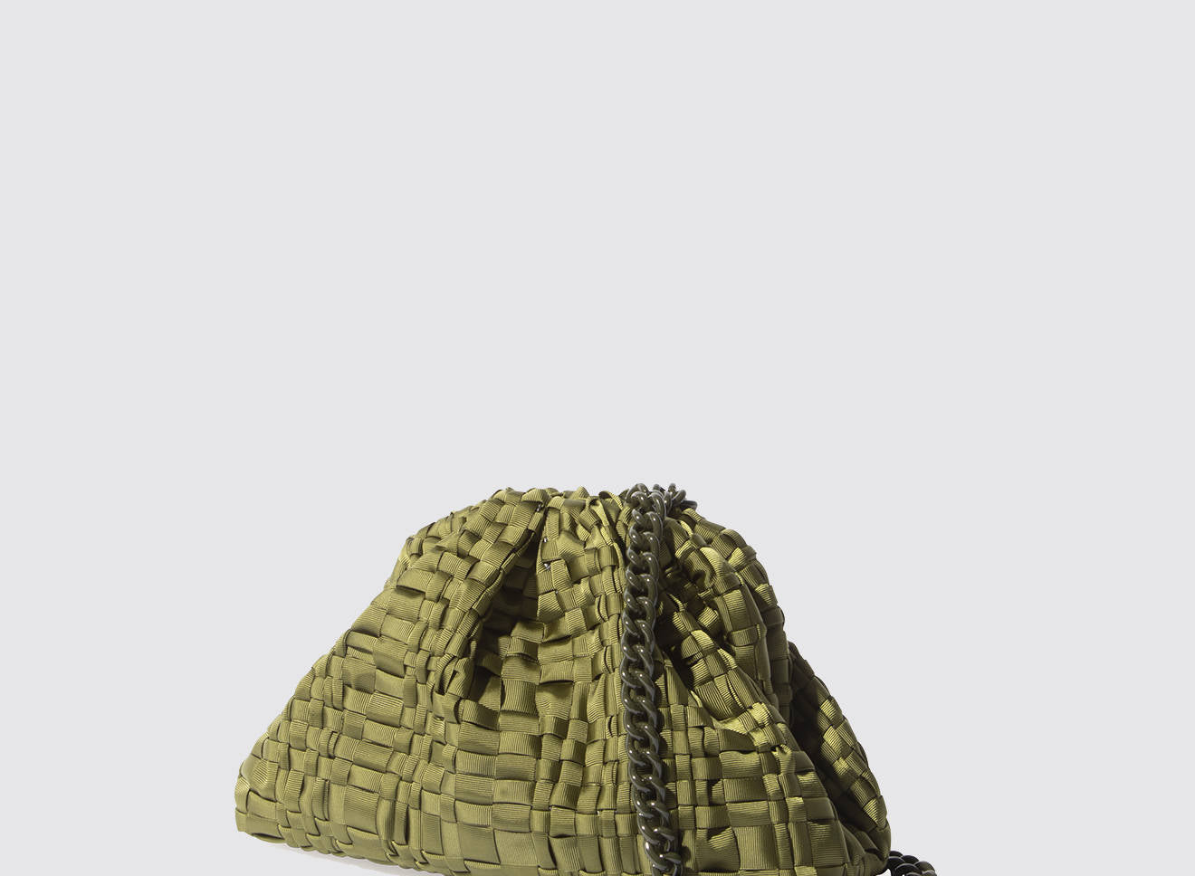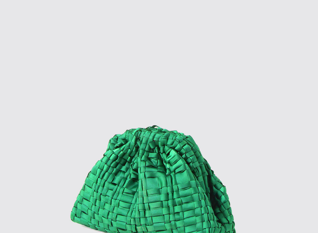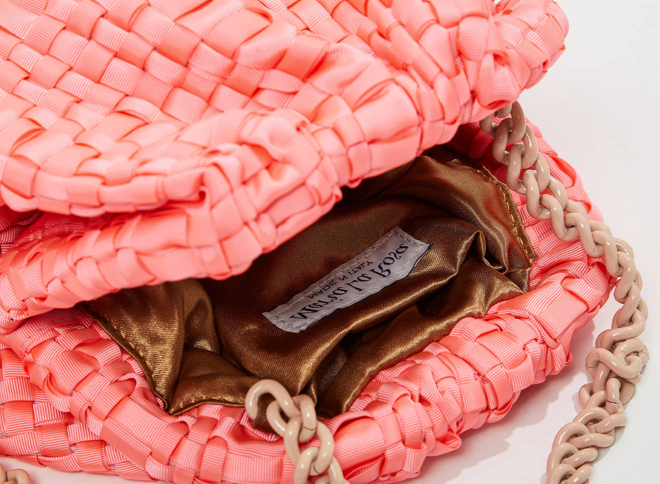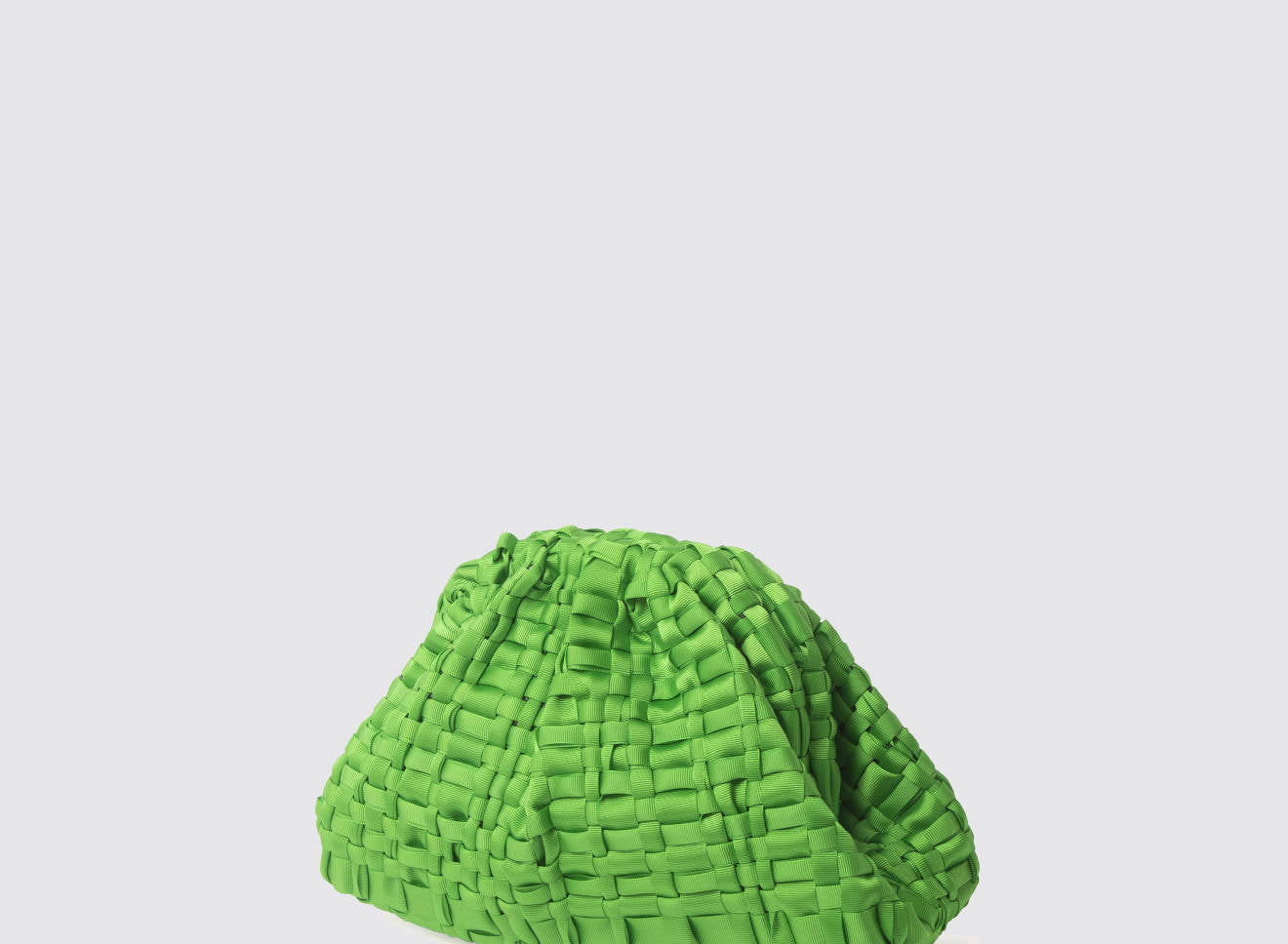 Small women's clutch in woven ribbon fabric, handmade on ancient looms. This unprecedented reduced version of the Maria La Rosa icon bag is roomy enough to carry the essentials with you. Perfect for all seasons, it is the emblem of a new metropolitan elegance. It is equipped with a ton sur ton chain to wear it even over the shoulder and there are many chromatic varieties to choose from: from natural to fluorescent shades, up to darker shades, such as forest green and black.