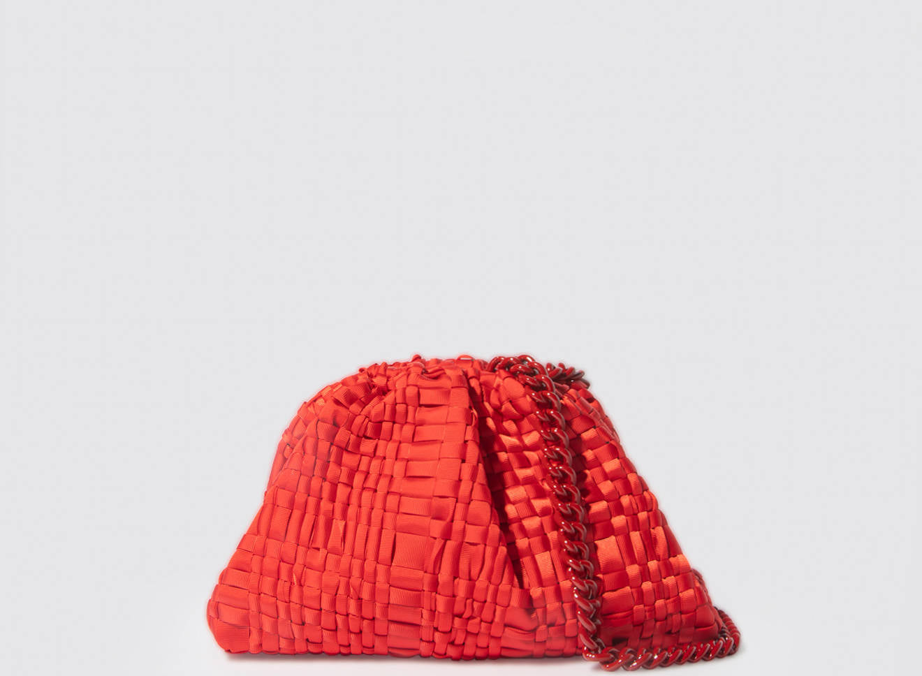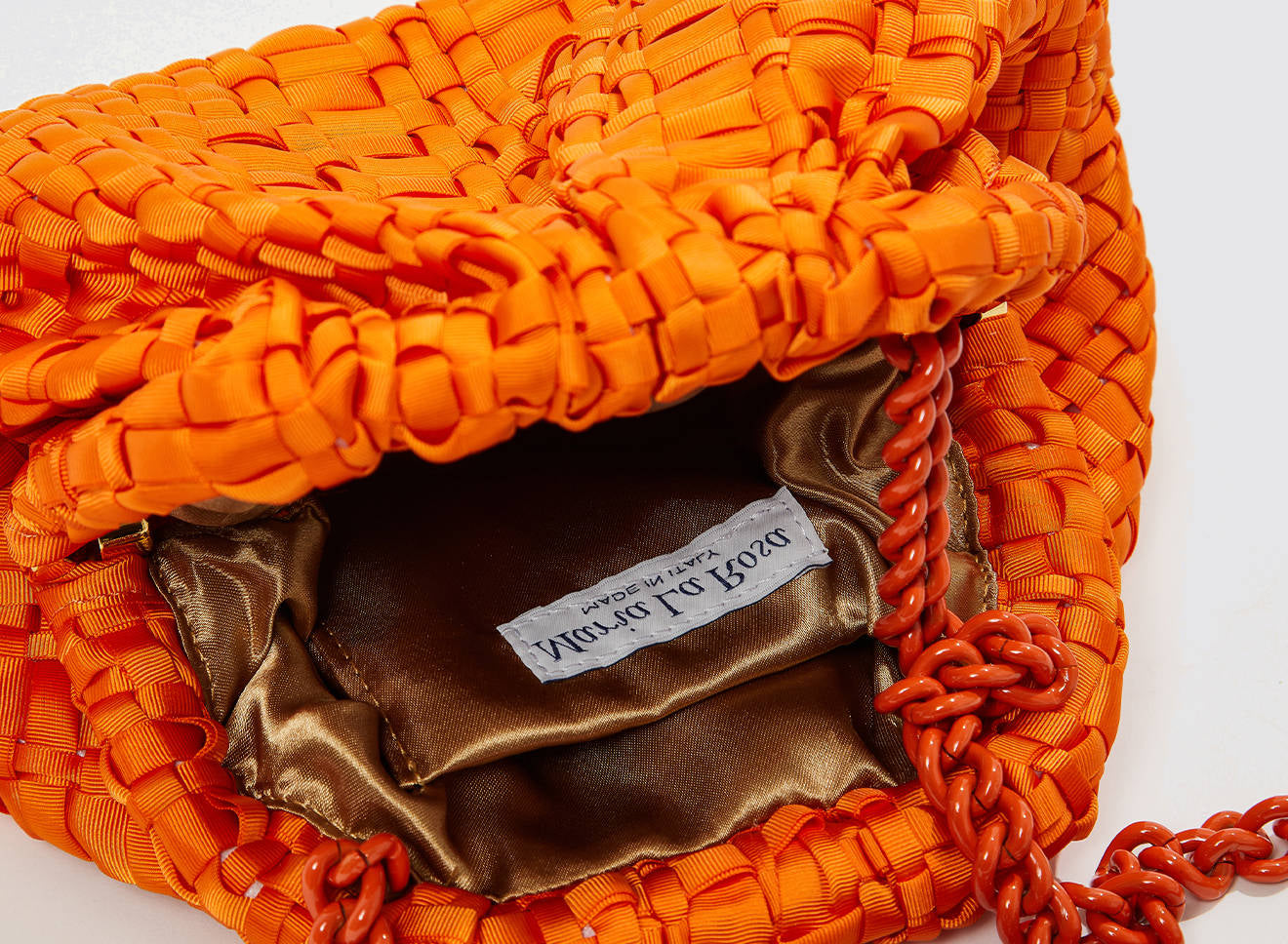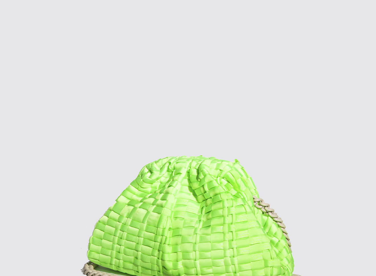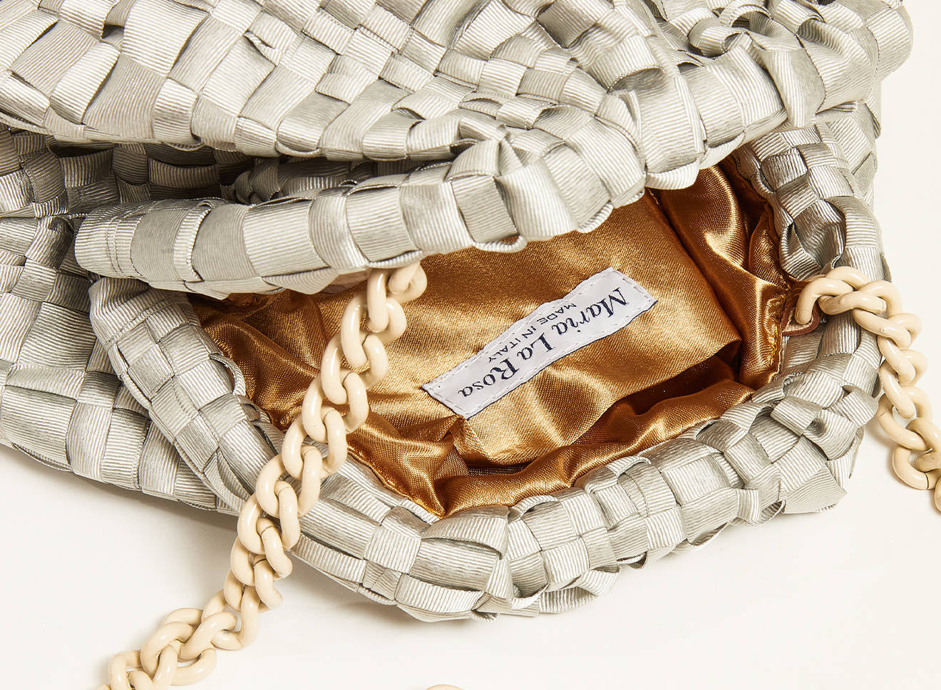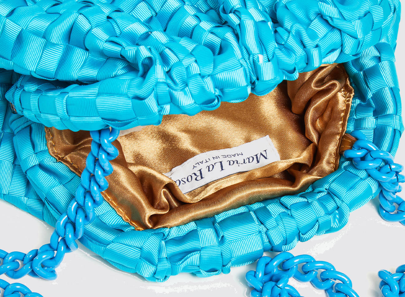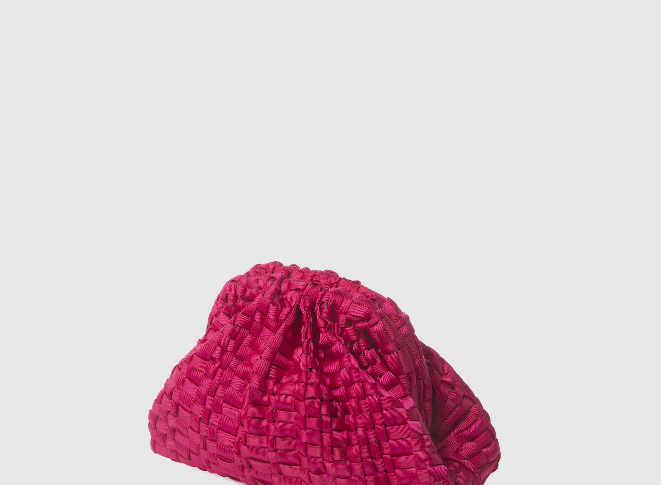 Small women's clutch in woven ribbon fabric, handmade on ancient looms. This unprecedented reduced version of the Maria La Rosa icon bag is roomy enough to carry the essentials with you. Perfect for all seasons, it is the emblem of a new metropolitan elegance. It is equipped with a ton sur ton chain to wear it even over the shoulder and there are many chromatic varieties to choose from: from natural to fluorescent shades, up to darker shades, such as forest green and black.