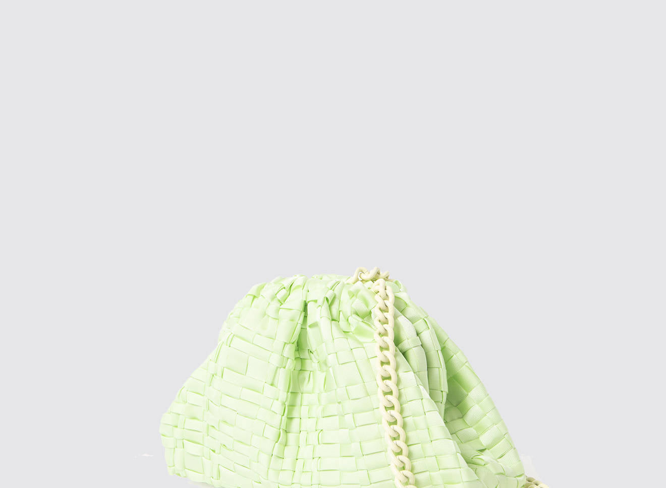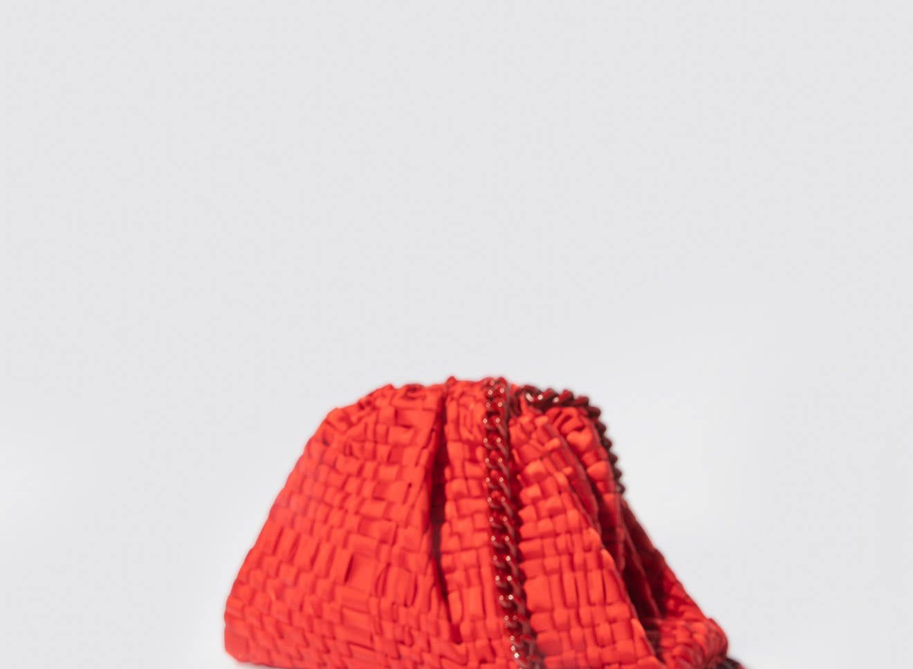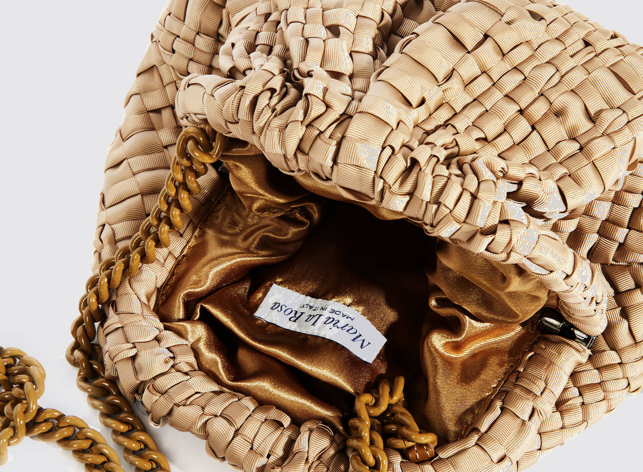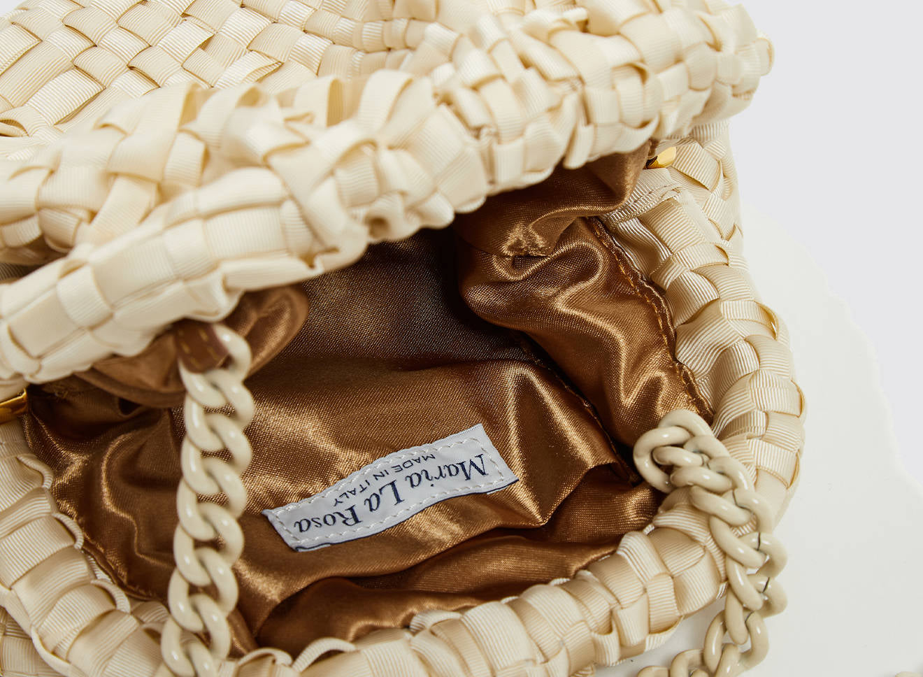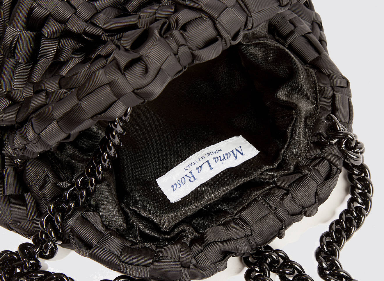 Small women's clutch in woven ribbon fabric, handmade on ancient looms. This unprecedented reduced version of the Maria La Rosa icon bag is roomy enough to carry the essentials with you. Perfect for all seasons, it is the emblem of a new metropolitan elegance. It is equipped with a ton sur ton chain to wear it even over the shoulder and there are many chromatic varieties to choose from: from natural to fluorescent shades, up to darker shades, such as forest green and black.