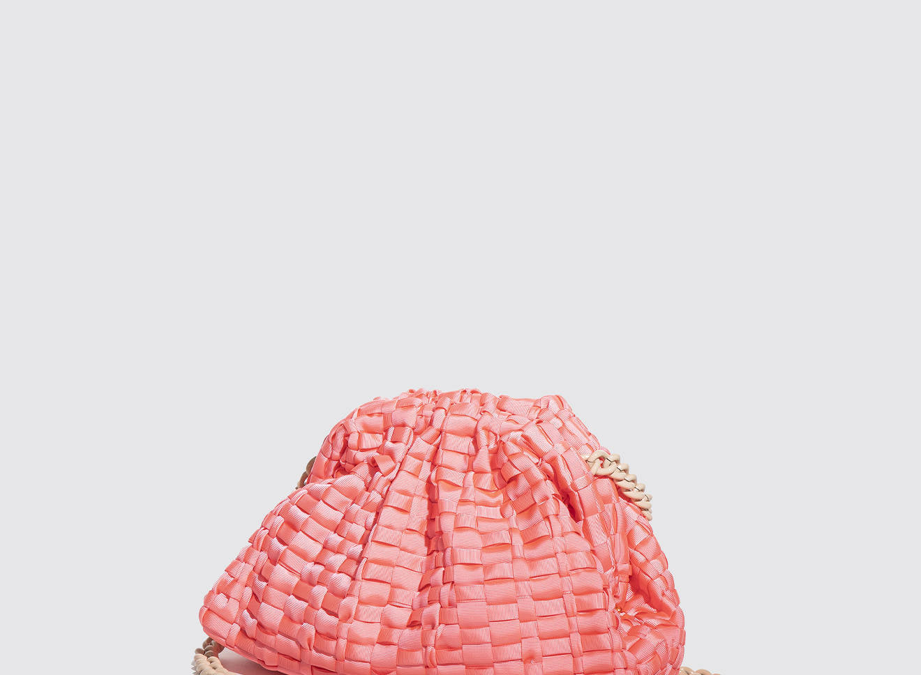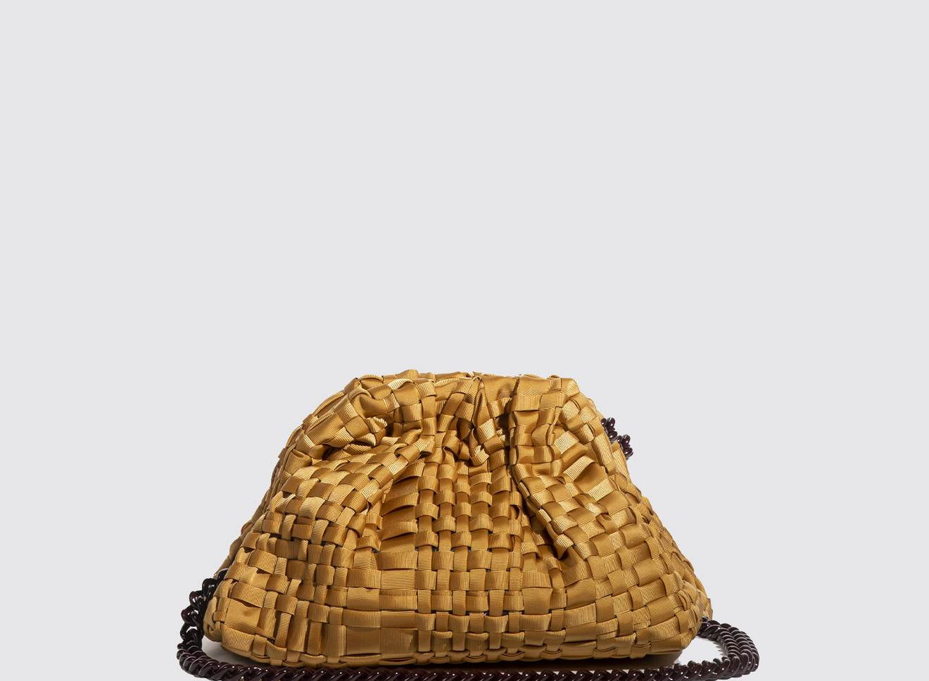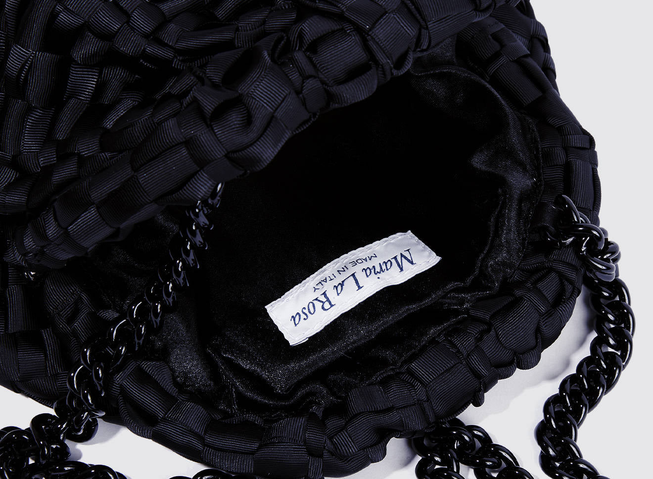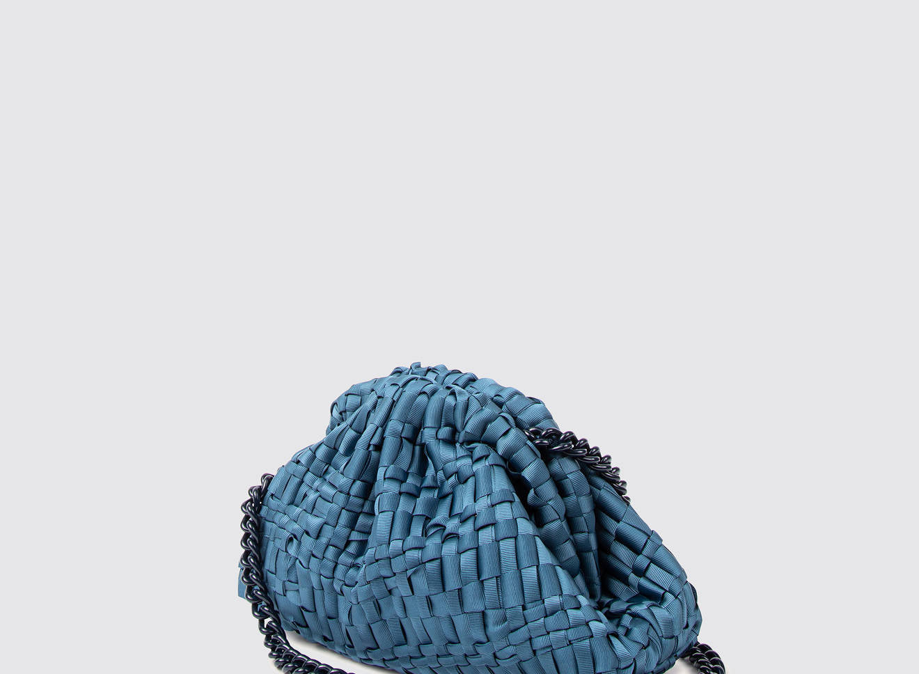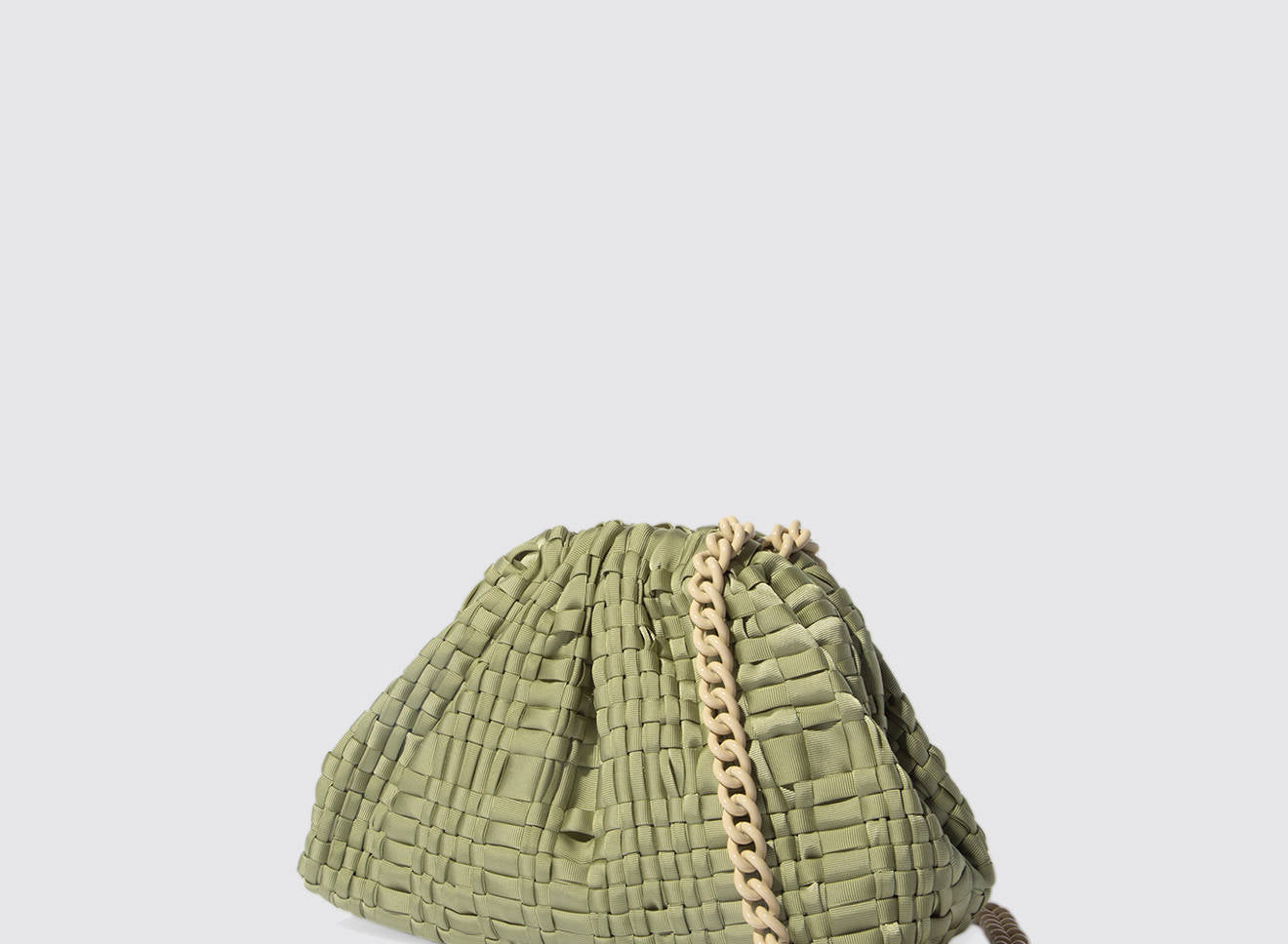 Small women's clutch in woven ribbon fabric, handmade on ancient looms. This unprecedented reduced version of the Maria La Rosa icon bag is roomy enough to carry the essentials with you. Perfect for all seasons, it is the emblem of a new metropolitan elegance. It is equipped with a ton sur ton chain to wear it even over the shoulder and there are many chromatic varieties to choose from: from natural to fluorescent shades, up to darker shades, such as forest green and black.