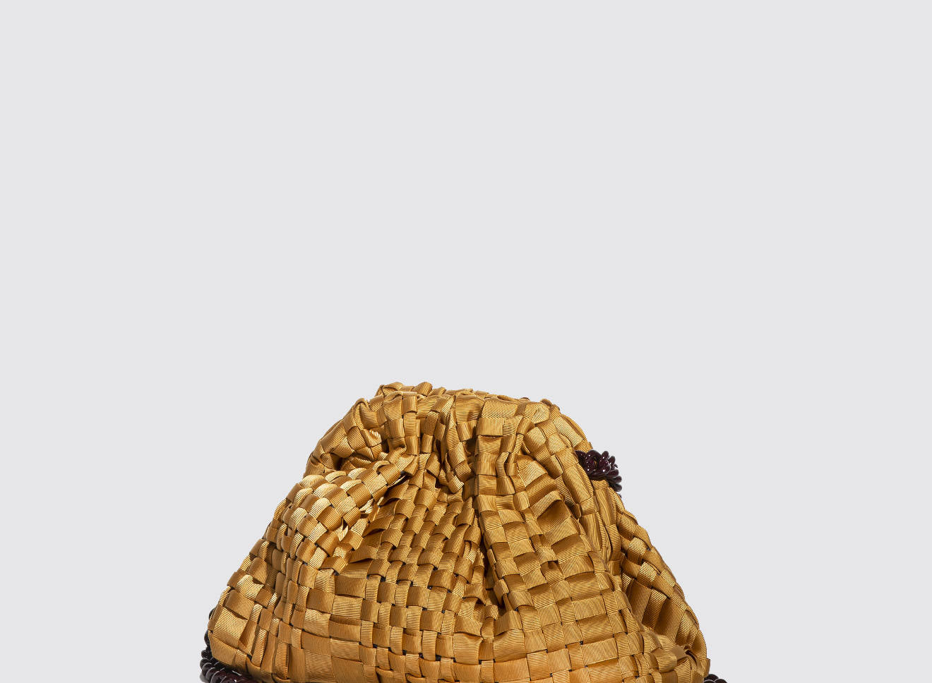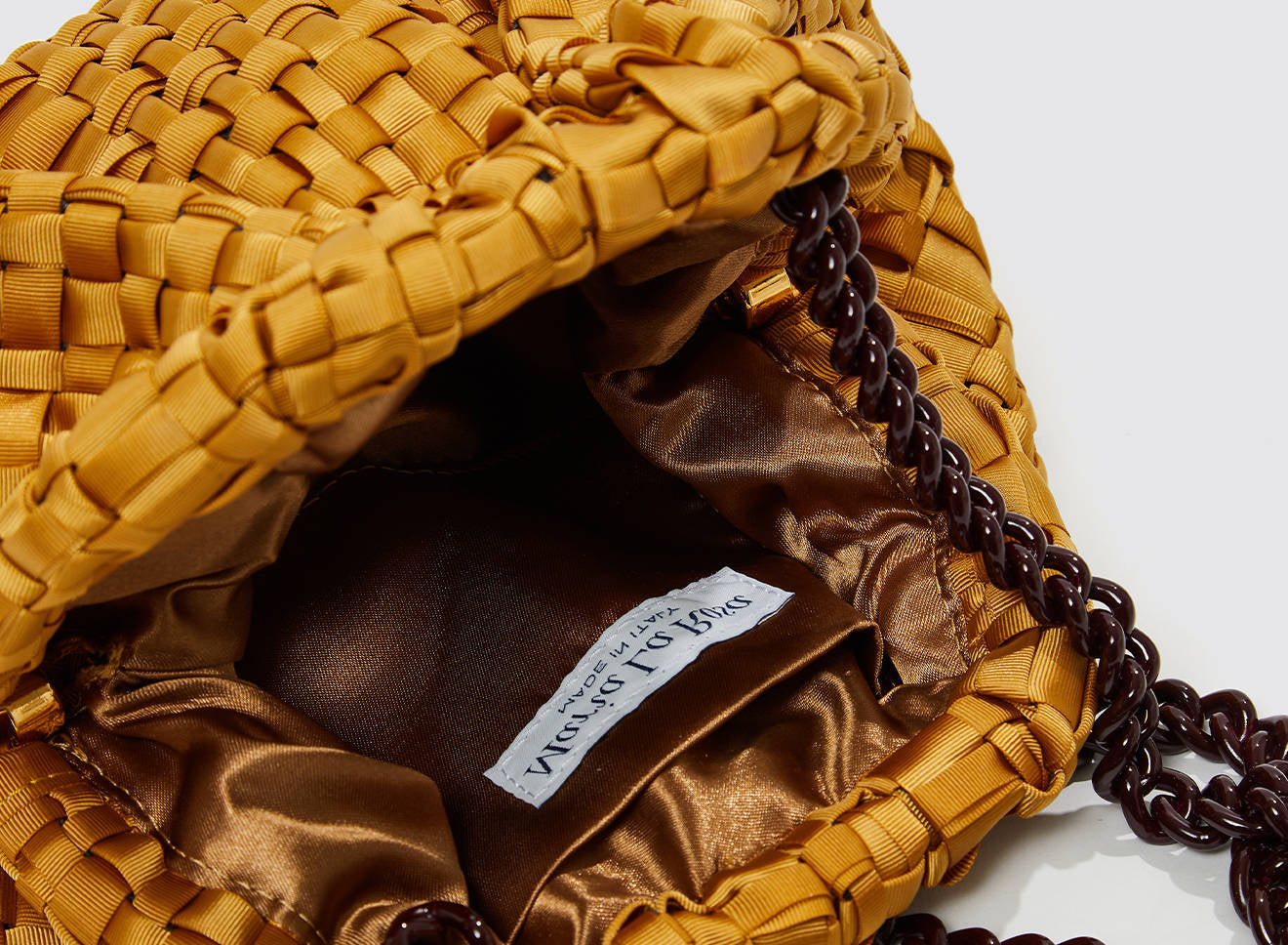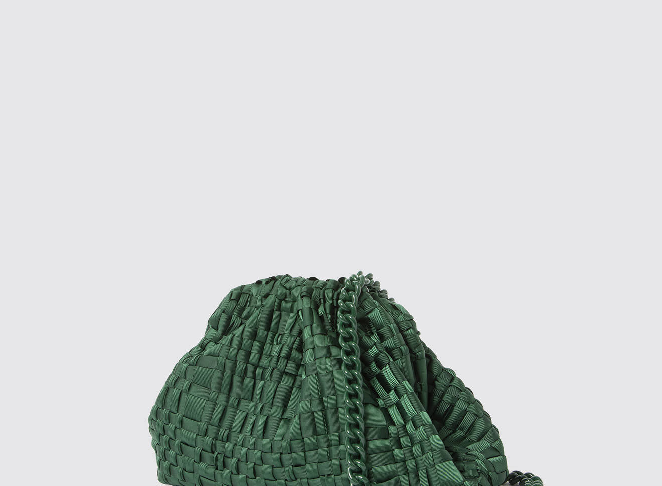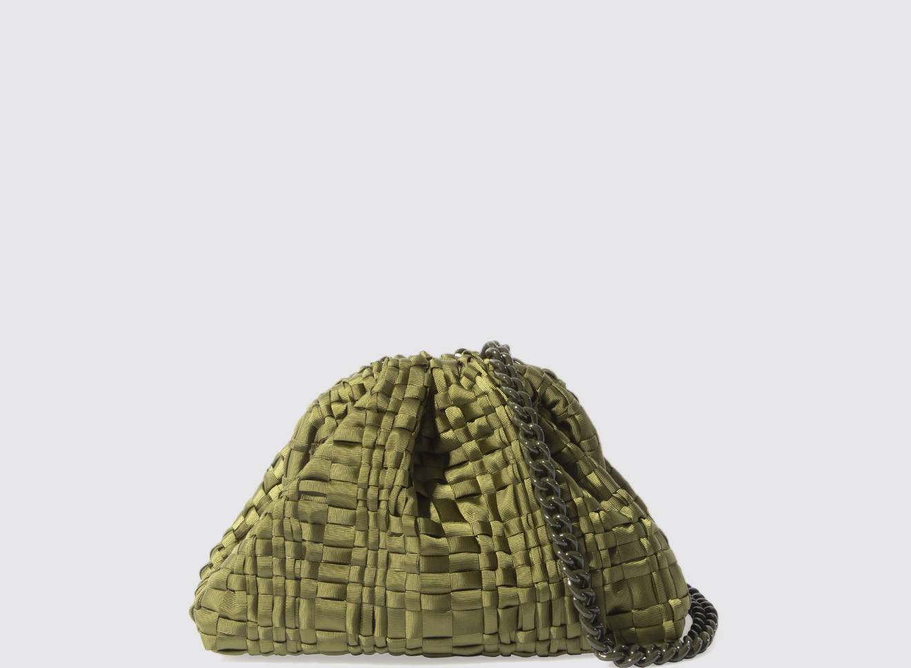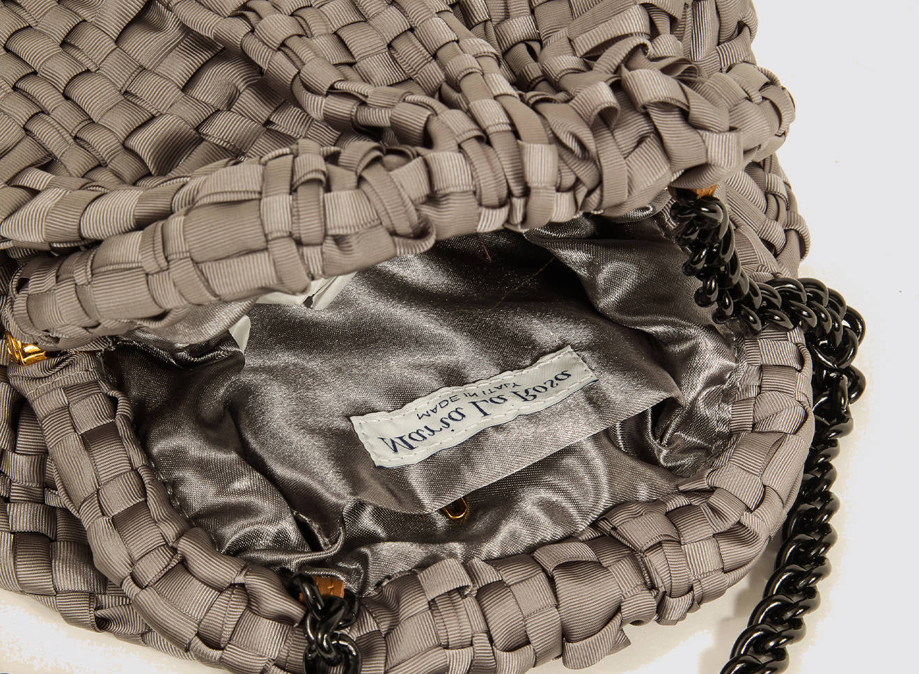 Small women's clutch in woven ribbon fabric, handmade on ancient looms. This unprecedented reduced version of the Maria La Rosa icon bag is roomy enough to carry the essentials with you. Perfect for all seasons, it is the emblem of a new metropolitan elegance. It is equipped with a ton sur ton chain to wear it even over the shoulder and there are many chromatic varieties to choose from: from natural to fluorescent shades, up to darker shades, such as forest green and black.