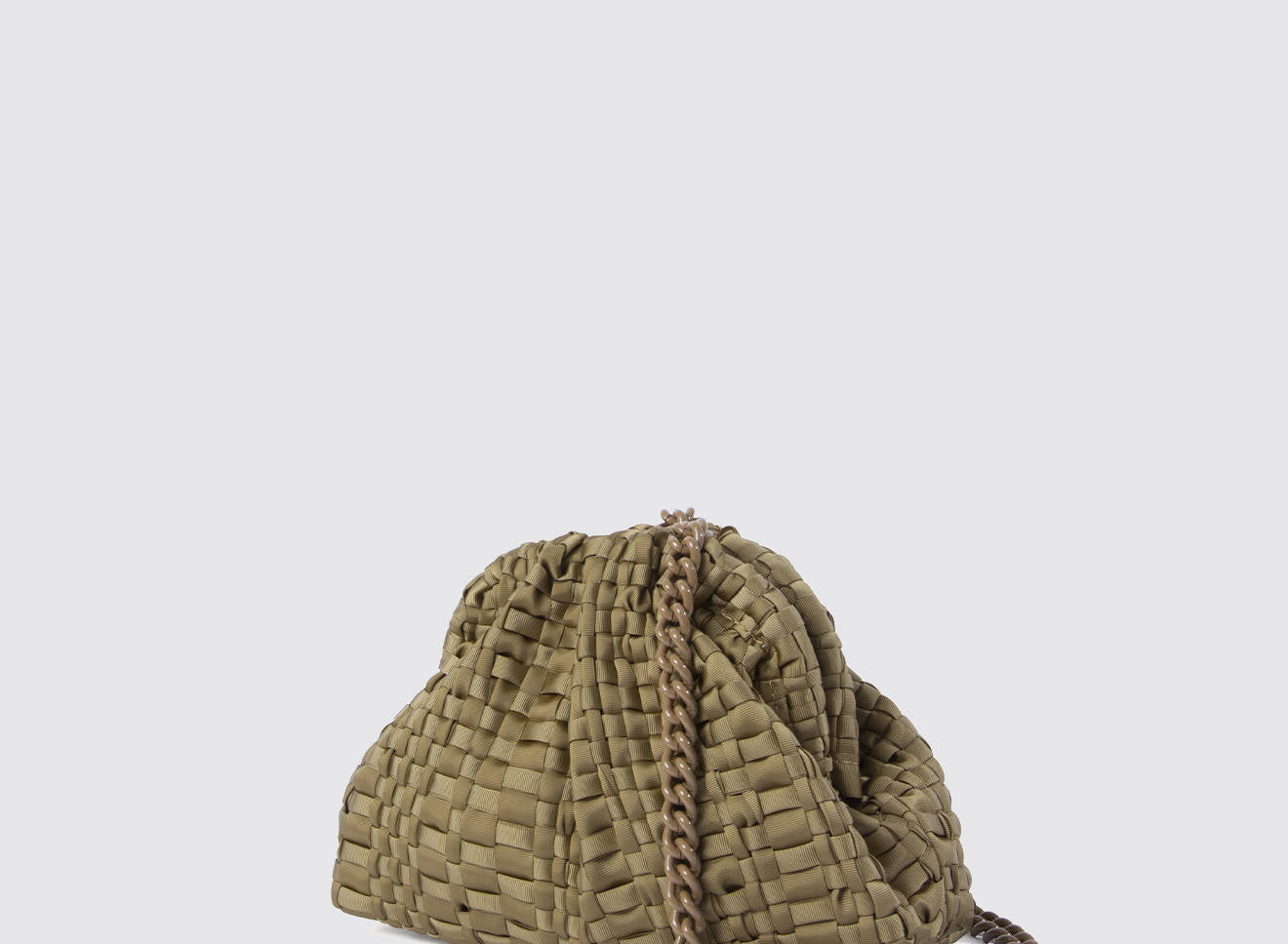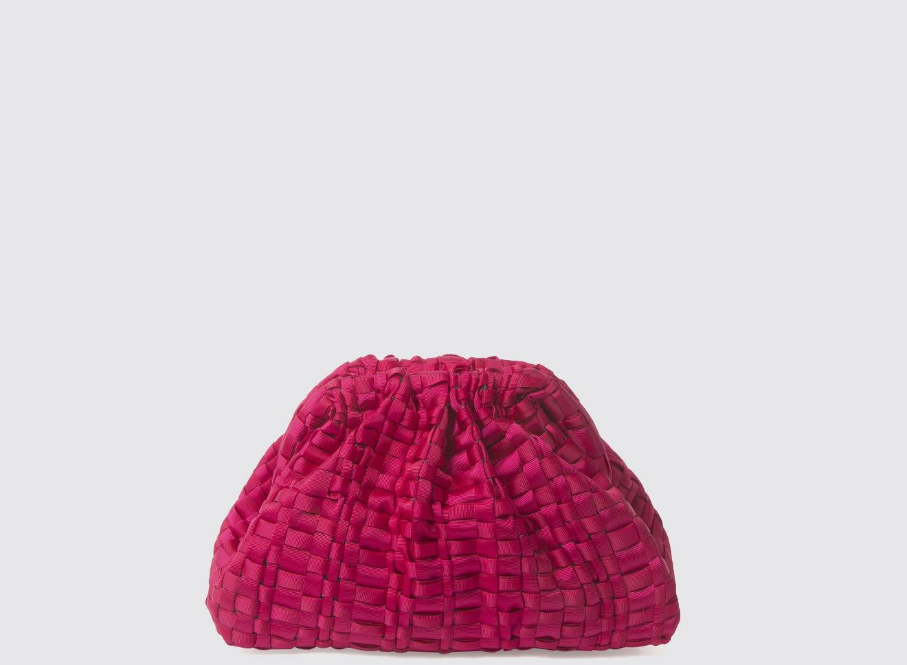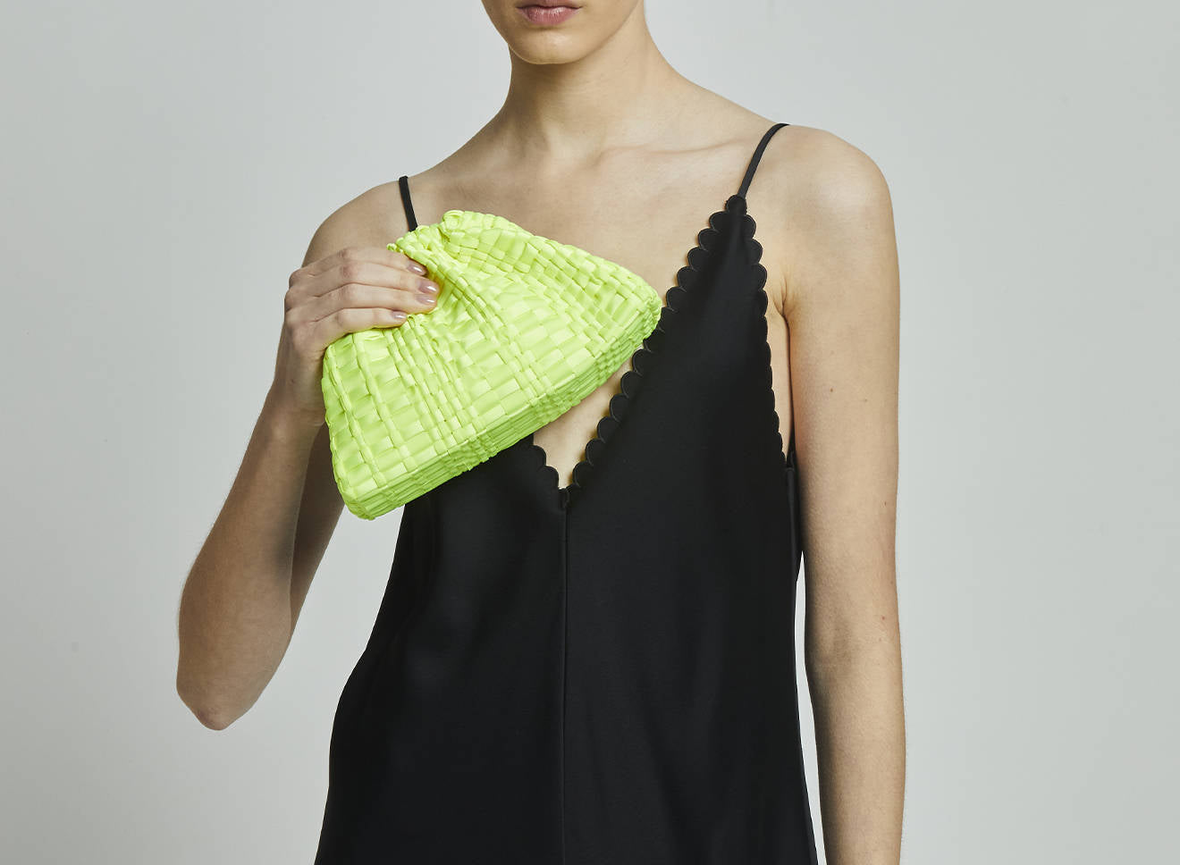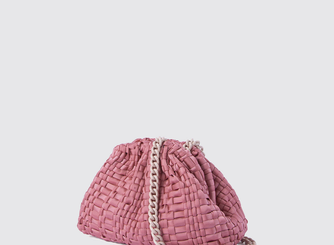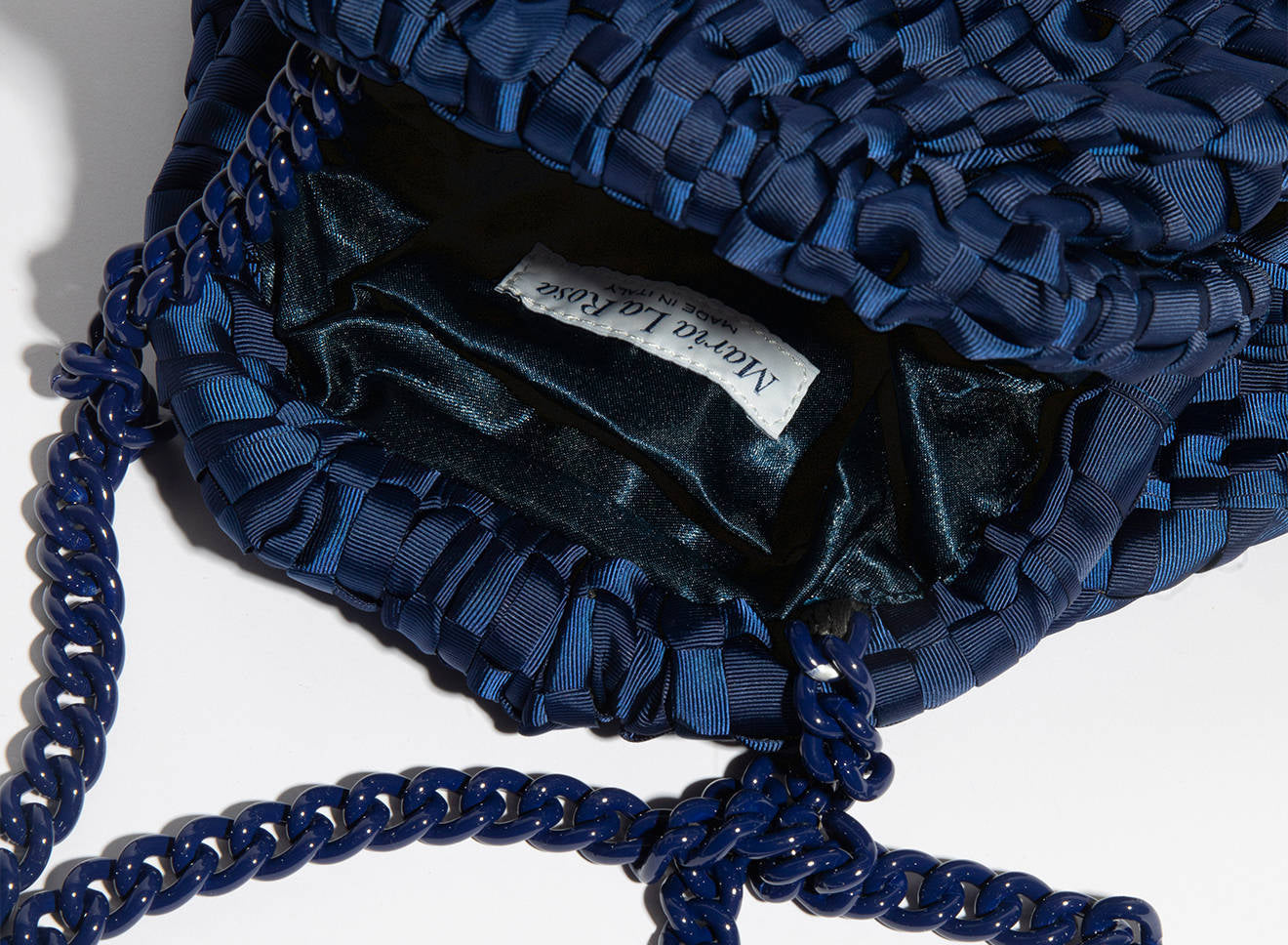 Small women's clutch in woven ribbon fabric, handmade on ancient looms. This unprecedented reduced version of the Maria La Rosa icon bag is roomy enough to carry the essentials with you. Perfect for all seasons, it is the emblem of a new metropolitan elegance. It is equipped with a ton sur ton chain to wear it even over the shoulder and there are many chromatic varieties to choose from: from natural to fluorescent shades, up to darker shades, such as forest green and black.
