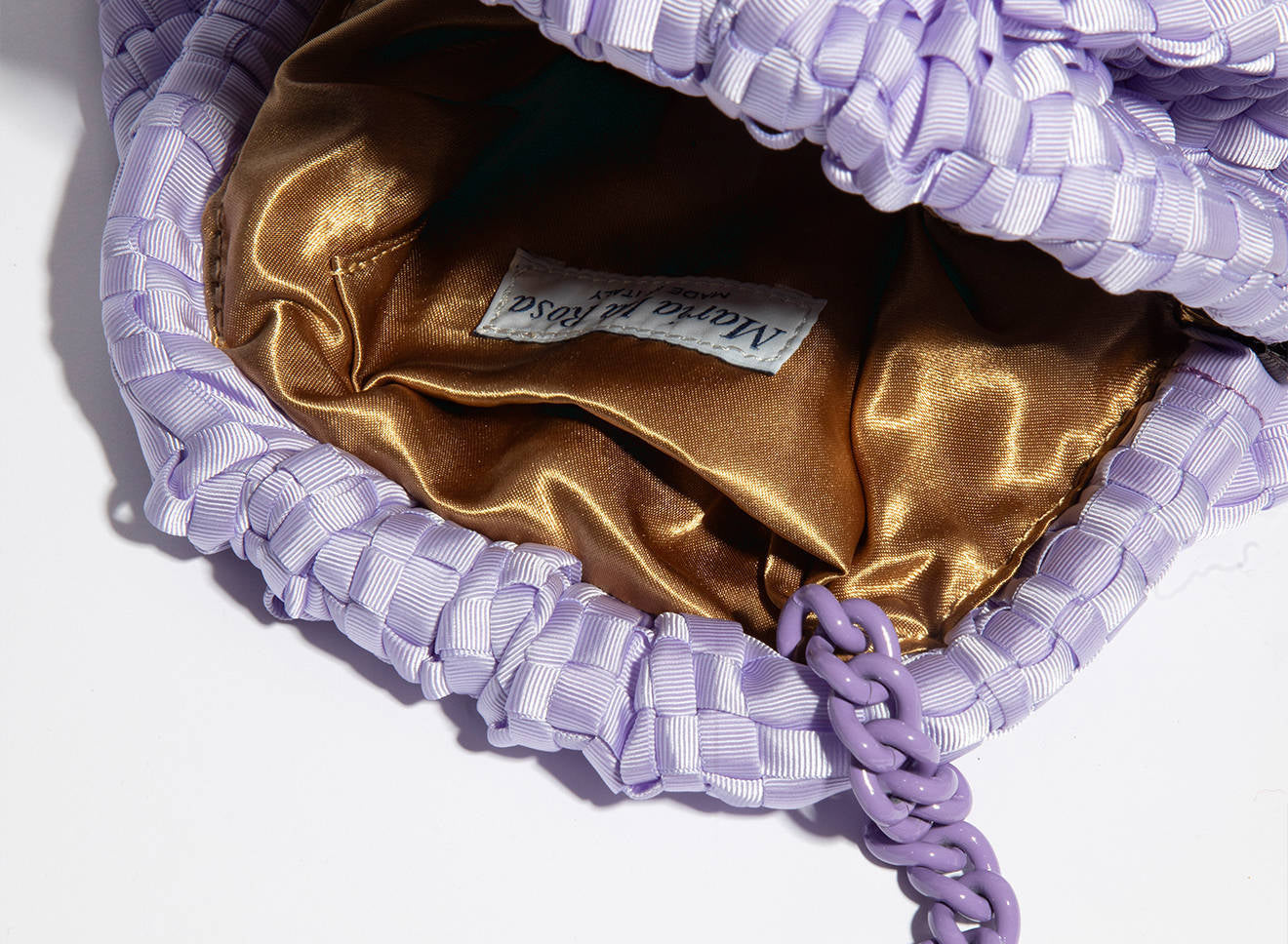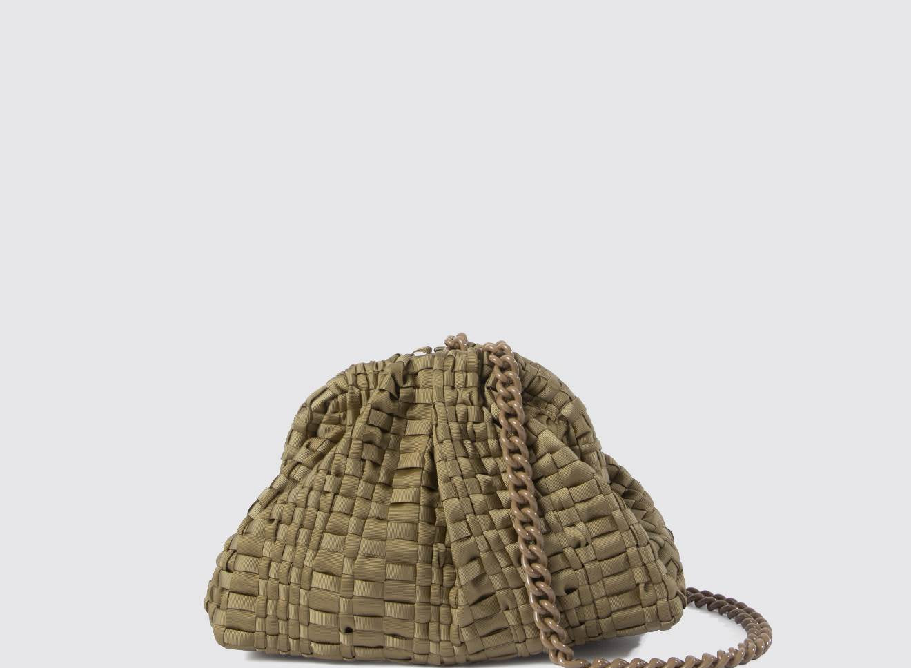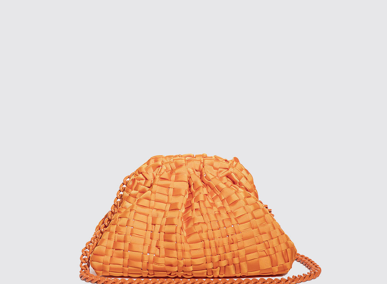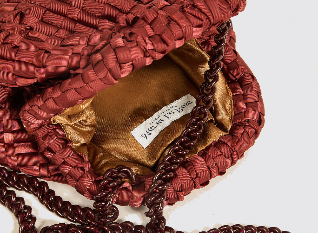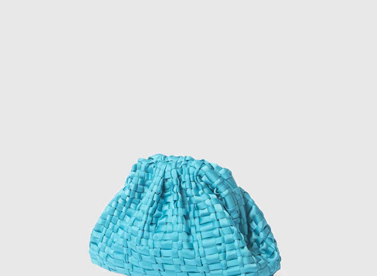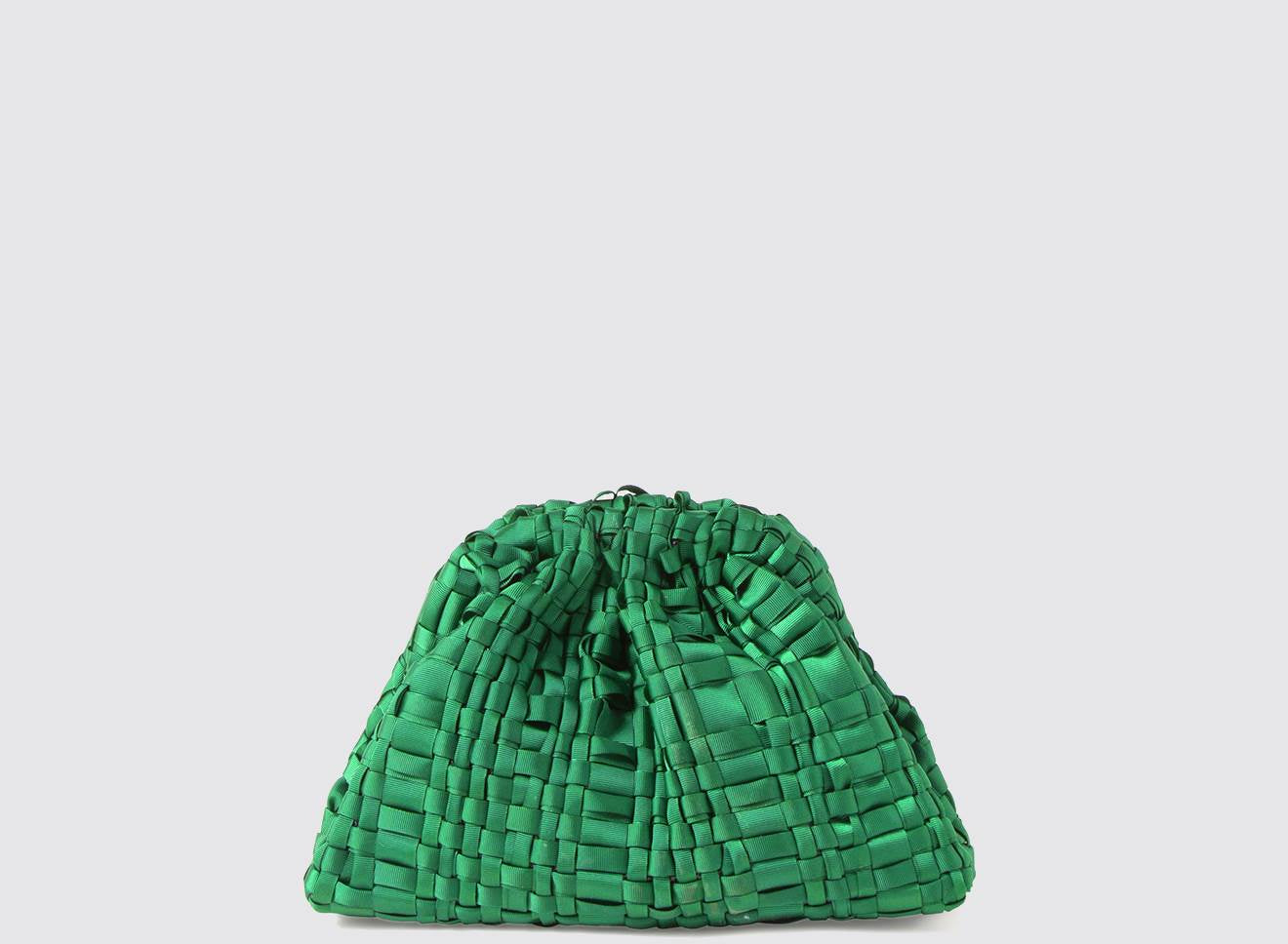 Small women's clutch in woven ribbon fabric, handmade on ancient looms. This unprecedented reduced version of the Maria La Rosa icon bag is roomy enough to carry the essentials with you. Perfect for all seasons, it is the emblem of a new metropolitan elegance. It is equipped with a ton sur ton chain to wear it even over the shoulder and there are many chromatic varieties to choose from: from natural to fluorescent shades, up to darker shades, such as forest green and black.