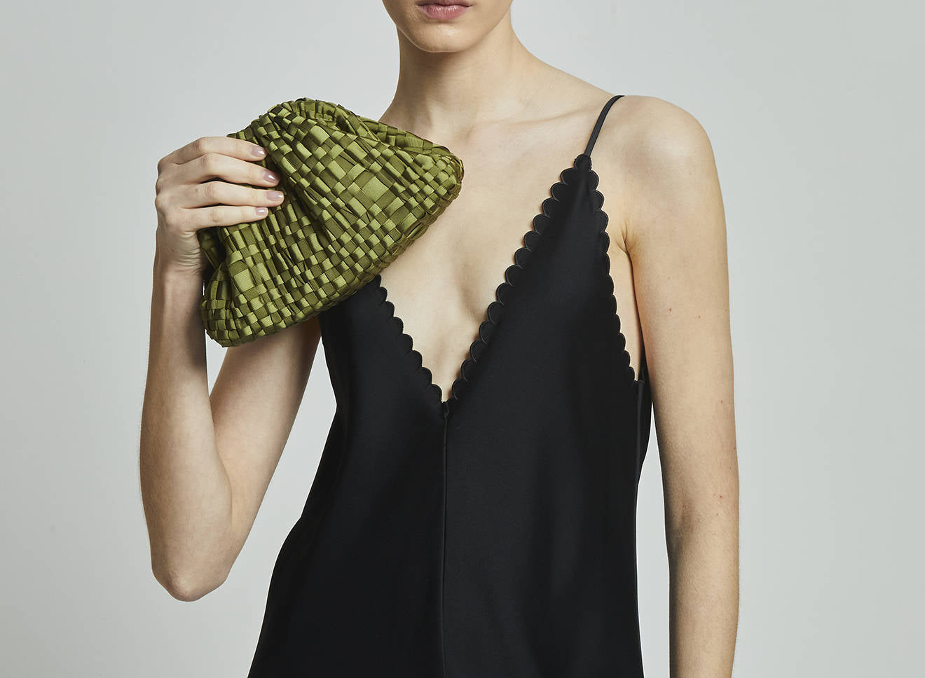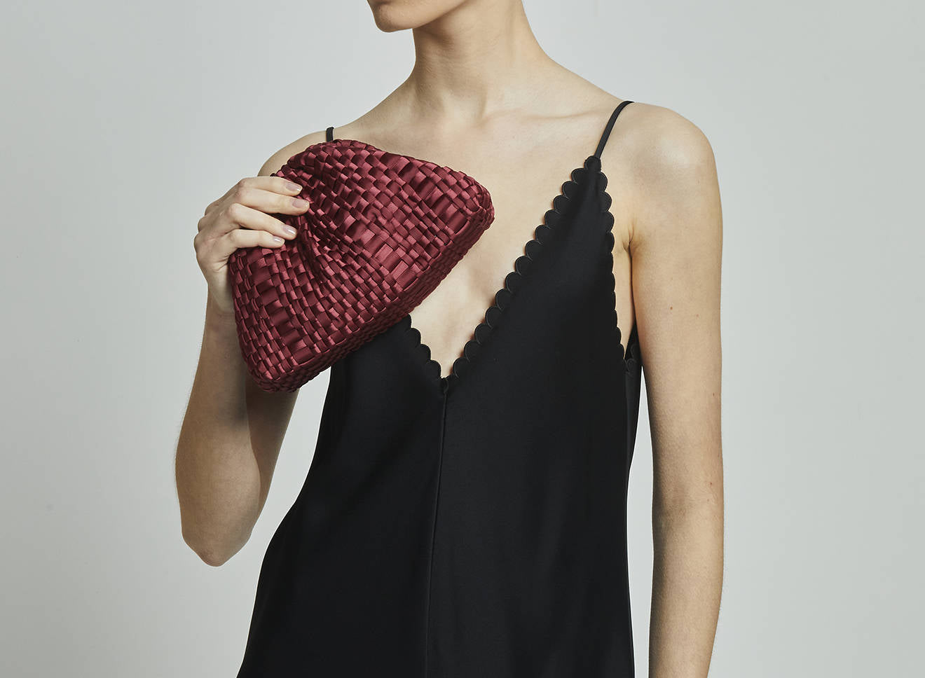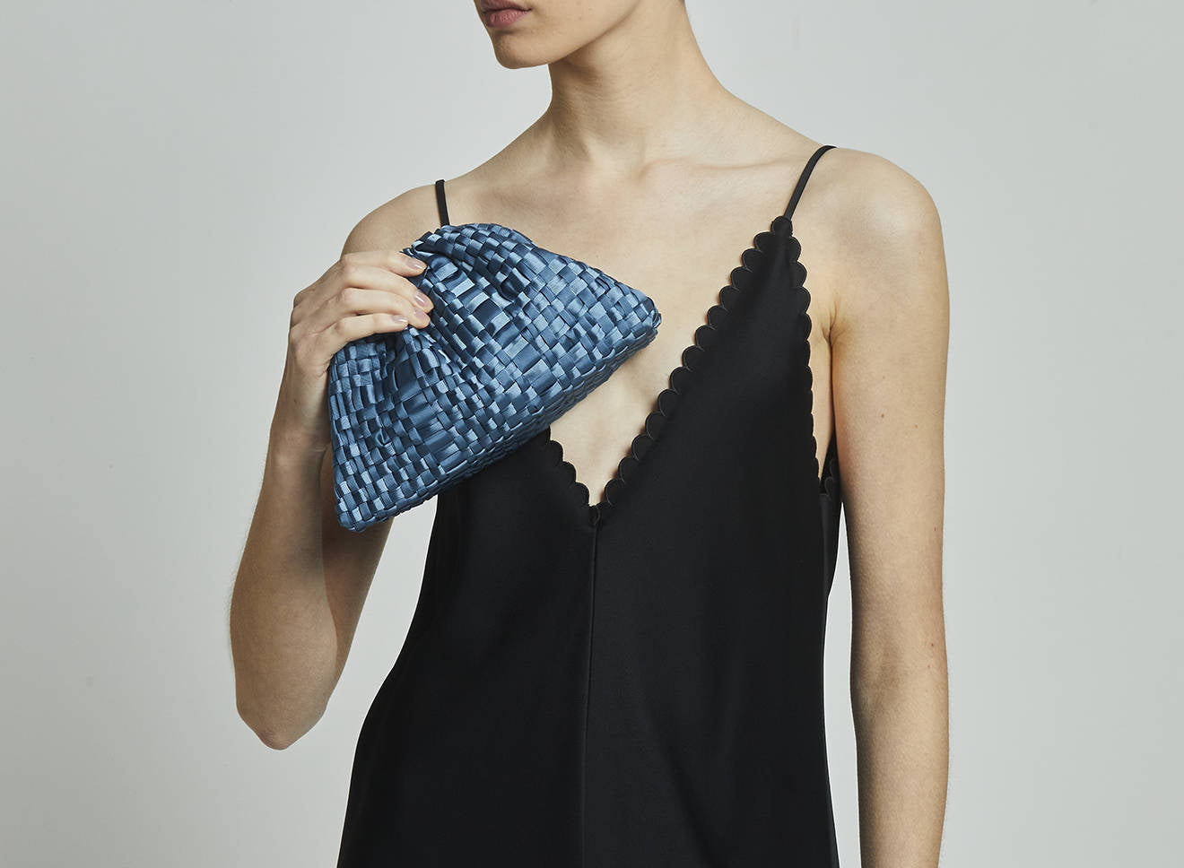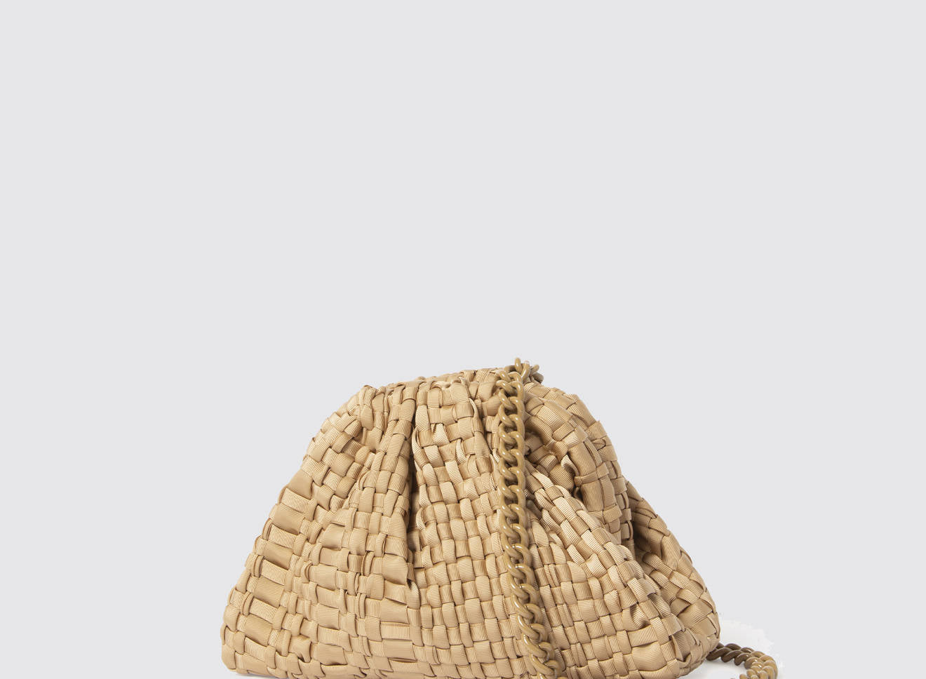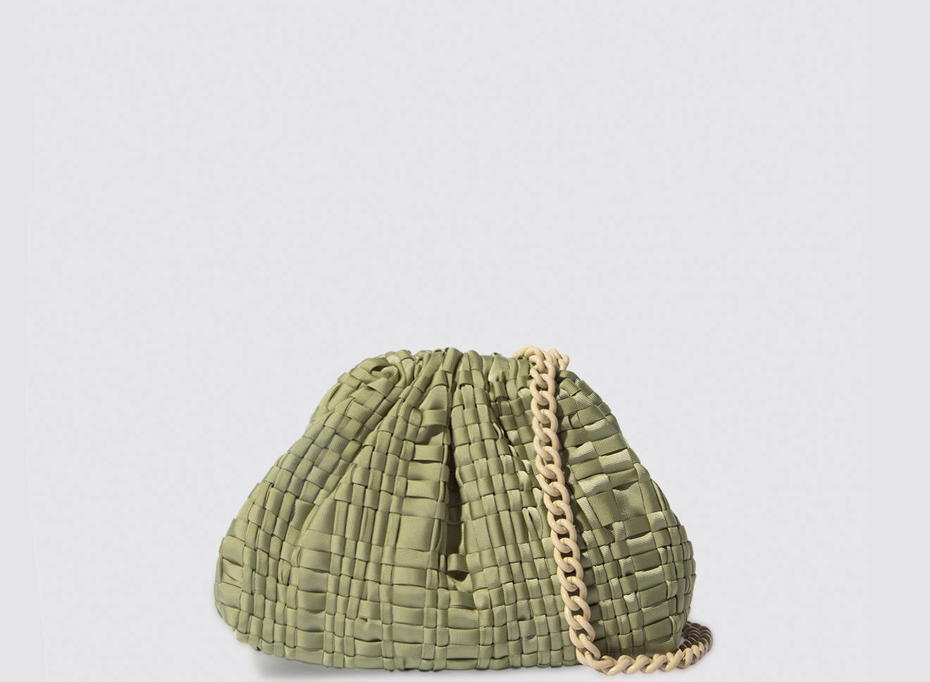 Small women's clutch in woven ribbon fabric, handmade on ancient looms. This unprecedented reduced version of the Maria La Rosa icon bag is roomy enough to carry the essentials with you. Perfect for all seasons, it is the emblem of a new metropolitan elegance. It is equipped with a ton sur ton chain to wear it even over the shoulder and there are many chromatic varieties to choose from: from natural to fluorescent shades, up to darker shades, such as forest green and black.