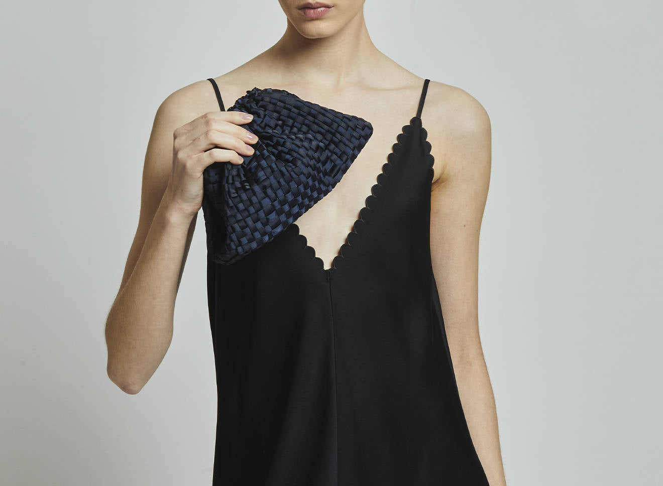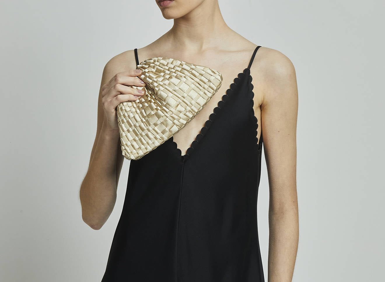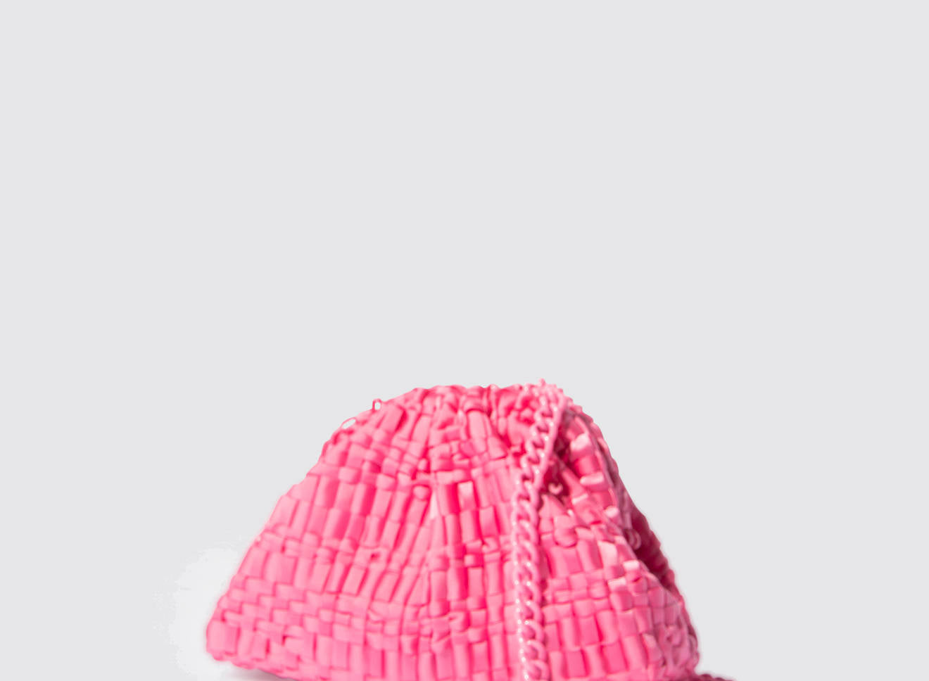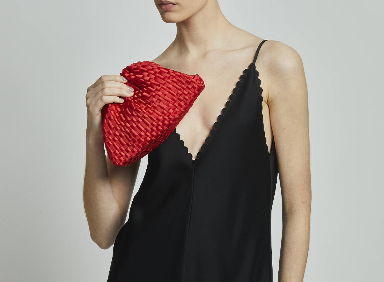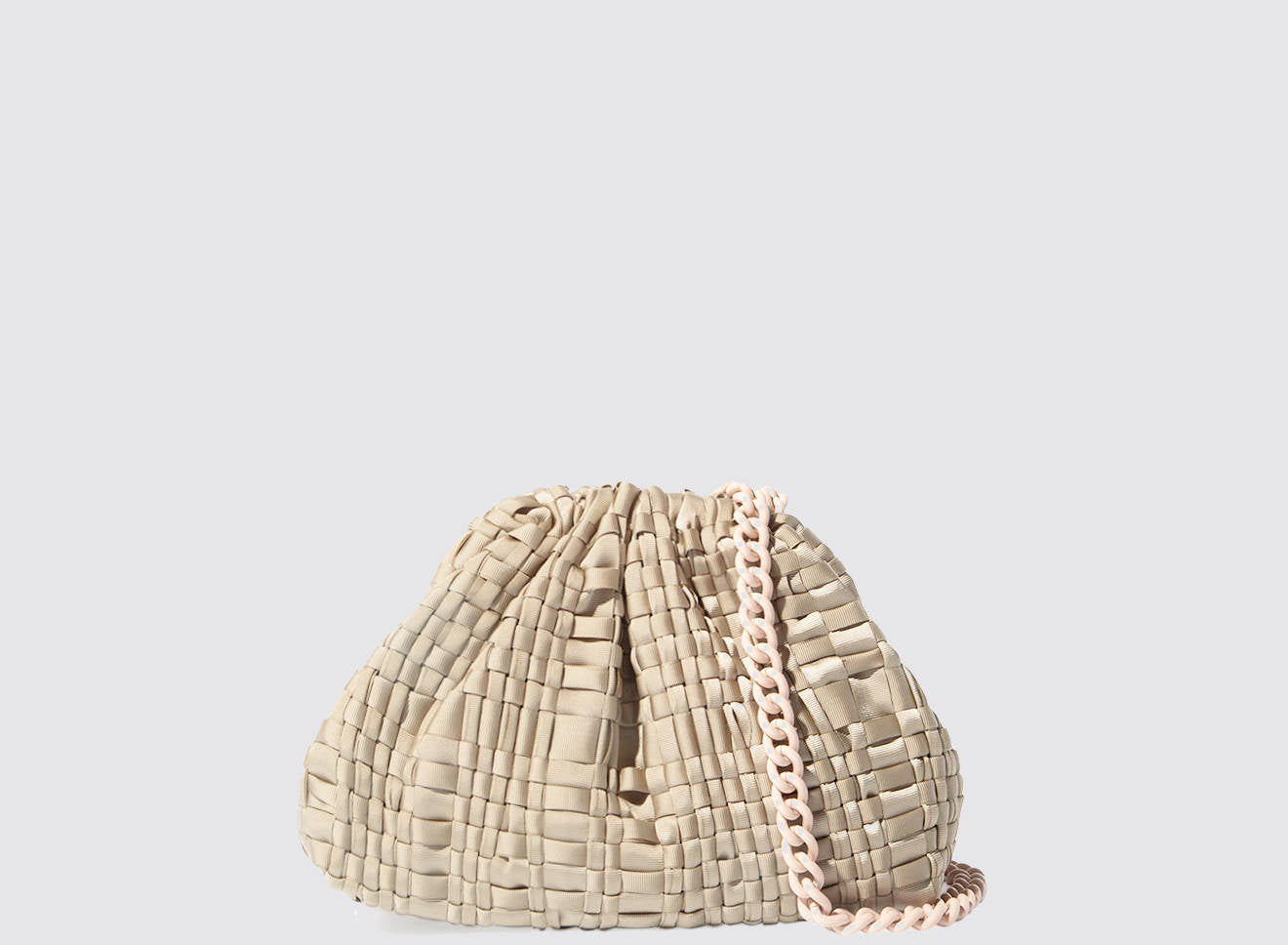 Small women's clutch in woven ribbon fabric, handmade on ancient looms. This unprecedented reduced version of the Maria La Rosa icon bag is roomy enough to carry the essentials with you. Perfect for all seasons, it is the emblem of a new metropolitan elegance. It is equipped with a ton sur ton chain to wear it even over the shoulder and there are many chromatic varieties to choose from: from natural to fluorescent shades, up to darker shades, such as forest green and black.