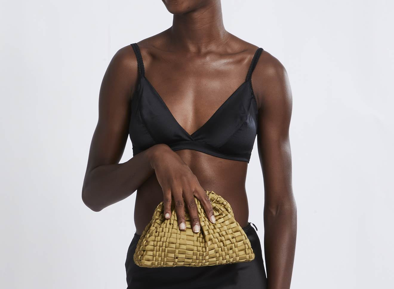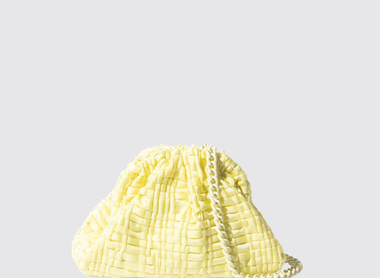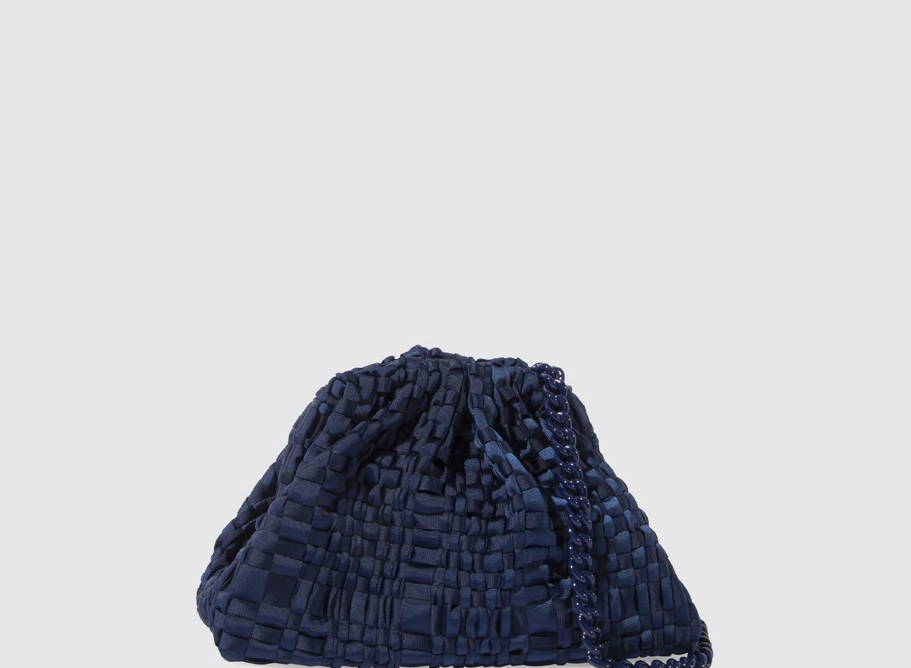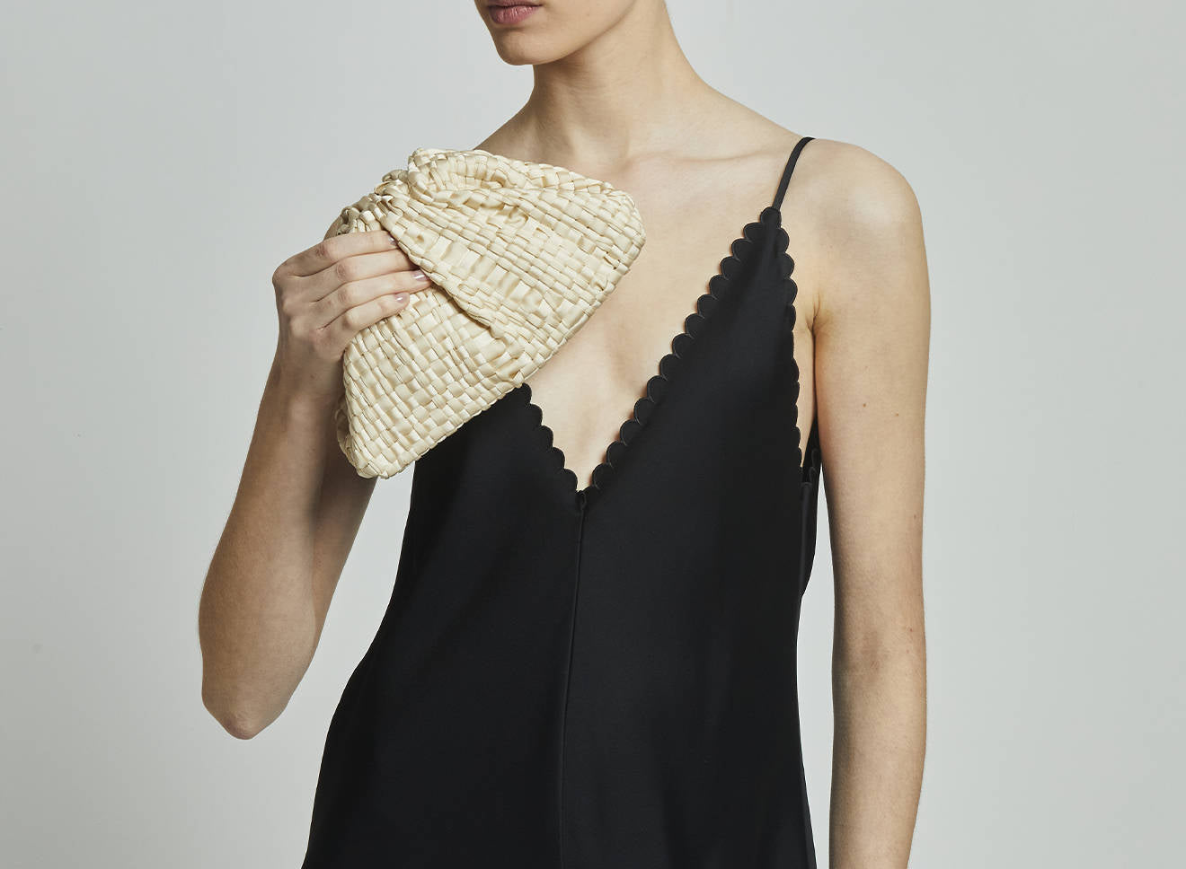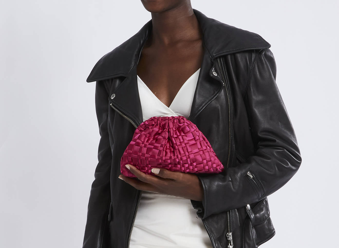 Small women's clutch in woven ribbon fabric, handmade on ancient looms. This unprecedented reduced version of the Maria La Rosa icon bag is roomy enough to carry the essentials with you. Perfect for all seasons, it is the emblem of a new metropolitan elegance. It is equipped with a ton sur ton chain to wear it even over the shoulder and there are many chromatic varieties to choose from: from natural to fluorescent shades, up to darker shades, such as forest green and black.