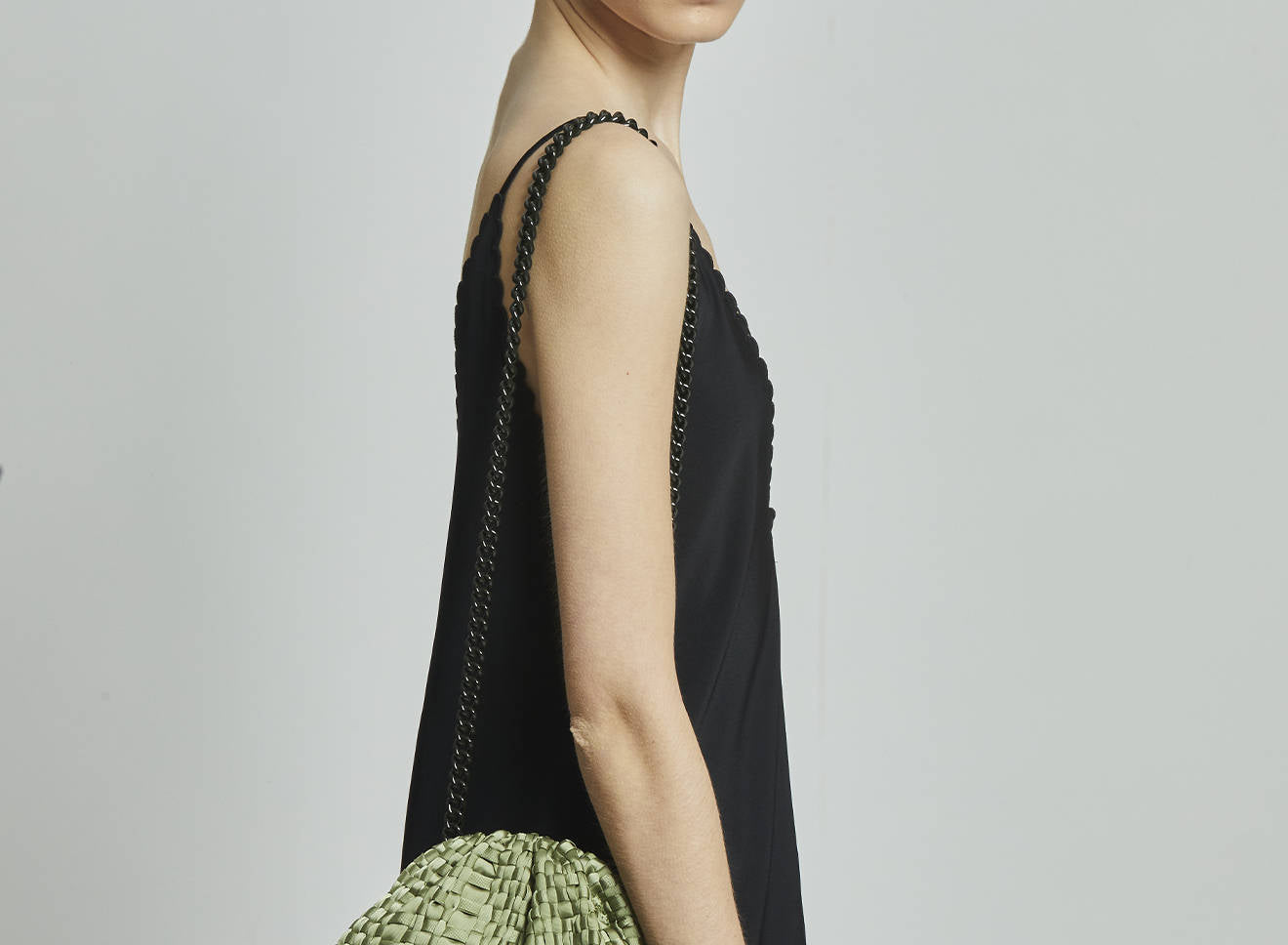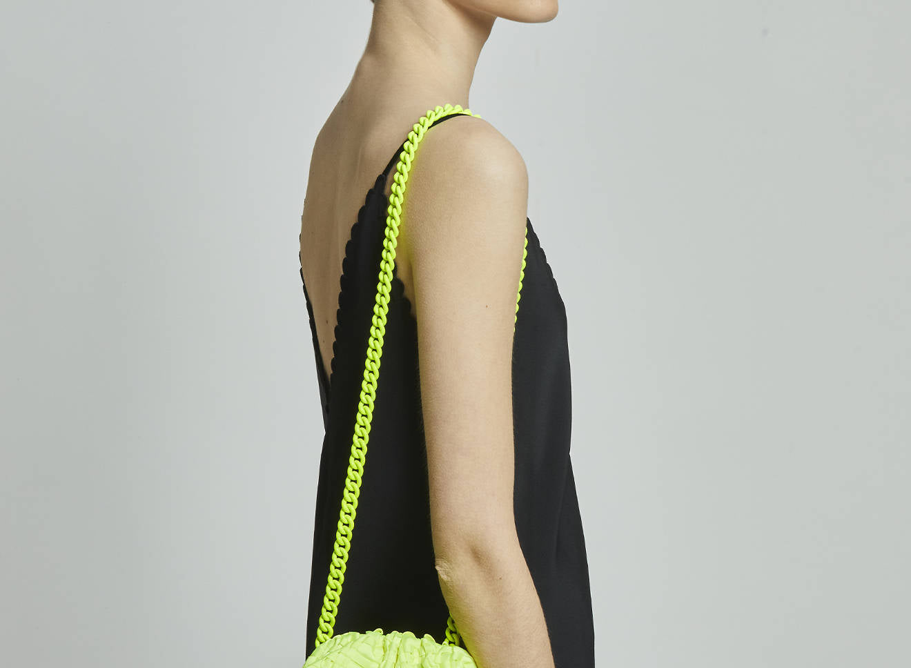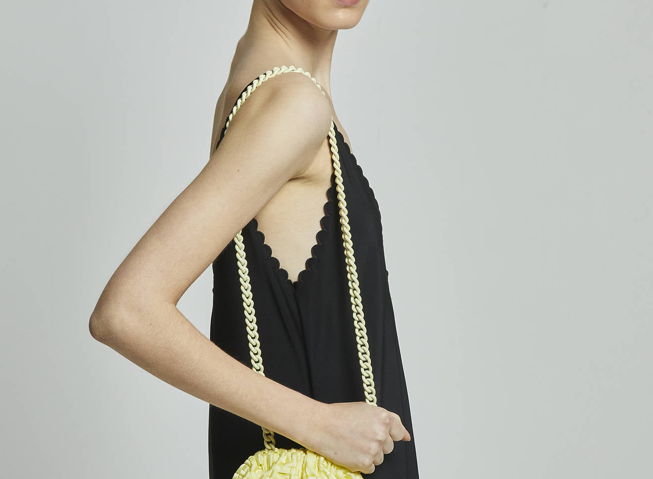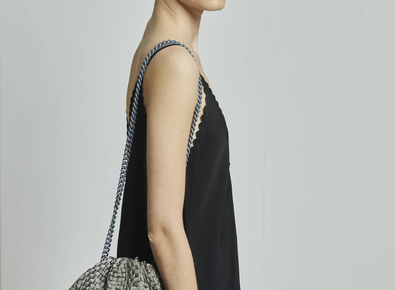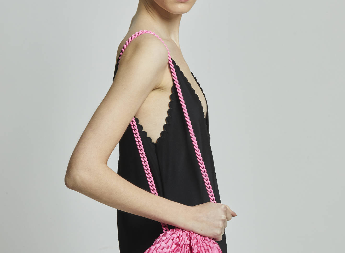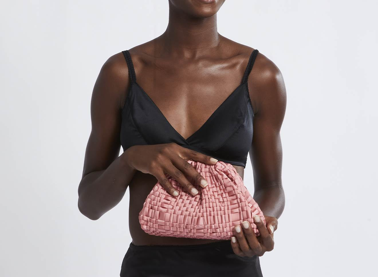 Small women's clutch in woven ribbon fabric, handmade on ancient looms. This unprecedented reduced version of the Maria La Rosa icon bag is roomy enough to carry the essentials with you. Perfect for all seasons, it is the emblem of a new metropolitan elegance. It is equipped with a ton sur ton chain to wear it even over the shoulder and there are many chromatic varieties to choose from: from natural to fluorescent shades, up to darker shades, such as forest green and black.