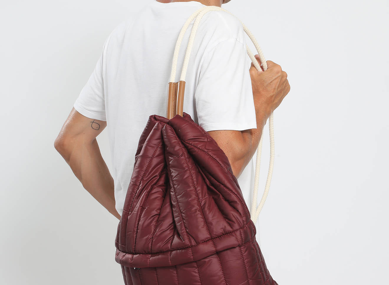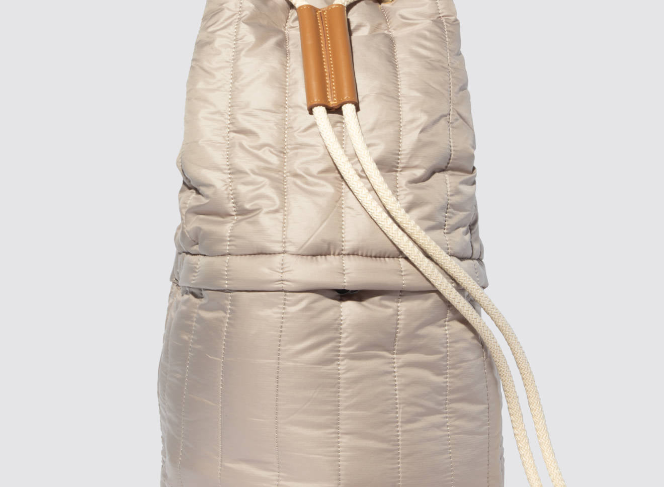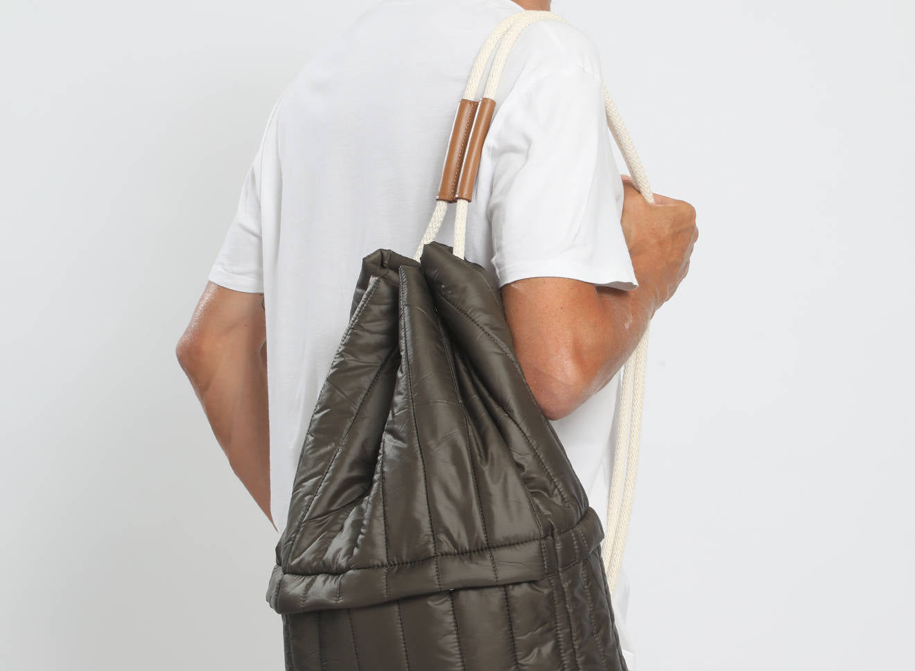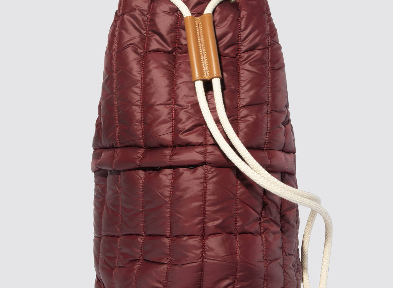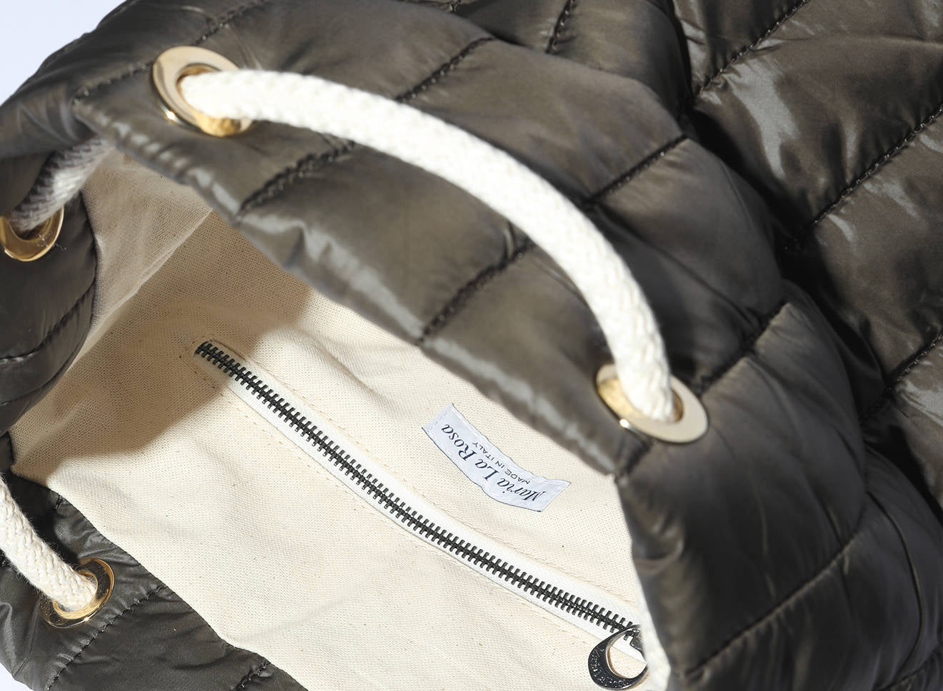 The padding and quilted texture evoke the outdoor world, while natural rope details and faux leather inserts add a refined touch. The drawstring closure and spacious interior make it practical for everyday life—perfect for tackling the city with style and ease. Entirely designed and made in Italy.