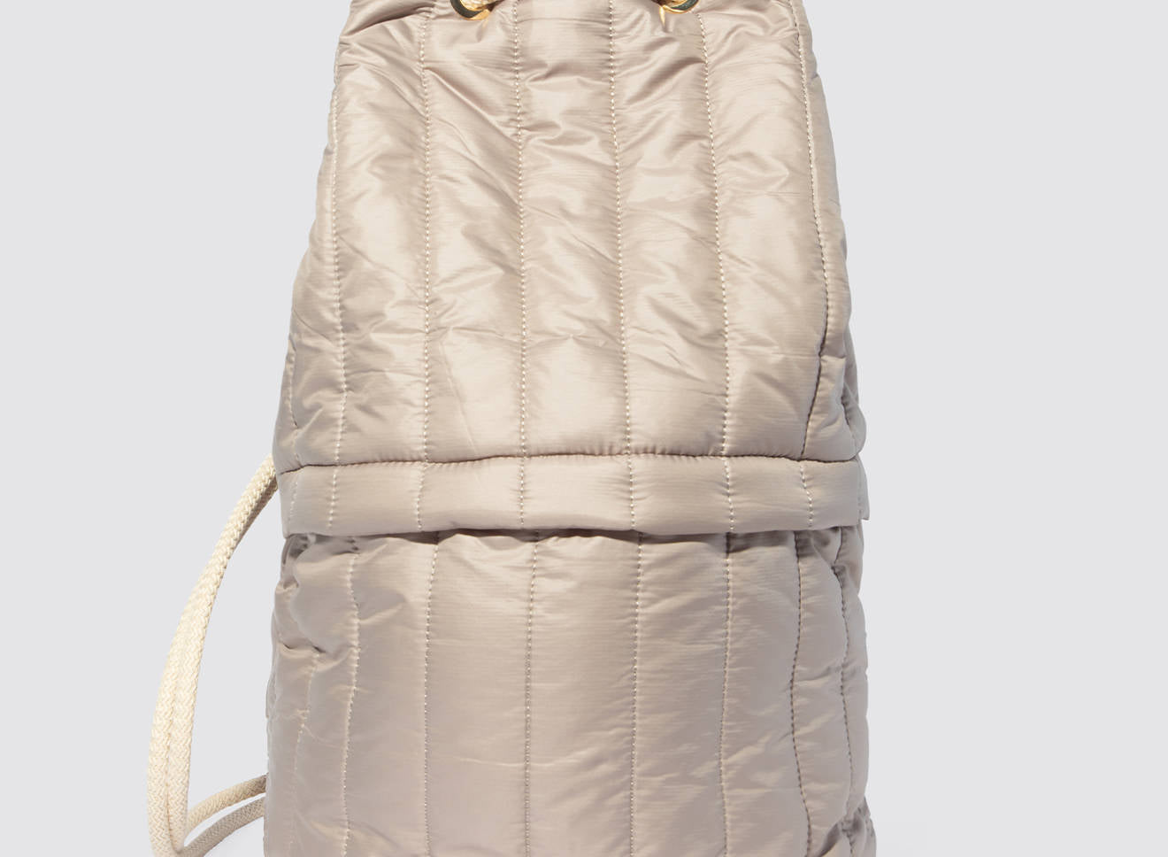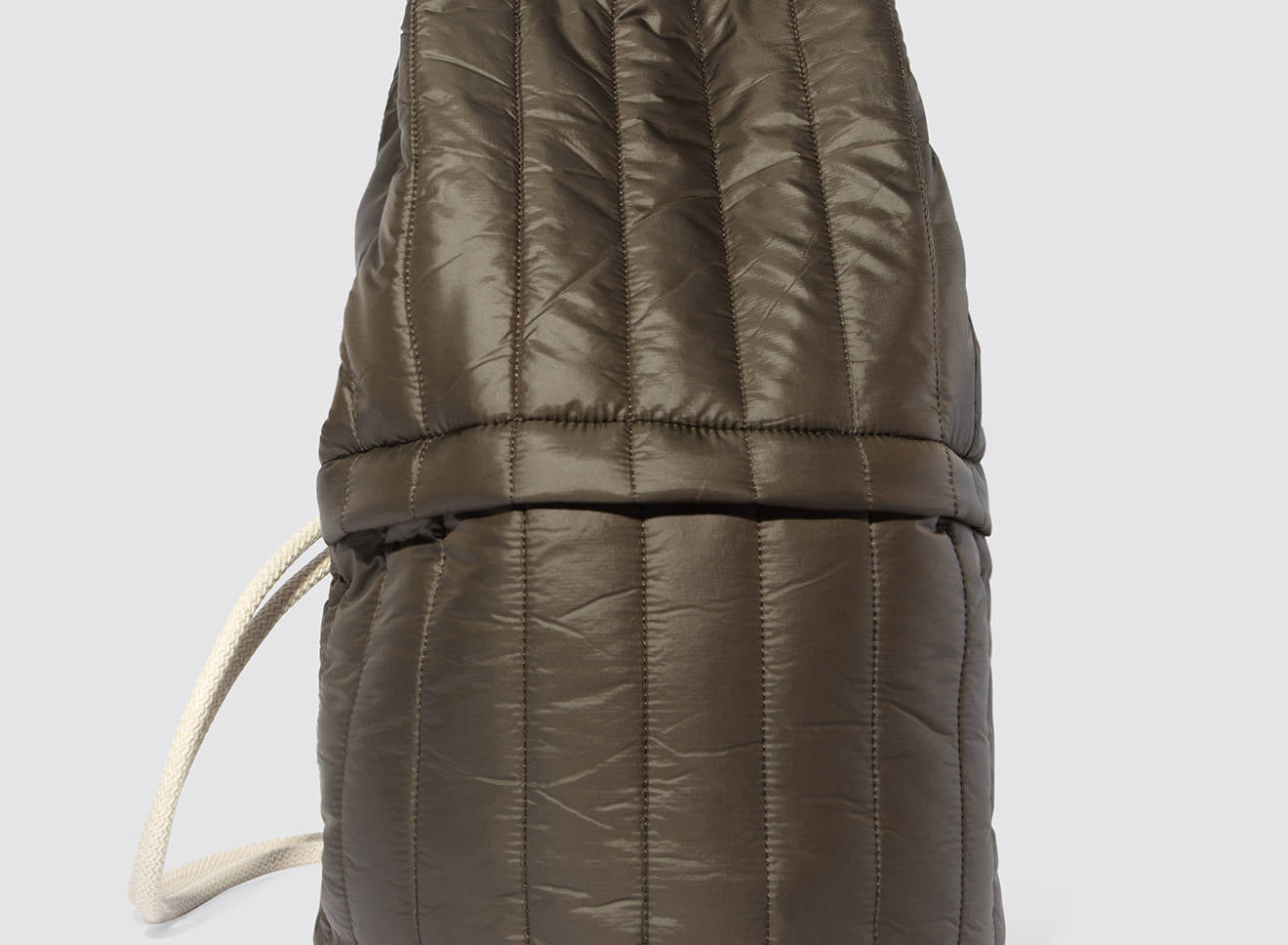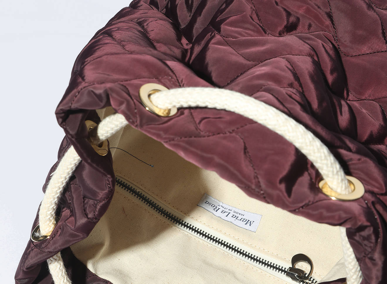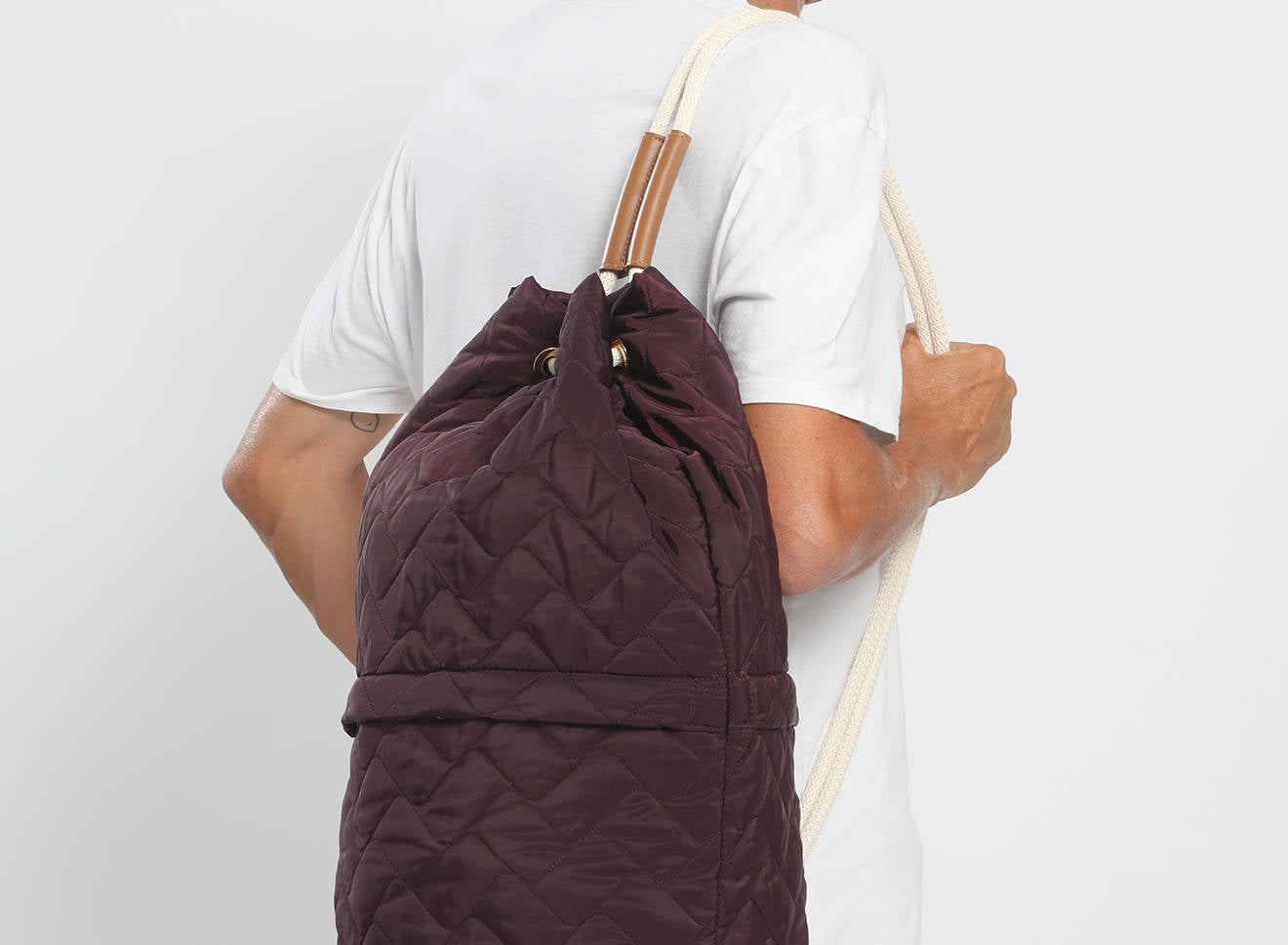 The padding and quilted texture evoke the outdoor world, while natural rope details and faux leather inserts add a refined touch. The drawstring closure and spacious interior make it practical for everyday life—perfect for tackling the city with style and ease. Entirely designed and made in Italy.