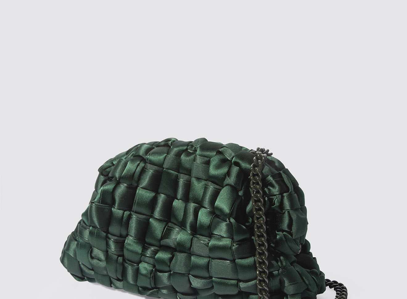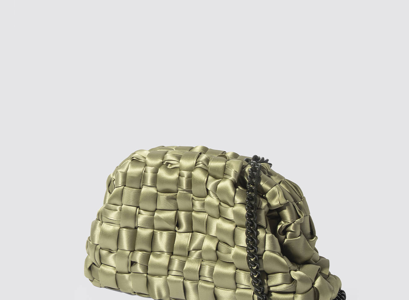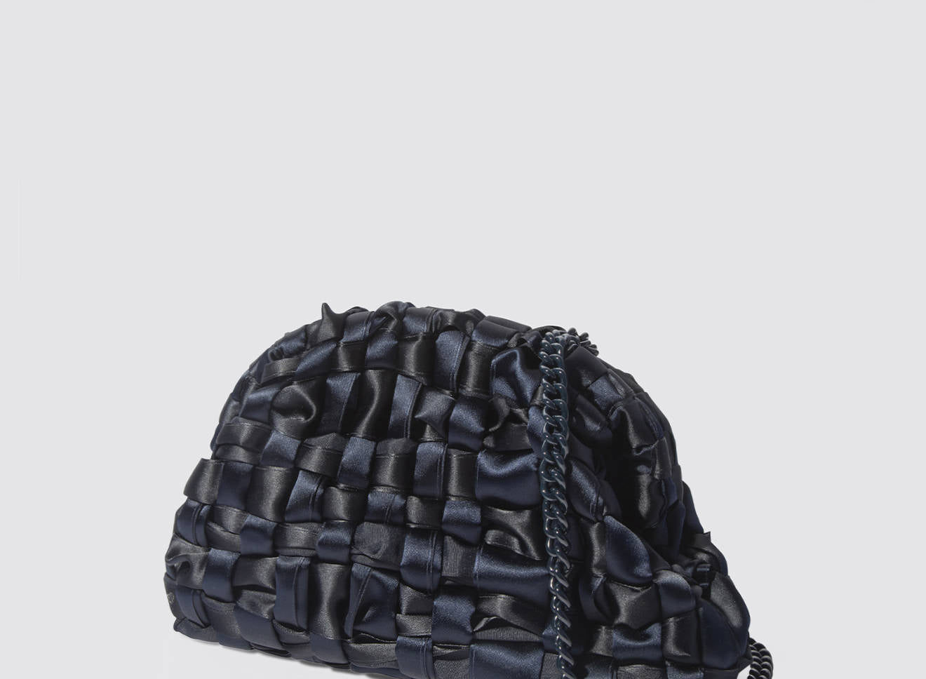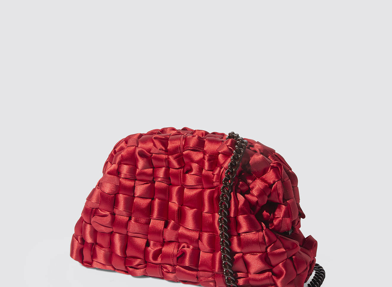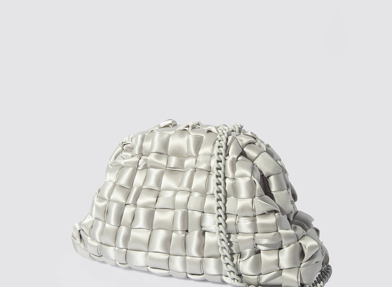 Hand-woven satin clutch with a sophisticated, contemporary design. The soft, shimmering texture lends an elegant, sophisticated feel, while the metal chain allows it to be worn comfortably over the shoulder. A versatile accessory that adds a touch of sophistication to any look, from day to night. Entirely designed and made in Italy.