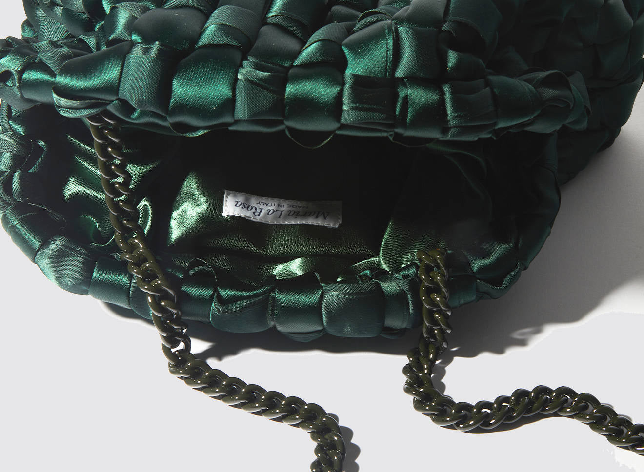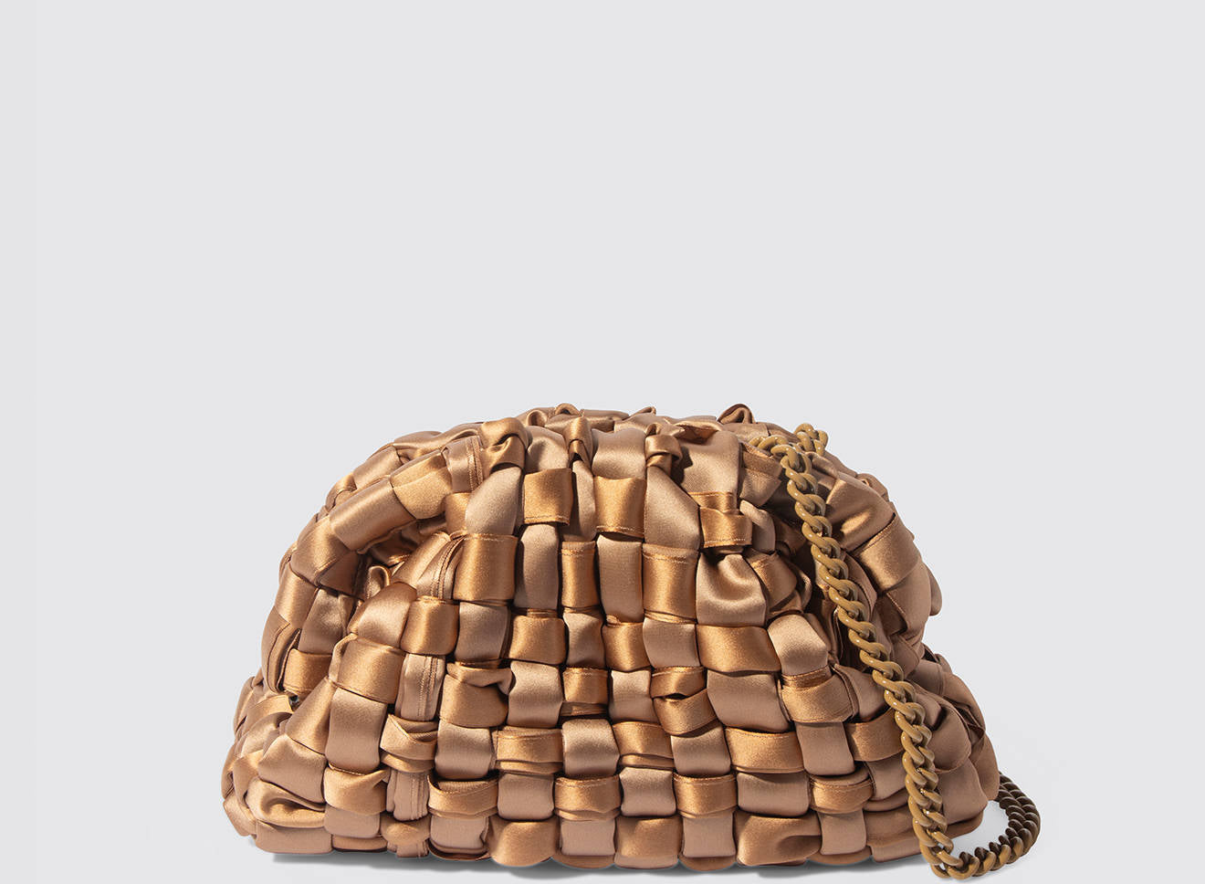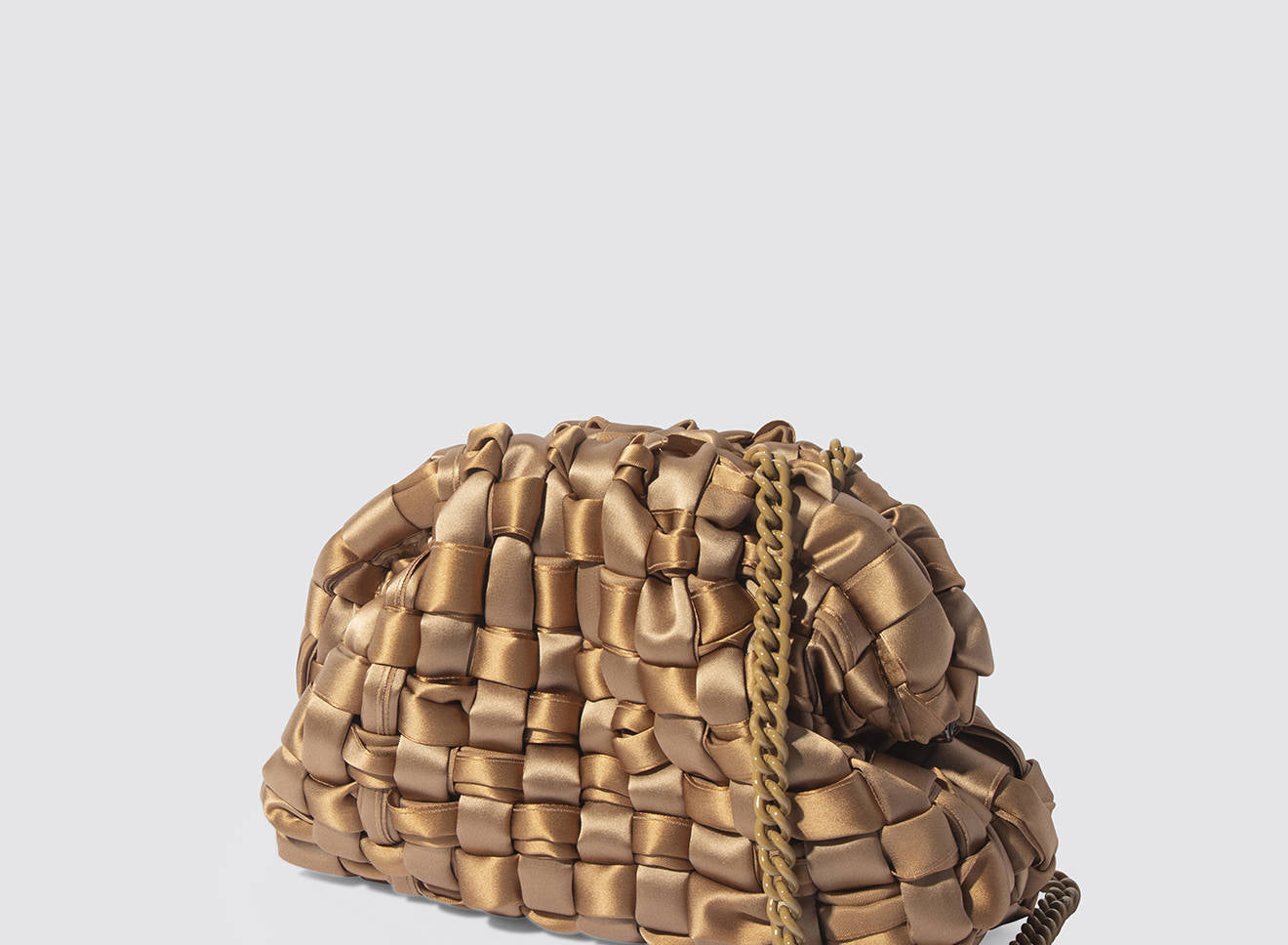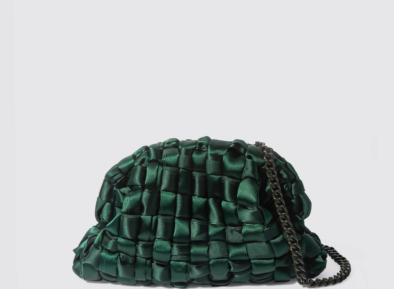 Hand-woven satin clutch with a sophisticated, contemporary design. The soft, shimmering texture lends an elegant, sophisticated feel, while the metal chain allows it to be worn comfortably over the shoulder. A versatile accessory that adds a touch of sophistication to any look, from day to night. Entirely designed and made in Italy.