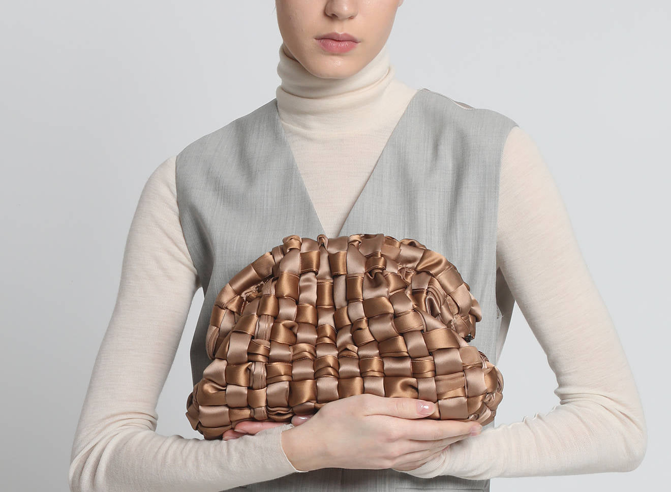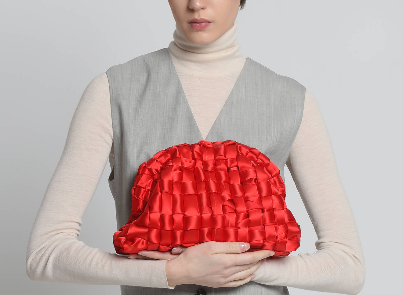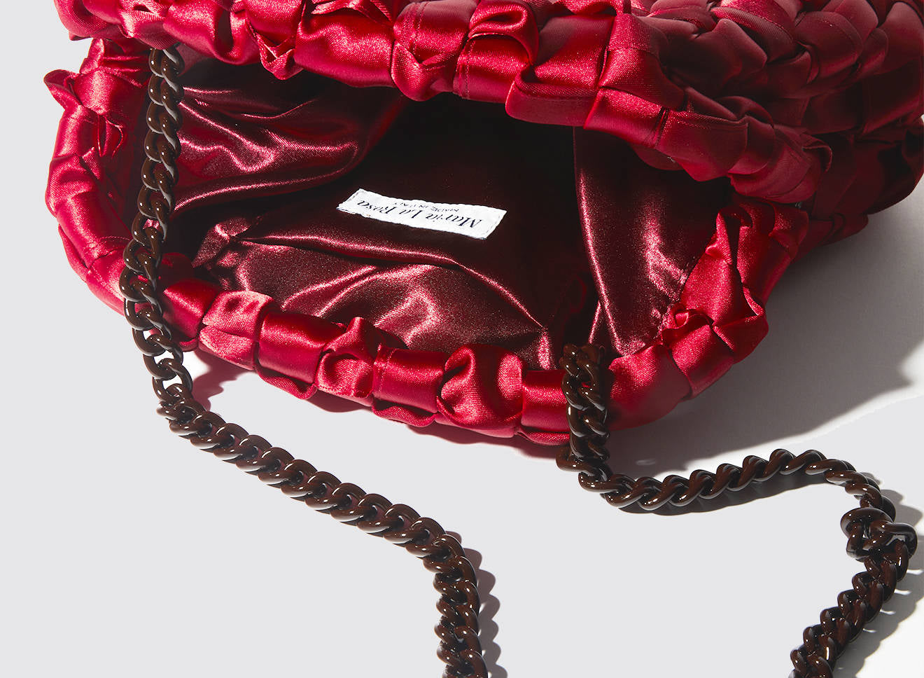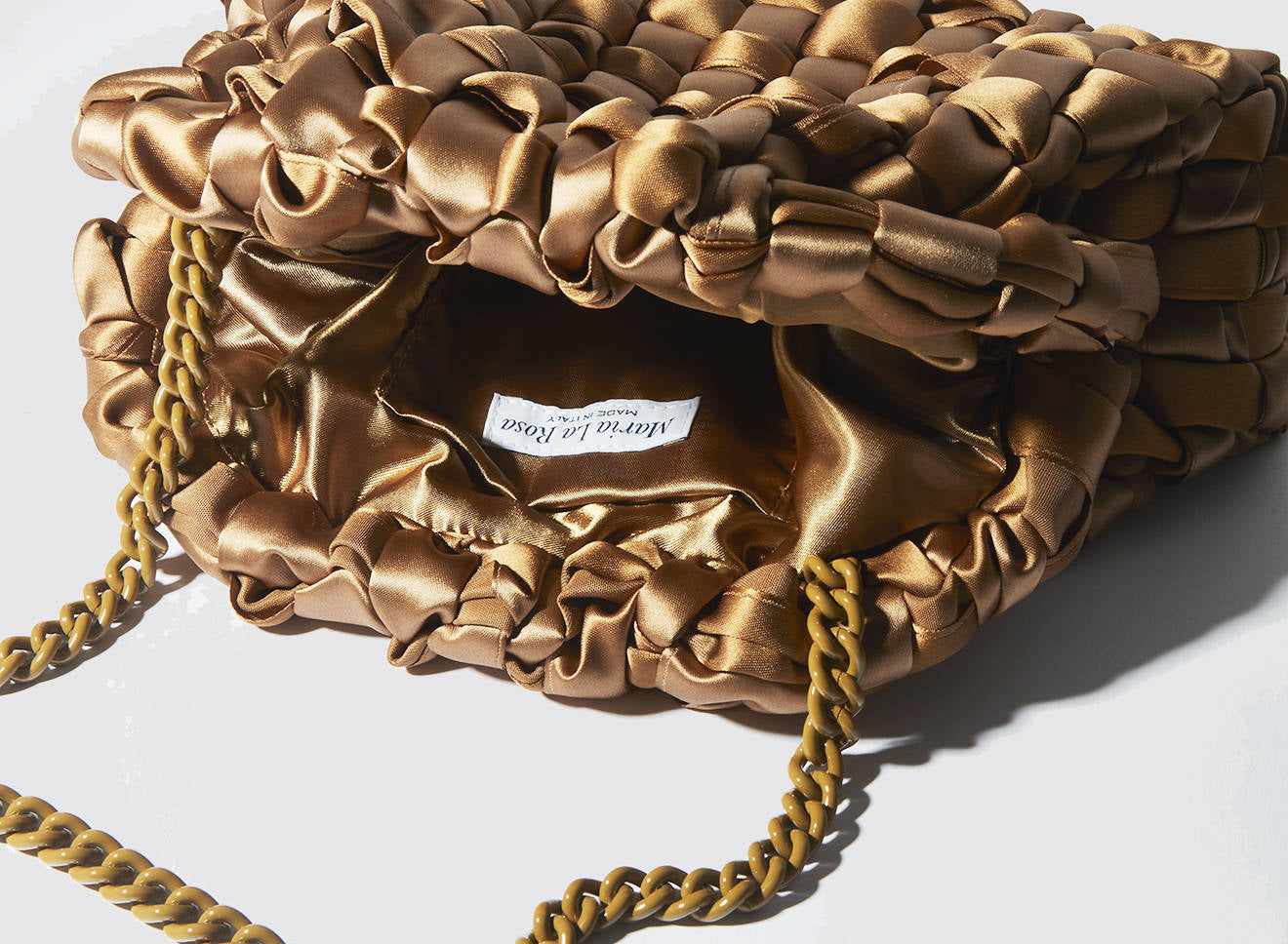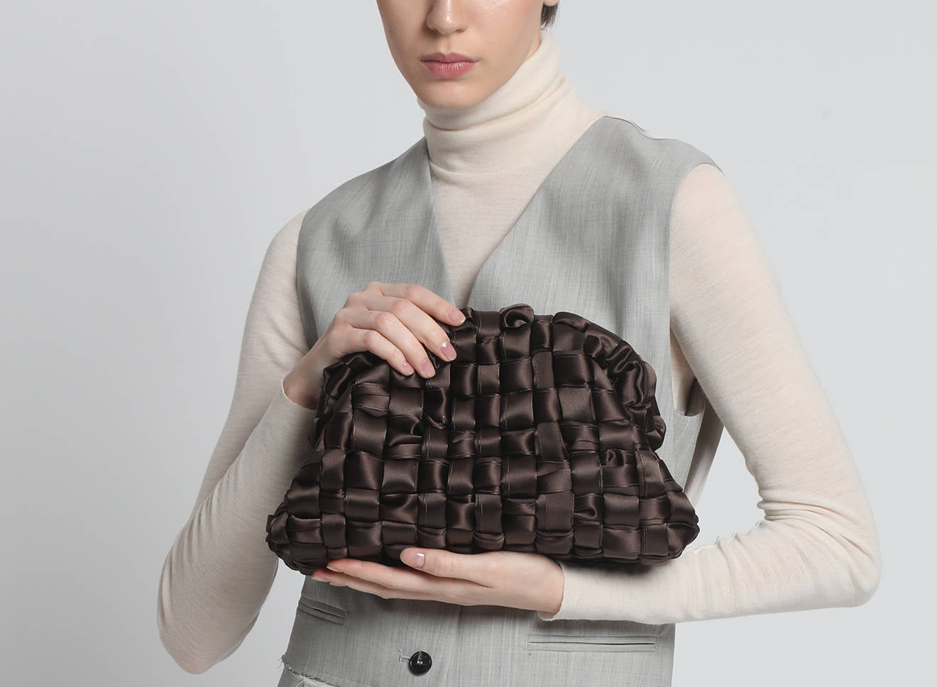 Hand-woven satin clutch with a sophisticated, contemporary design. The soft, shimmering texture lends an elegant, sophisticated feel, while the metal chain allows it to be worn comfortably over the shoulder. A versatile accessory that adds a touch of sophistication to any look, from day to night. Entirely designed and made in Italy.