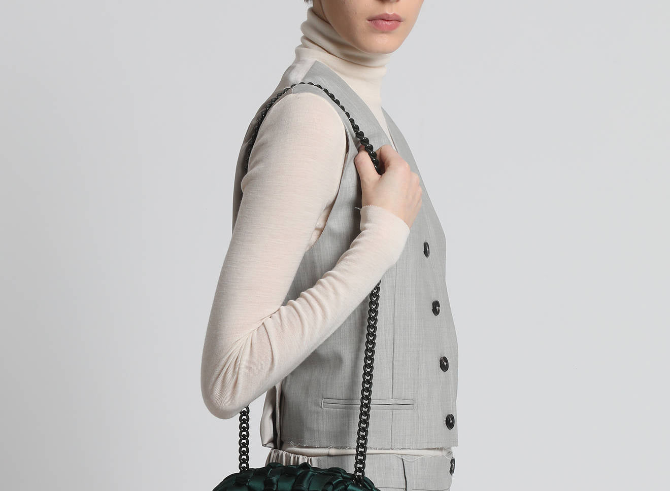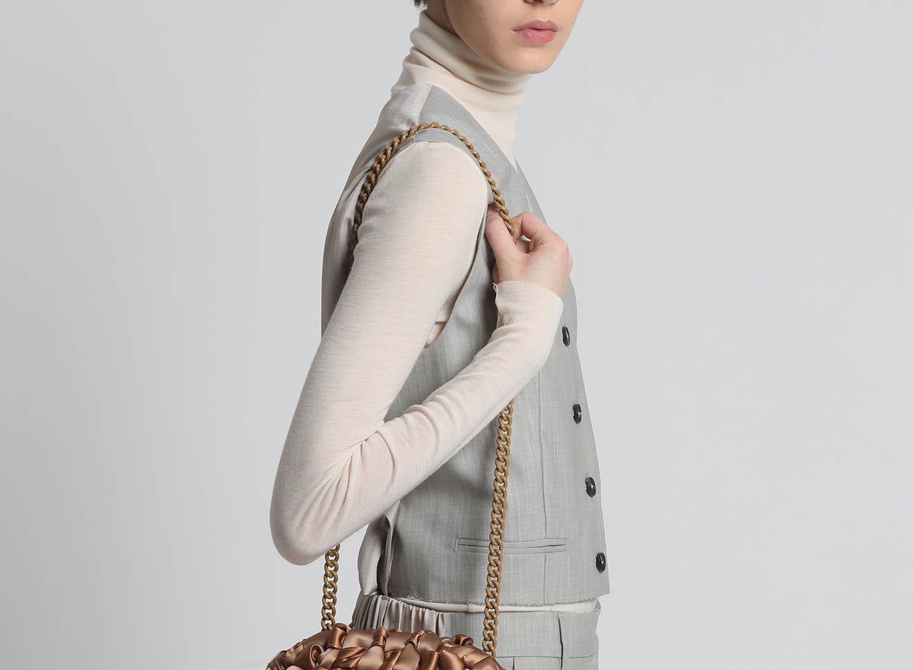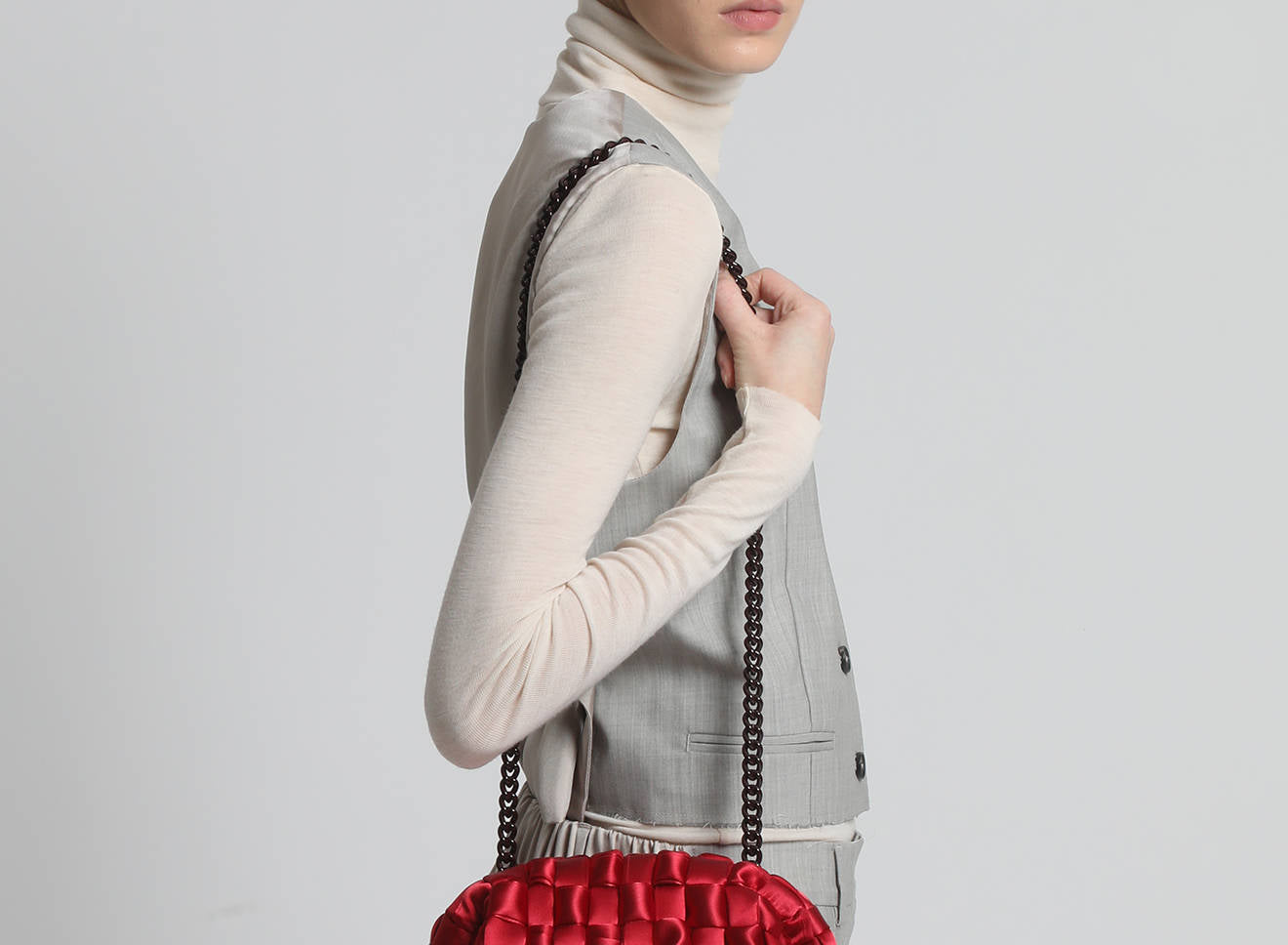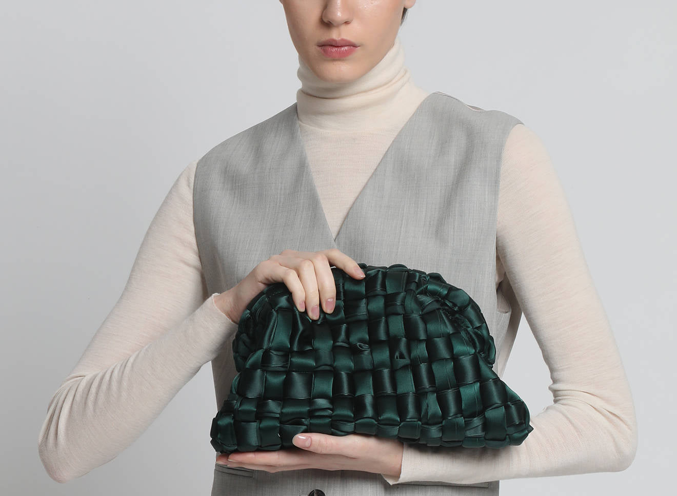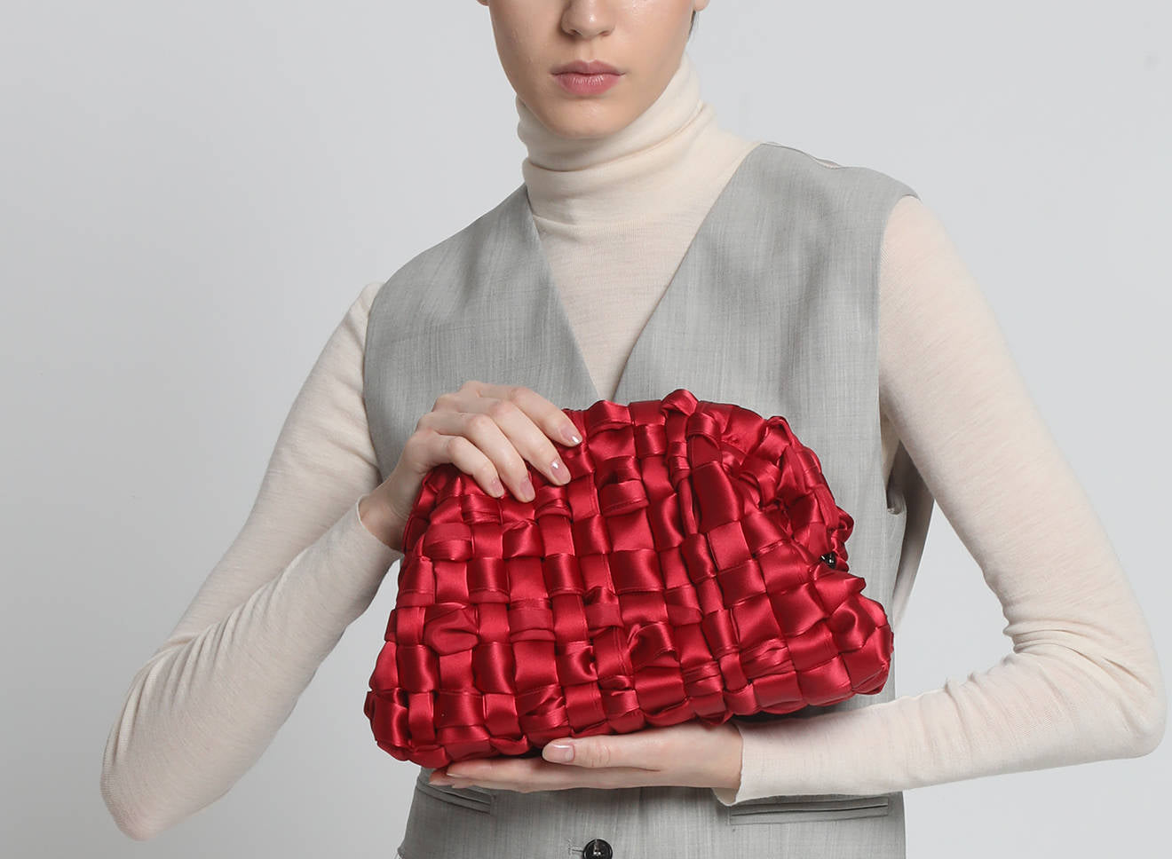 Hand-woven satin clutch with a sophisticated, contemporary design. The soft, shimmering texture lends an elegant, sophisticated feel, while the metal chain allows it to be worn comfortably over the shoulder. A versatile accessory that adds a touch of sophistication to any look, from day to night. Entirely designed and made in Italy.
