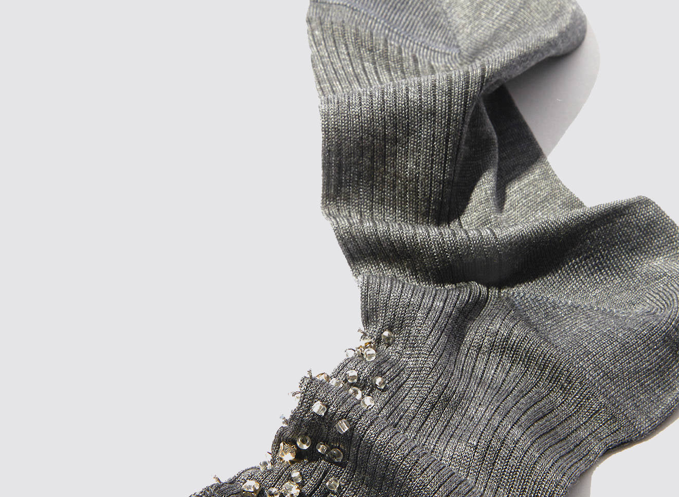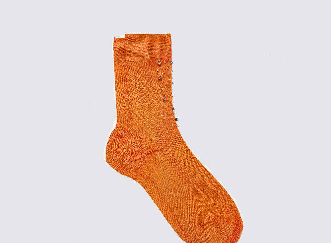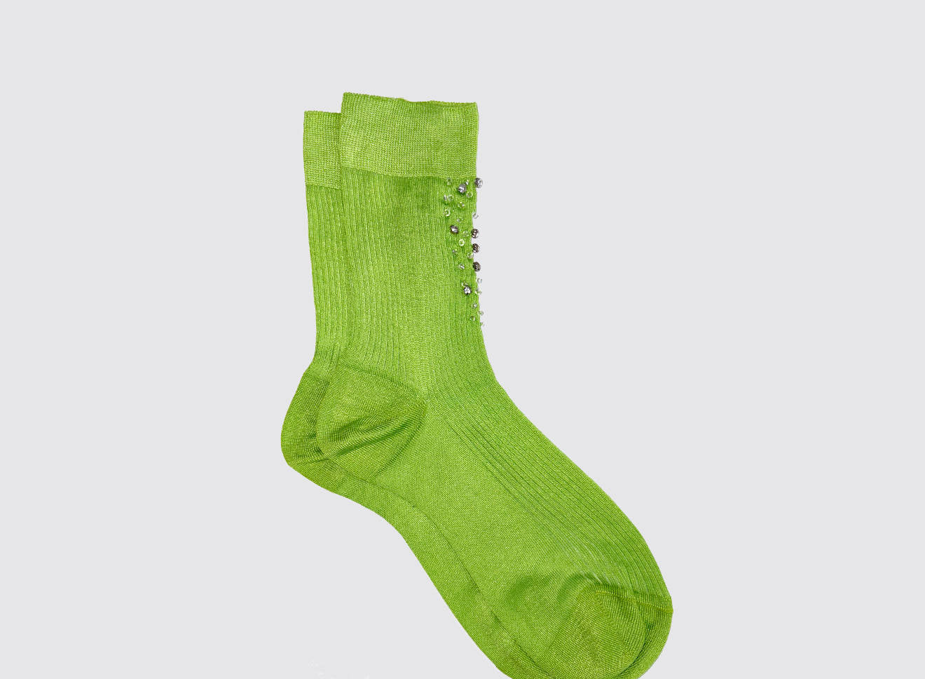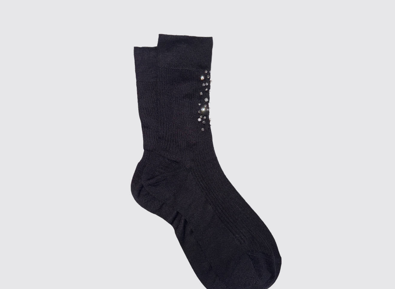 A touch of artisanal elegance for every step. These fine silk socks stand out for their fine and comfortable texture, enhanced by hand-embroidered detailing. The delicate appliqués add sparkle and sophistication, making them perfect for adding a precious detail to any look.