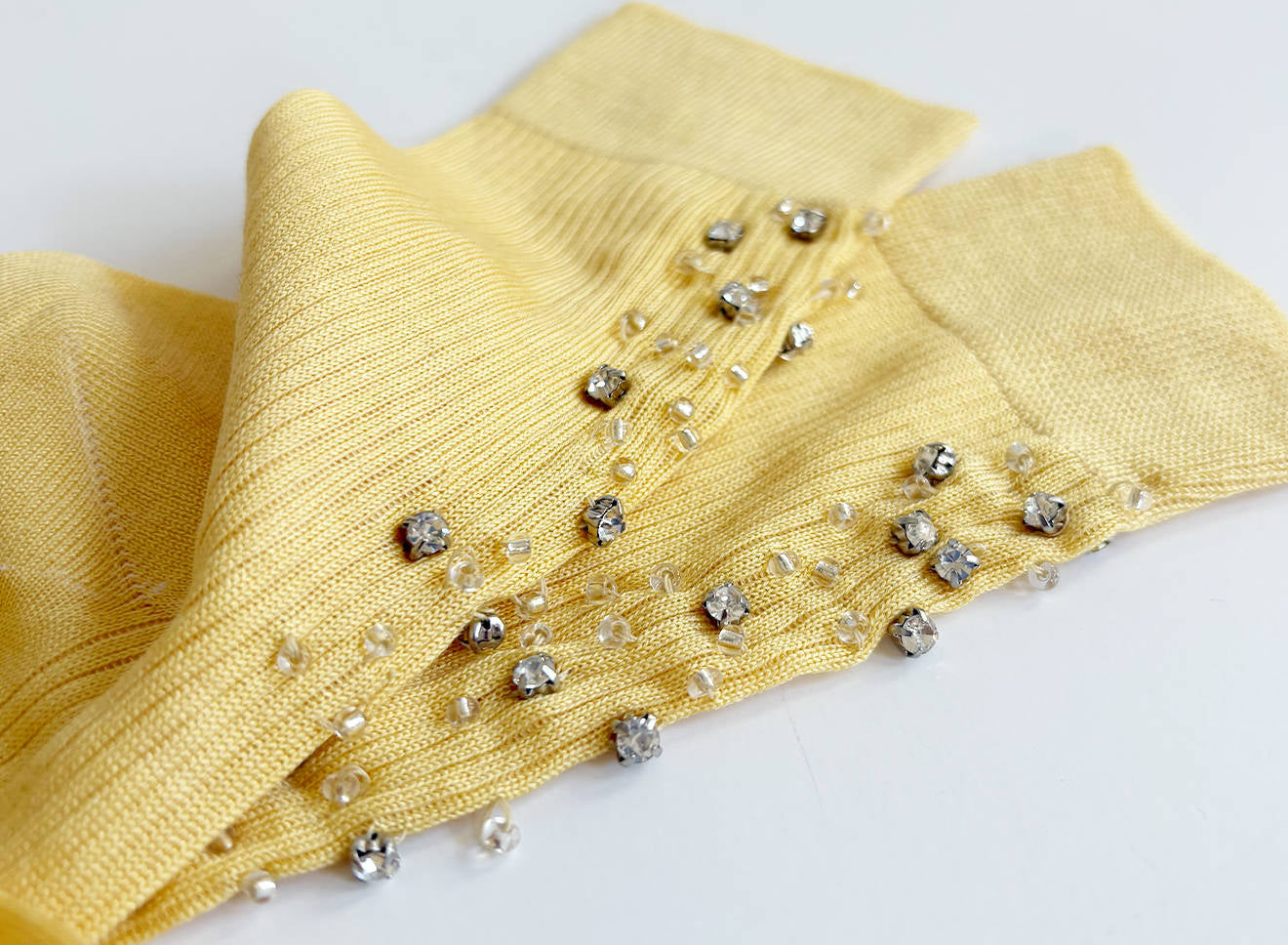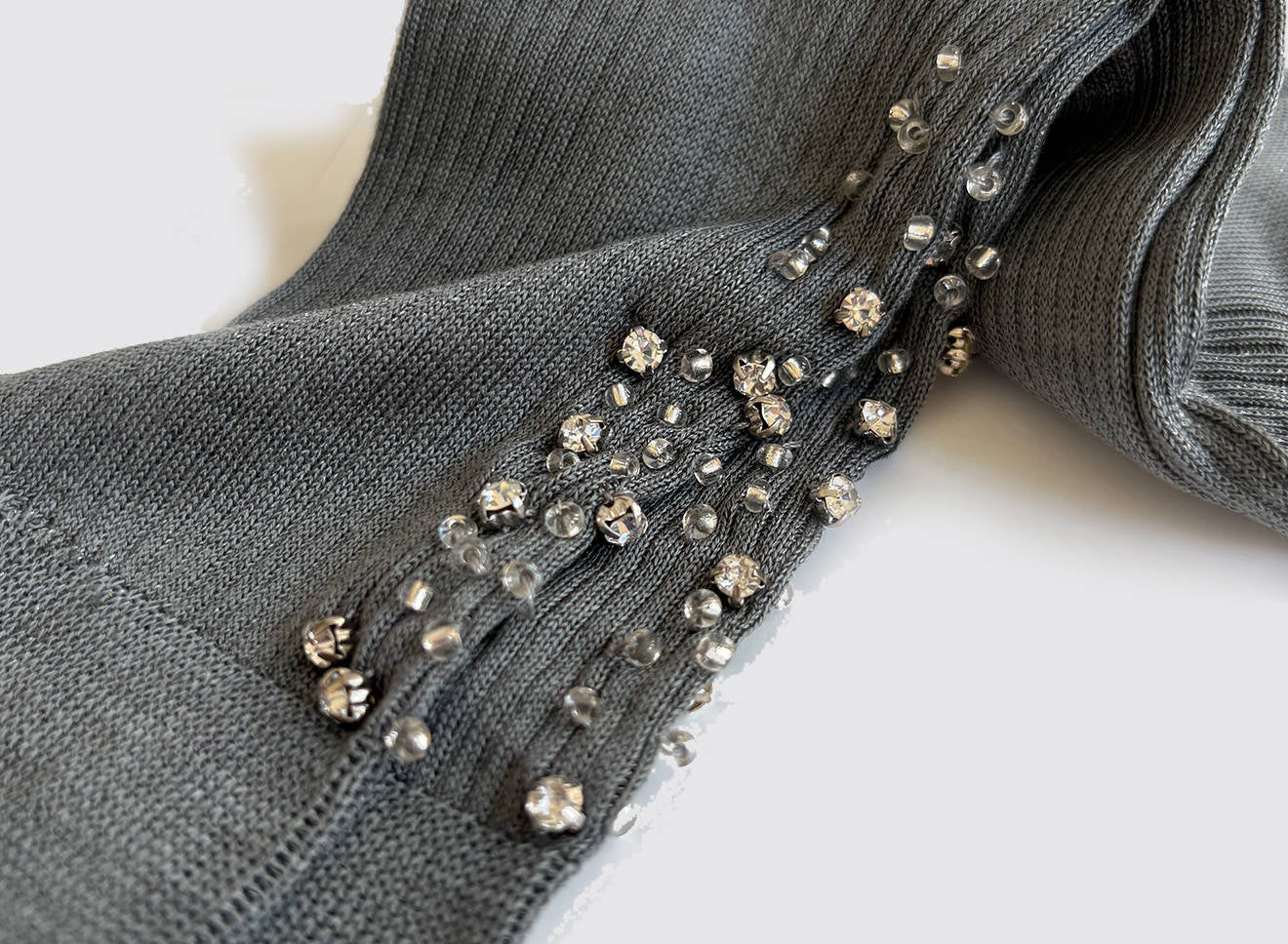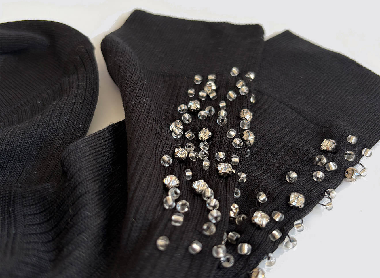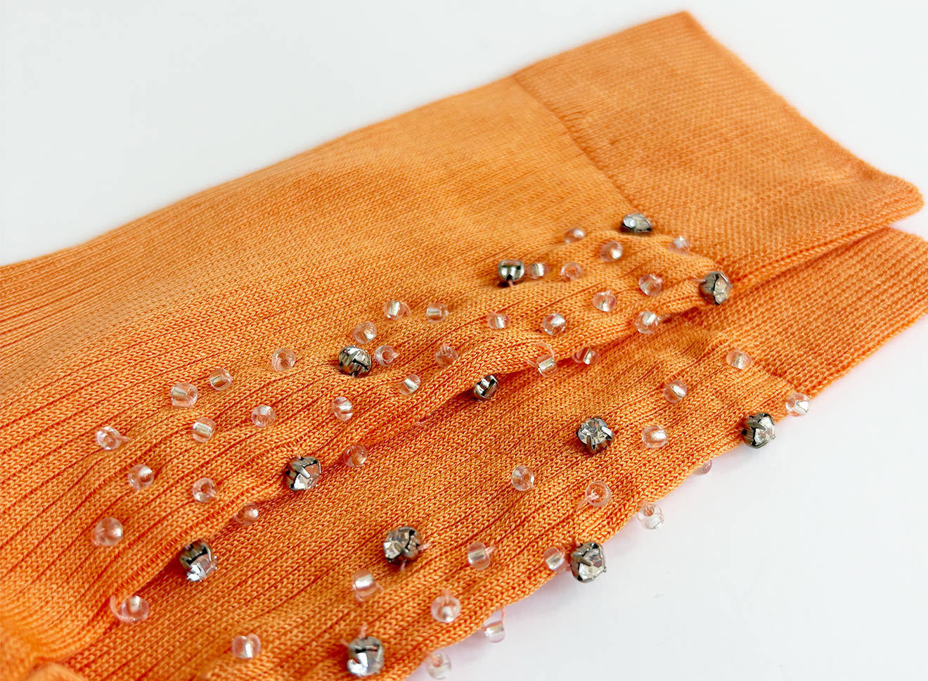 A touch of artisanal elegance for every step. These fine silk socks stand out for their fine and comfortable texture, enhanced by hand-embroidered detailing. The delicate appliqués add sparkle and sophistication, making them perfect for adding a precious detail to any look.