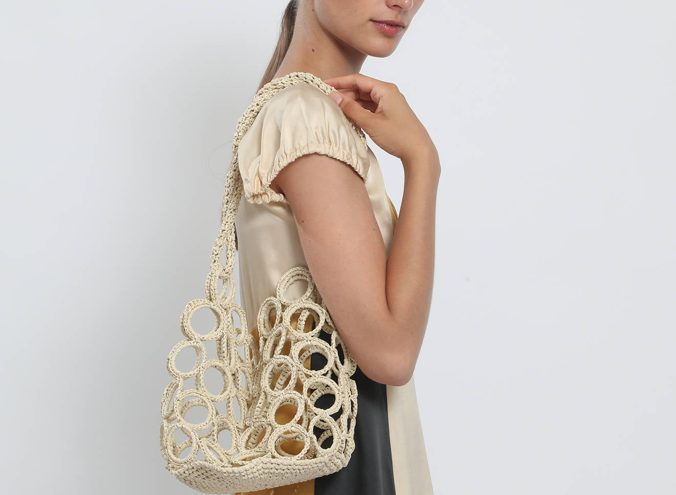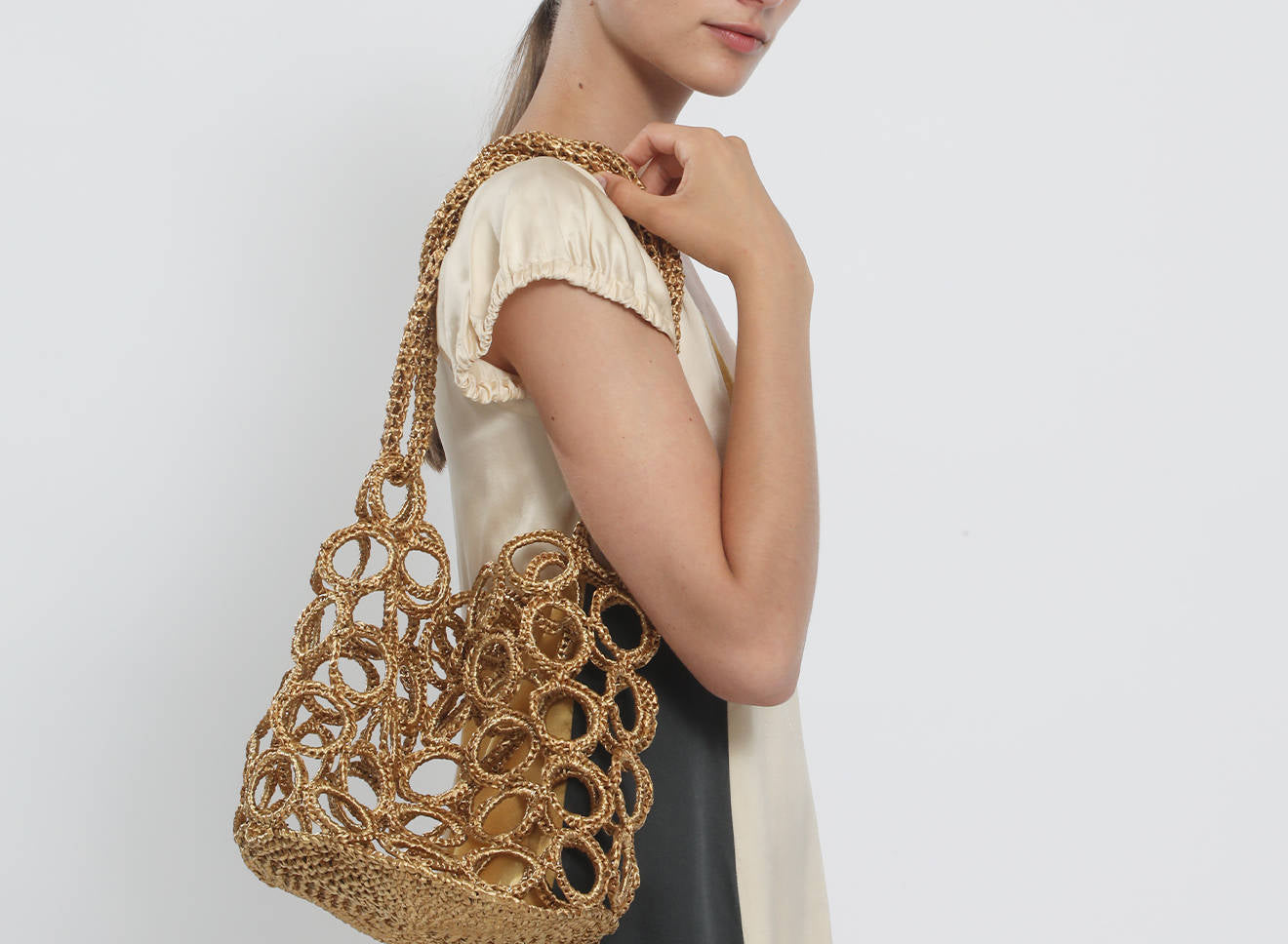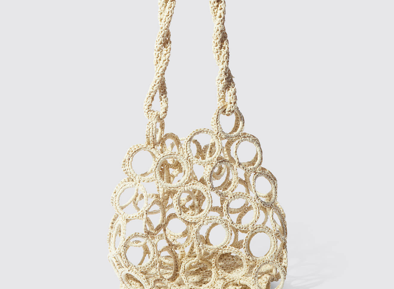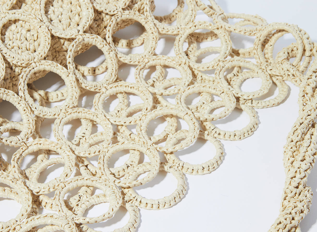 La costruzione crea un raffinato gioco di pieni e vuoti, donando alla silhouette un carattere grafico e scultoreo. La rafia, luminosa e materica, valorizza la tridimensionalità dell’intreccio e conferisce alla borsa una presenza naturale ma sofisticata.