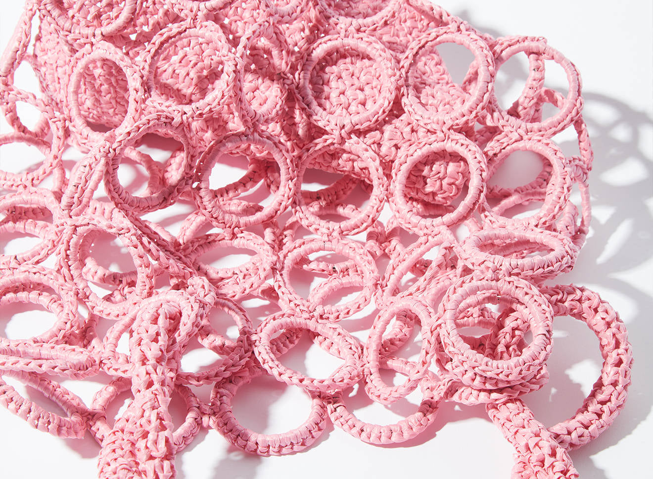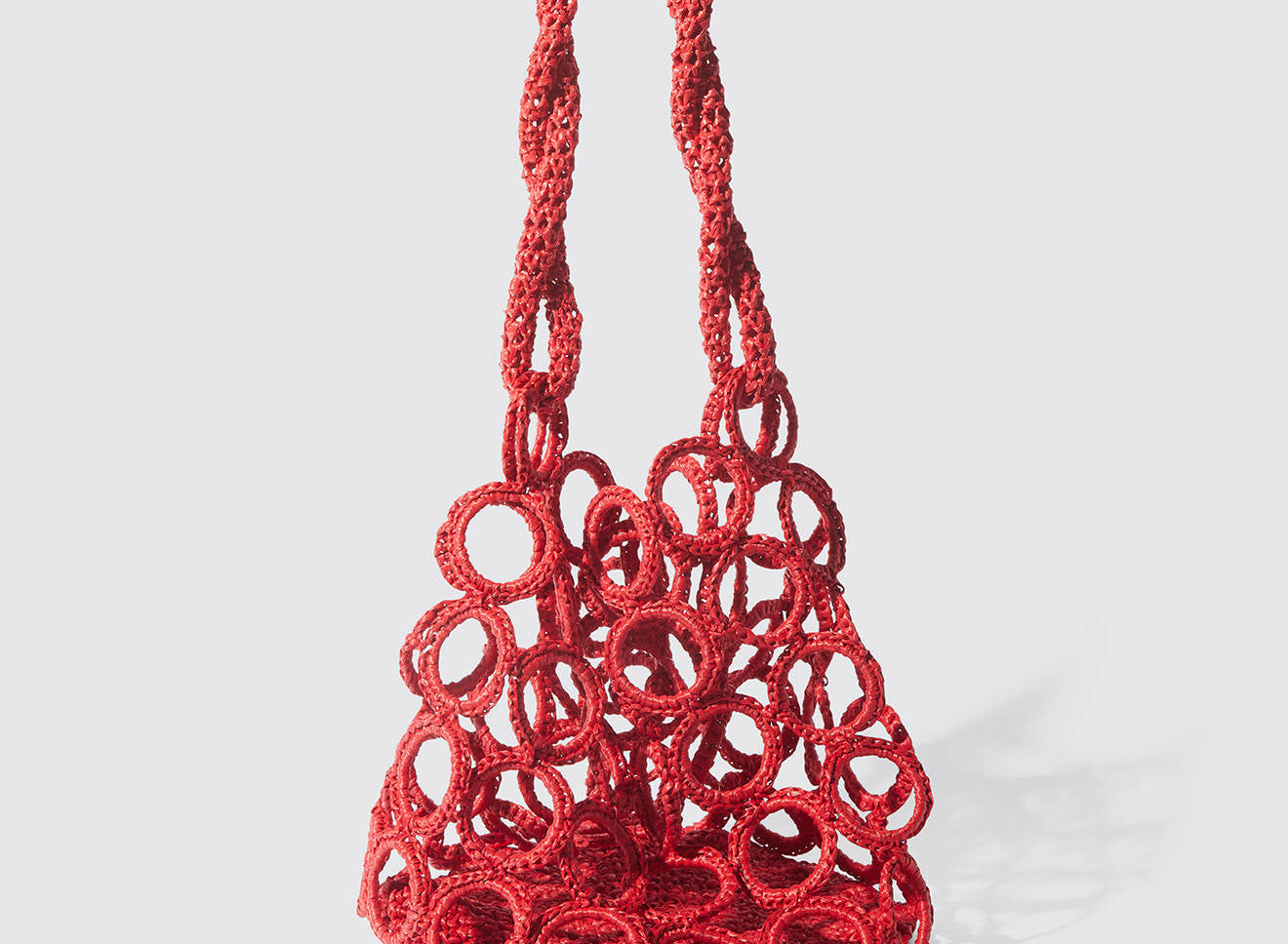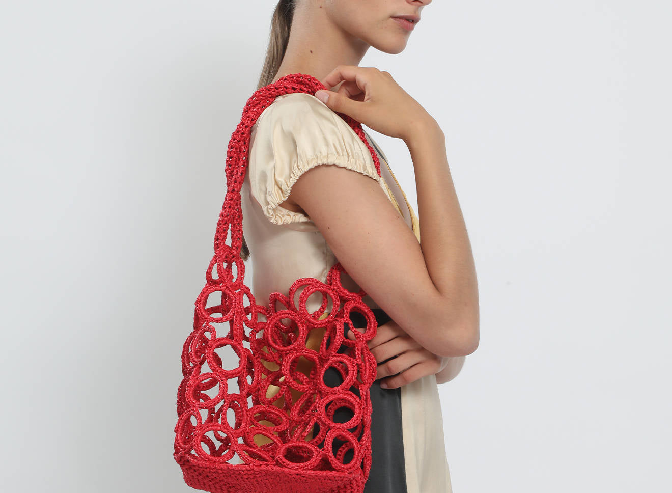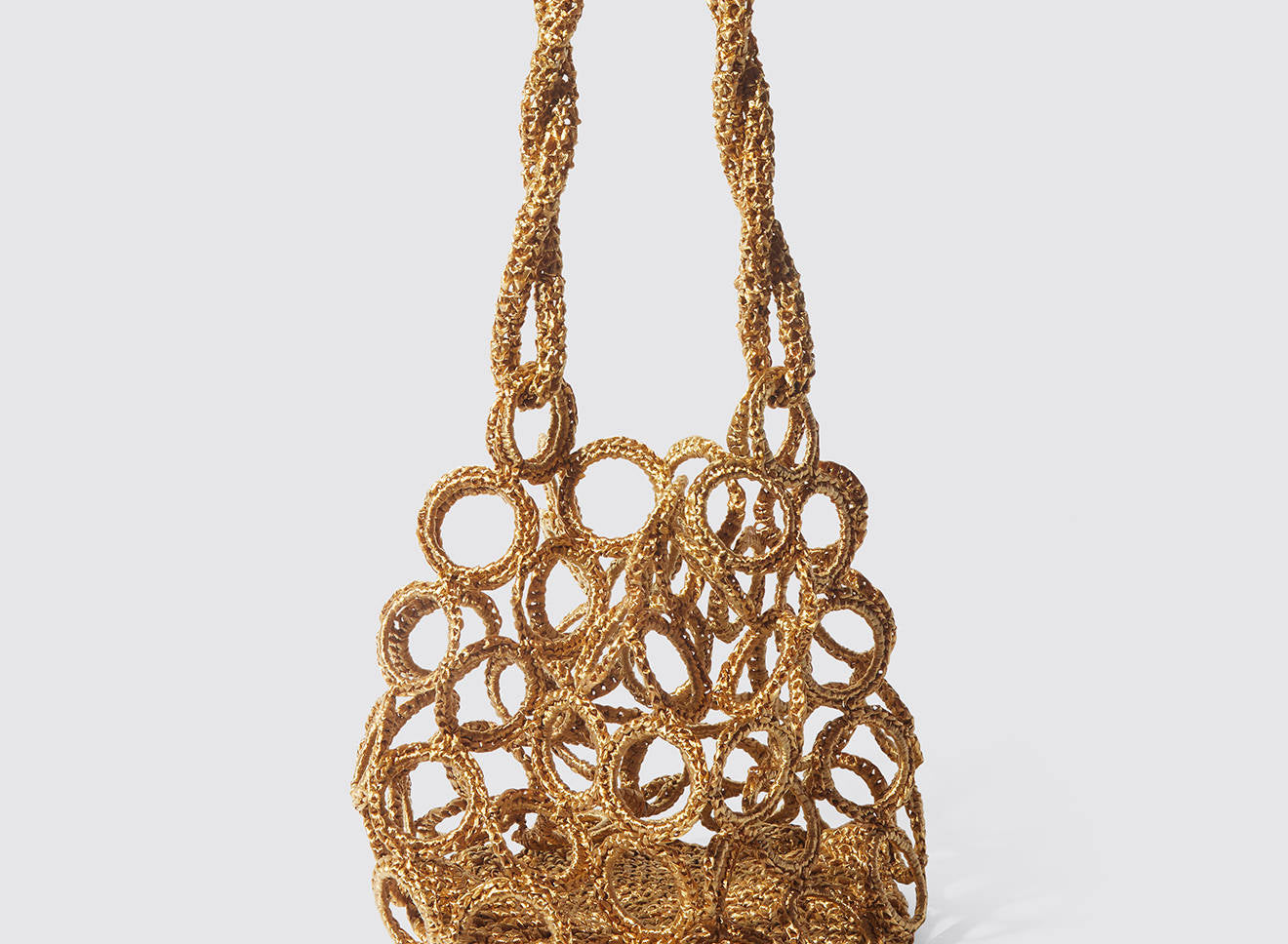 La costruzione crea un raffinato gioco di pieni e vuoti, donando alla silhouette un carattere grafico e scultoreo. La rafia, luminosa e materica, valorizza la tridimensionalità dell’intreccio e conferisce alla borsa una presenza naturale ma sofisticata.