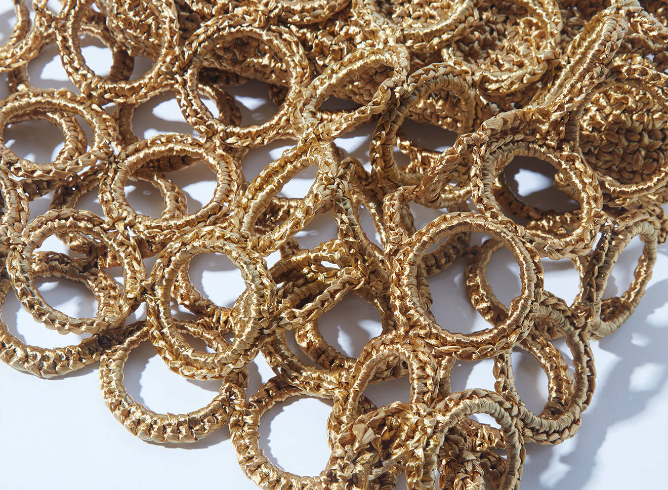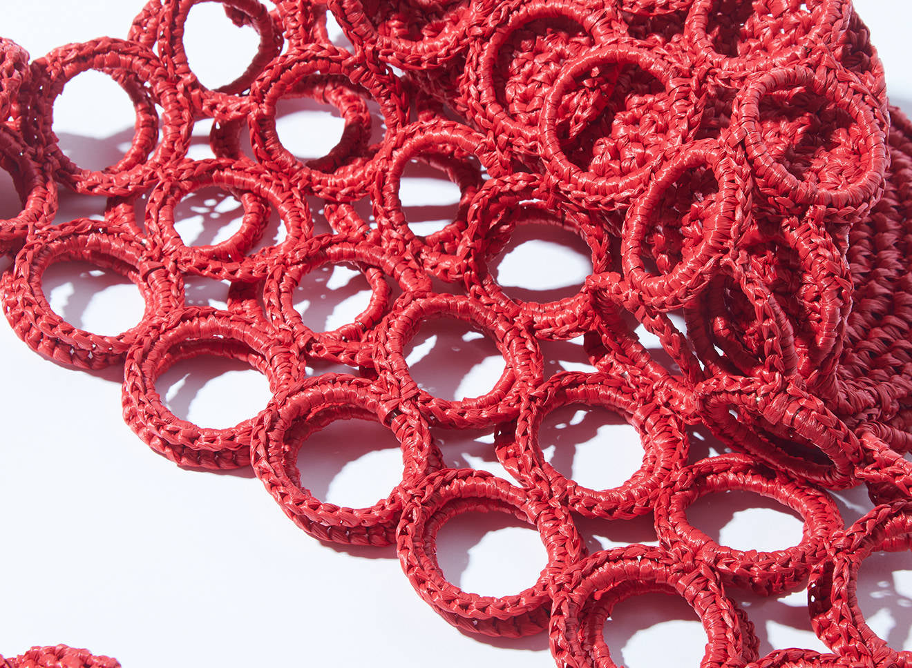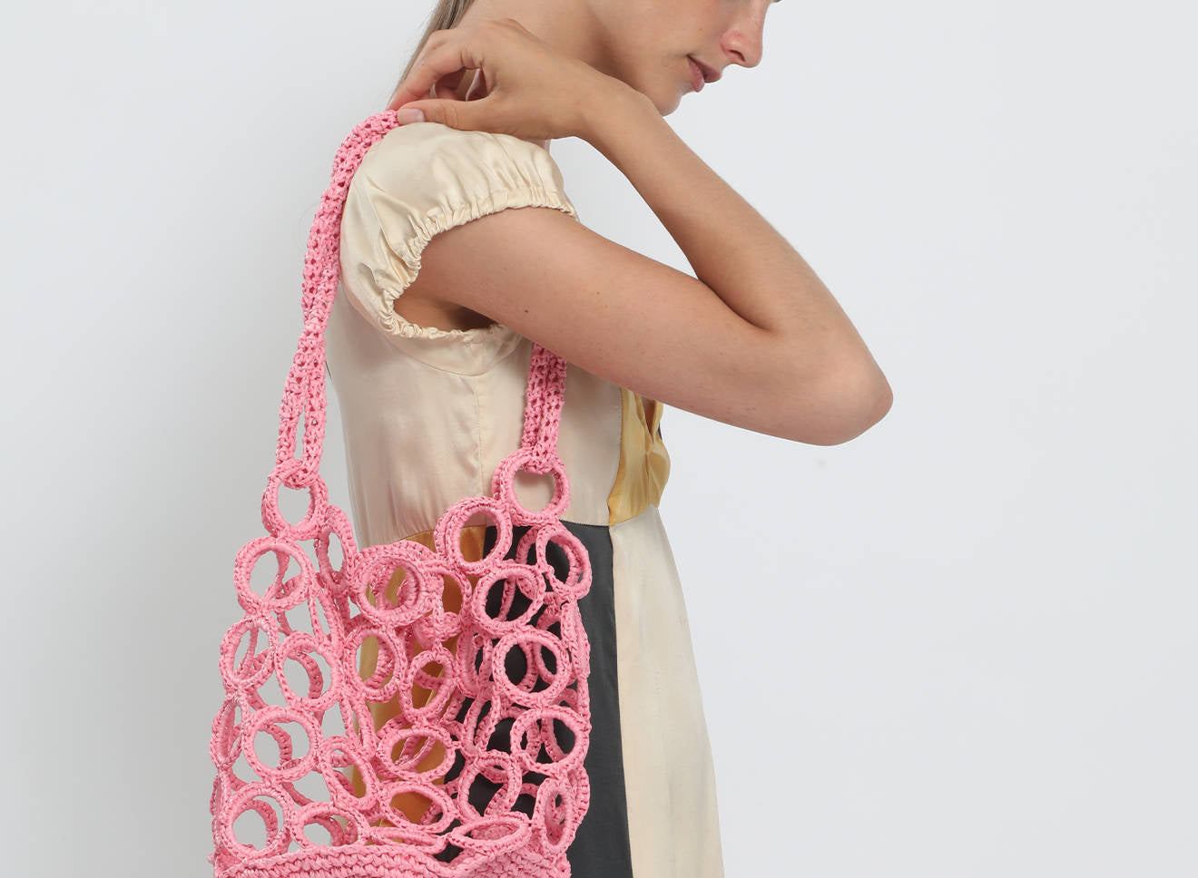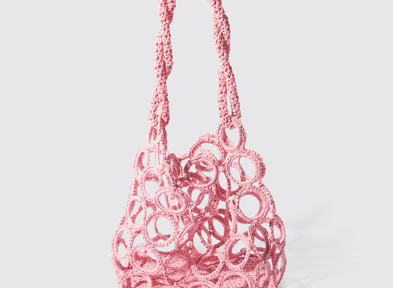 La costruzione crea un raffinato gioco di pieni e vuoti, donando alla silhouette un carattere grafico e scultoreo. La rafia, luminosa e materica, valorizza la tridimensionalità dell’intreccio e conferisce alla borsa una presenza naturale ma sofisticata.