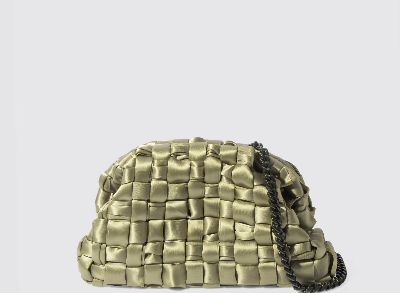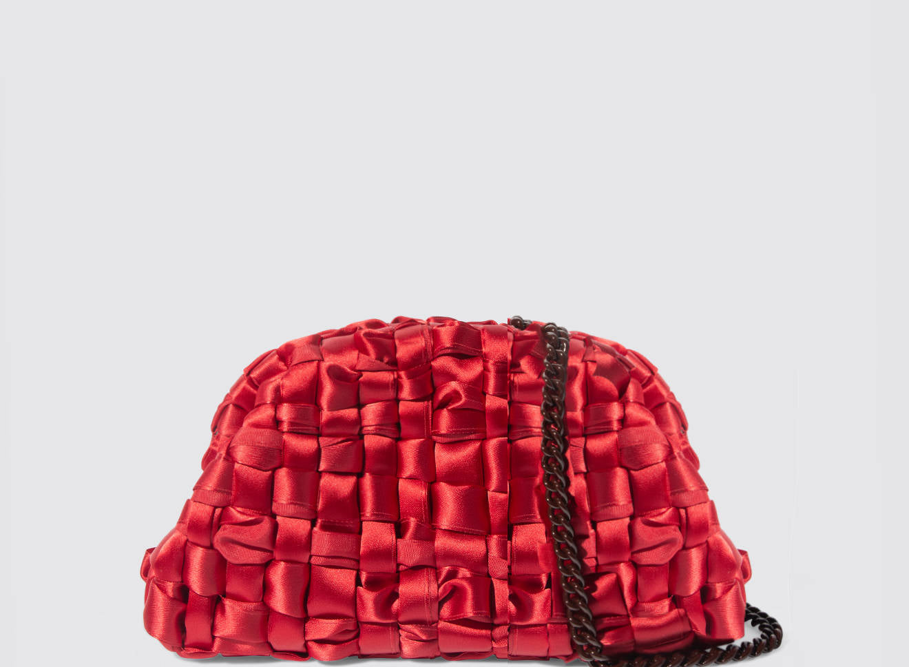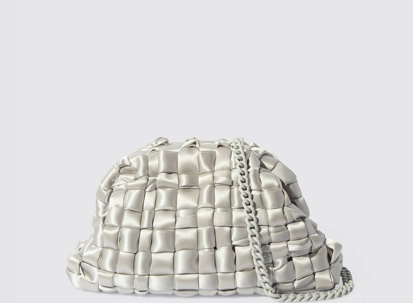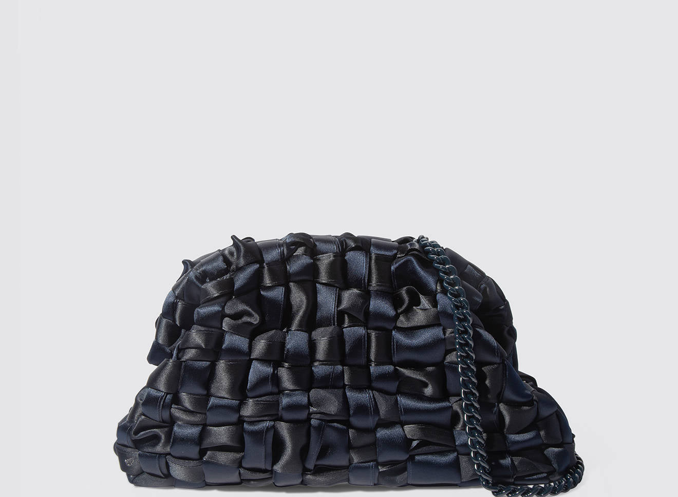 Clutch realizzata in satin intrecciato a mano, dal design sofisticato e contemporaneo. La texture morbida e luminosa dona un effetto elegante e ricercato, mentre la catena in metallo permette di indossarla comodamente anche a spalla. Un accessorio versatile che aggiunge un tocco di raffinatezza a qualsiasi look, dal giorno alla sera.