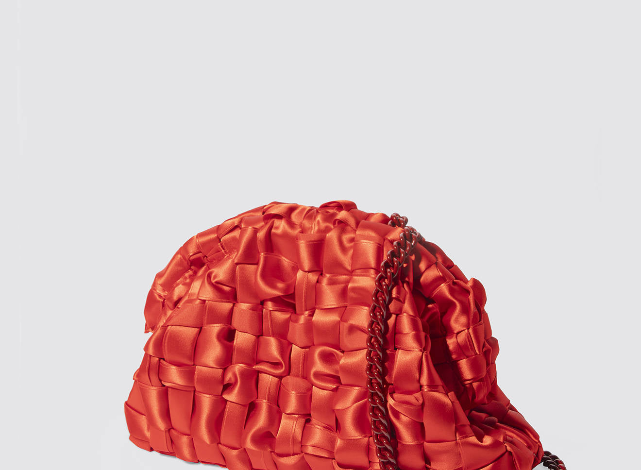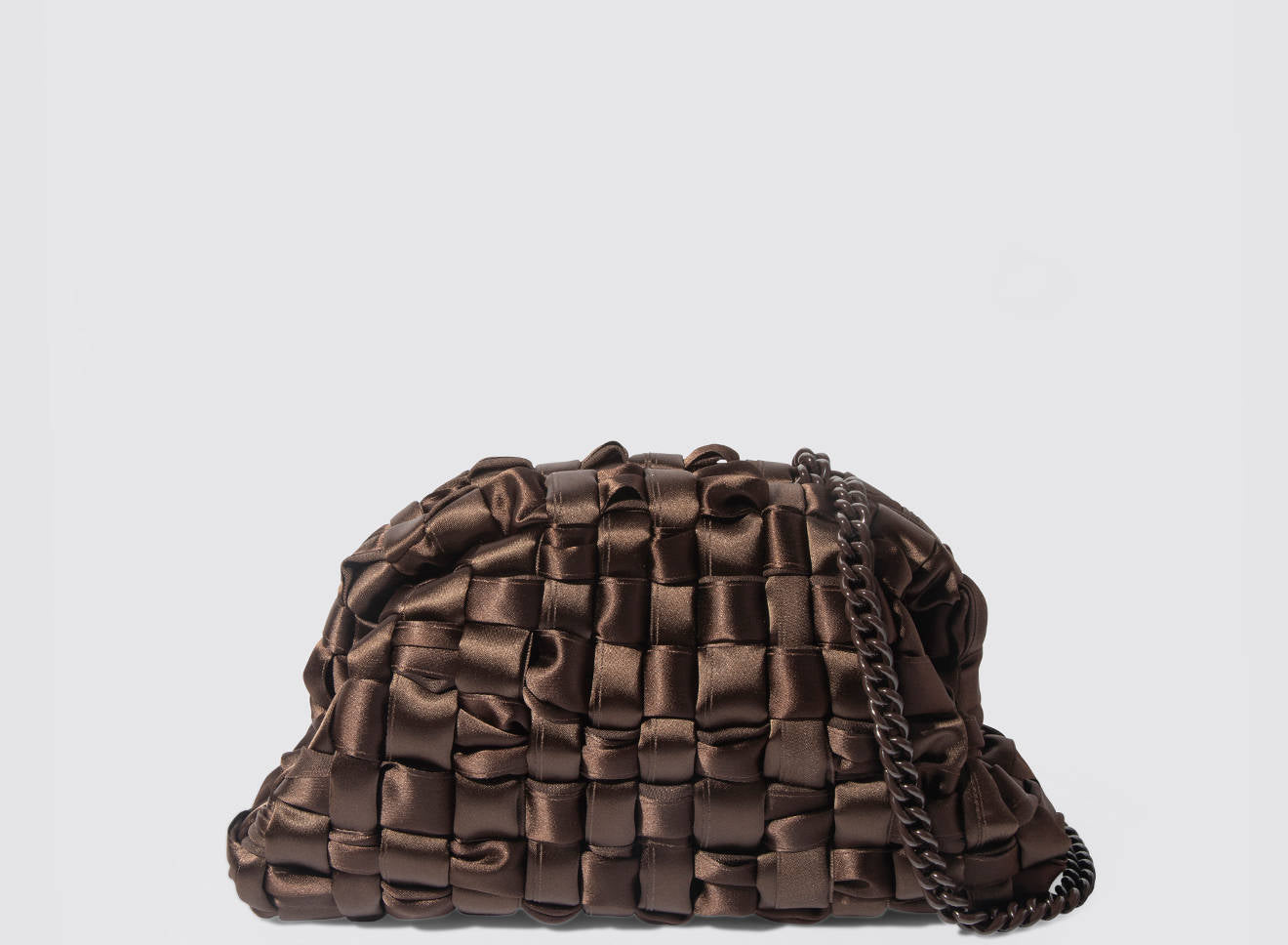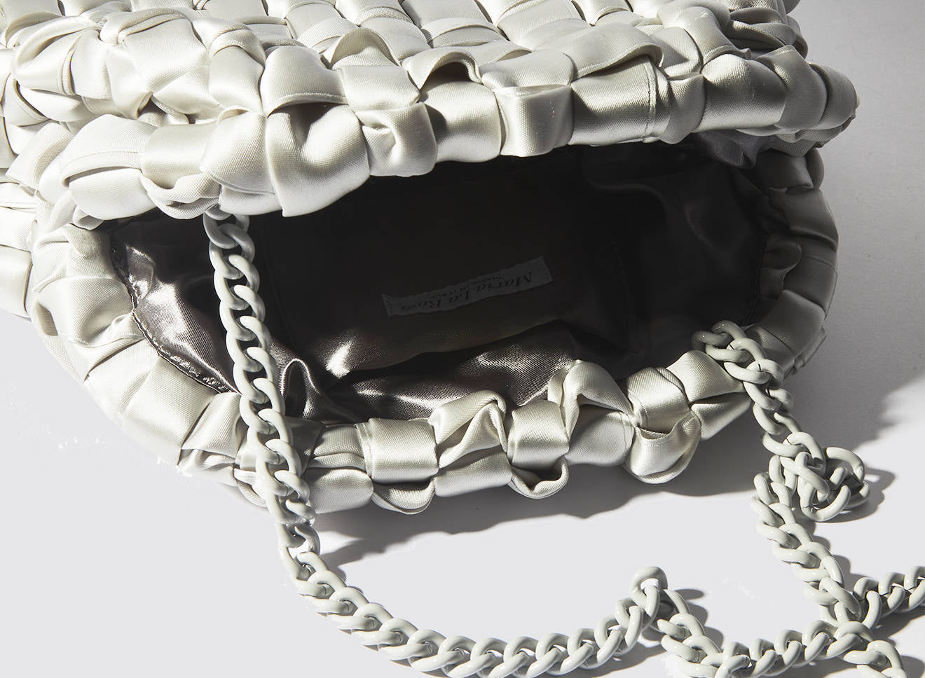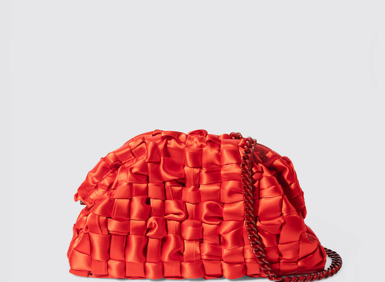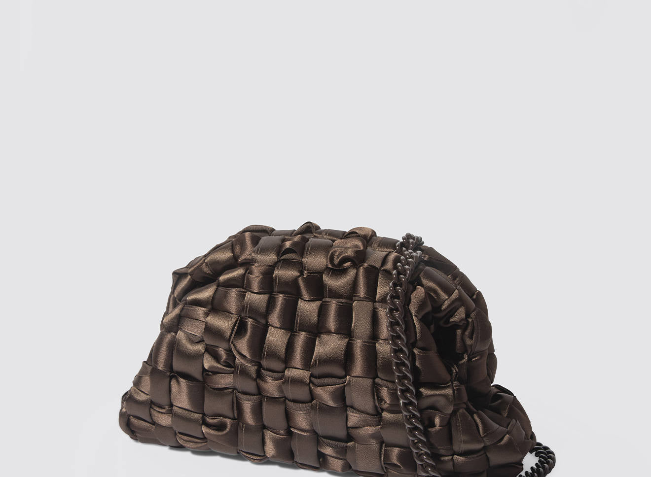 Clutch realizzata in satin intrecciato a mano, dal design sofisticato e contemporaneo. La texture morbida e luminosa dona un effetto elegante e ricercato, mentre la catena in metallo permette di indossarla comodamente anche a spalla. Un accessorio versatile che aggiunge un tocco di raffinatezza a qualsiasi look, dal giorno alla sera.