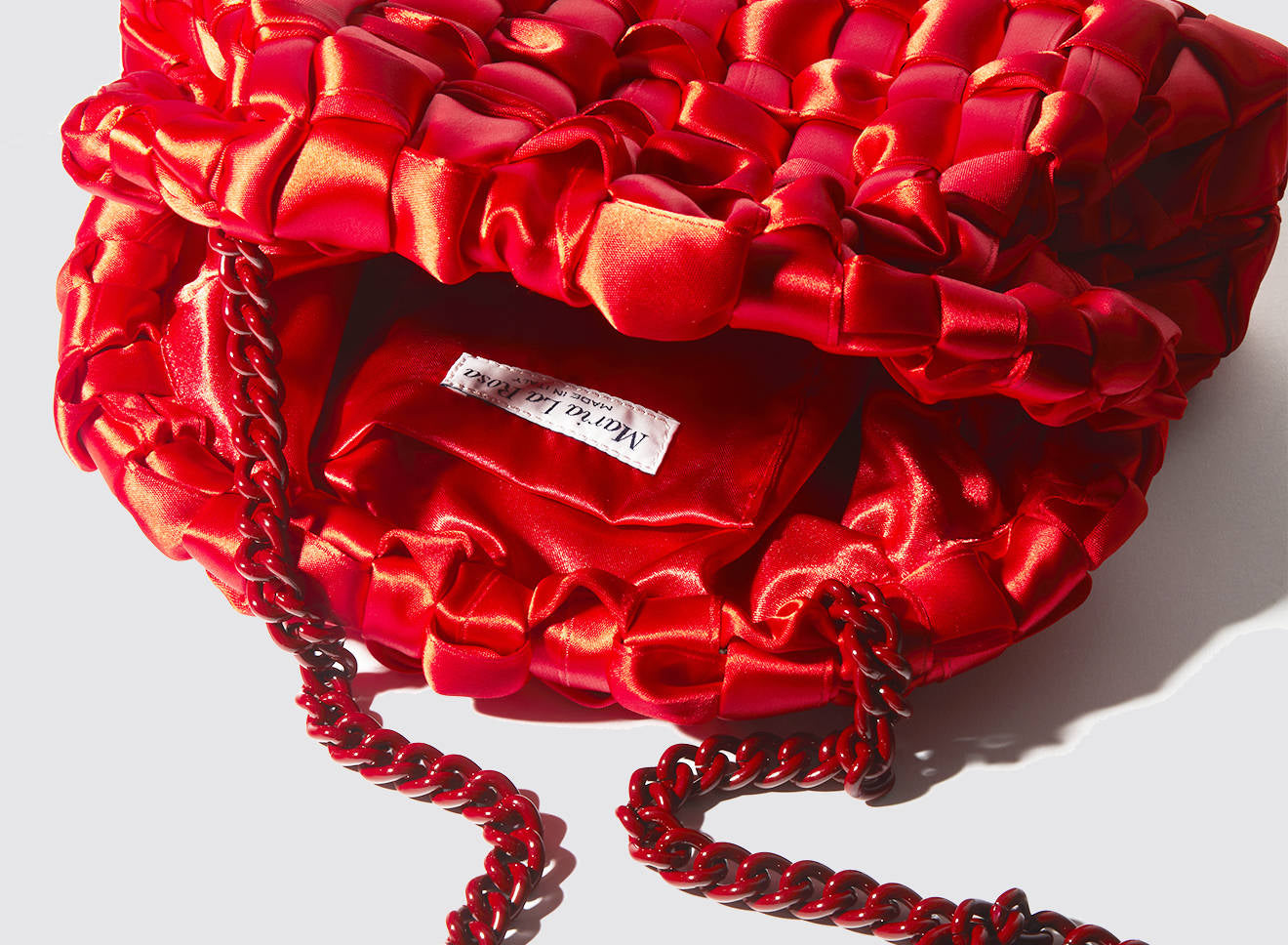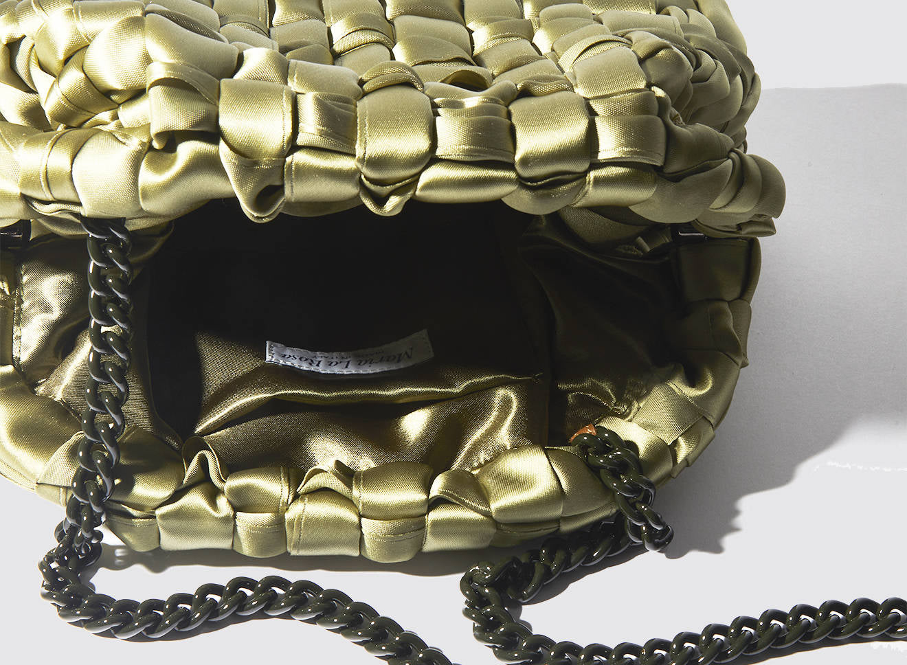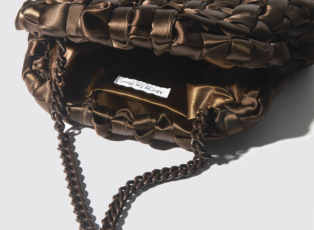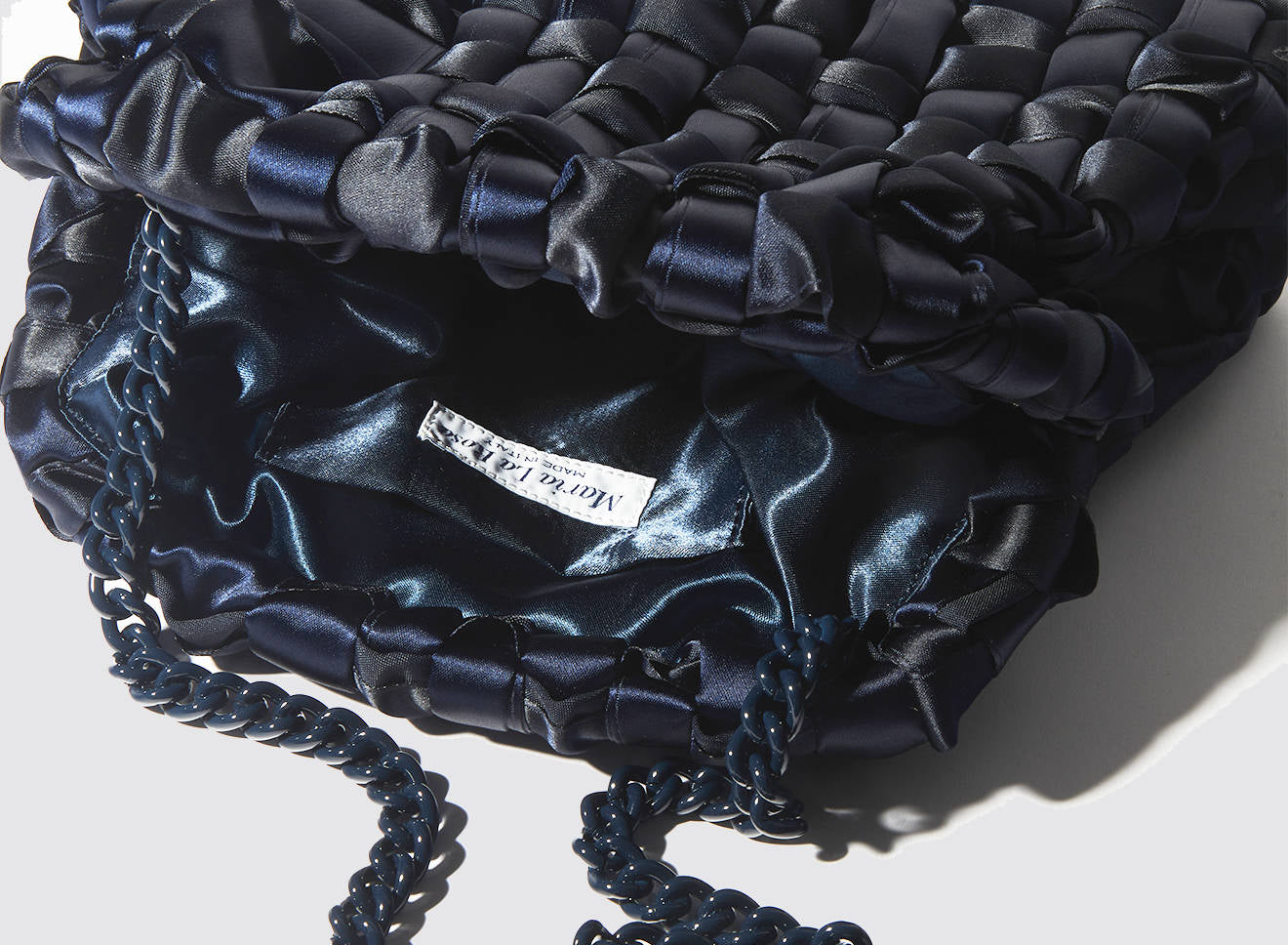 Clutch realizzata in satin intrecciato a mano, dal design sofisticato e contemporaneo. La texture morbida e luminosa dona un effetto elegante e ricercato, mentre la catena in metallo permette di indossarla comodamente anche a spalla. Un accessorio versatile che aggiunge un tocco di raffinatezza a qualsiasi look, dal giorno alla sera.