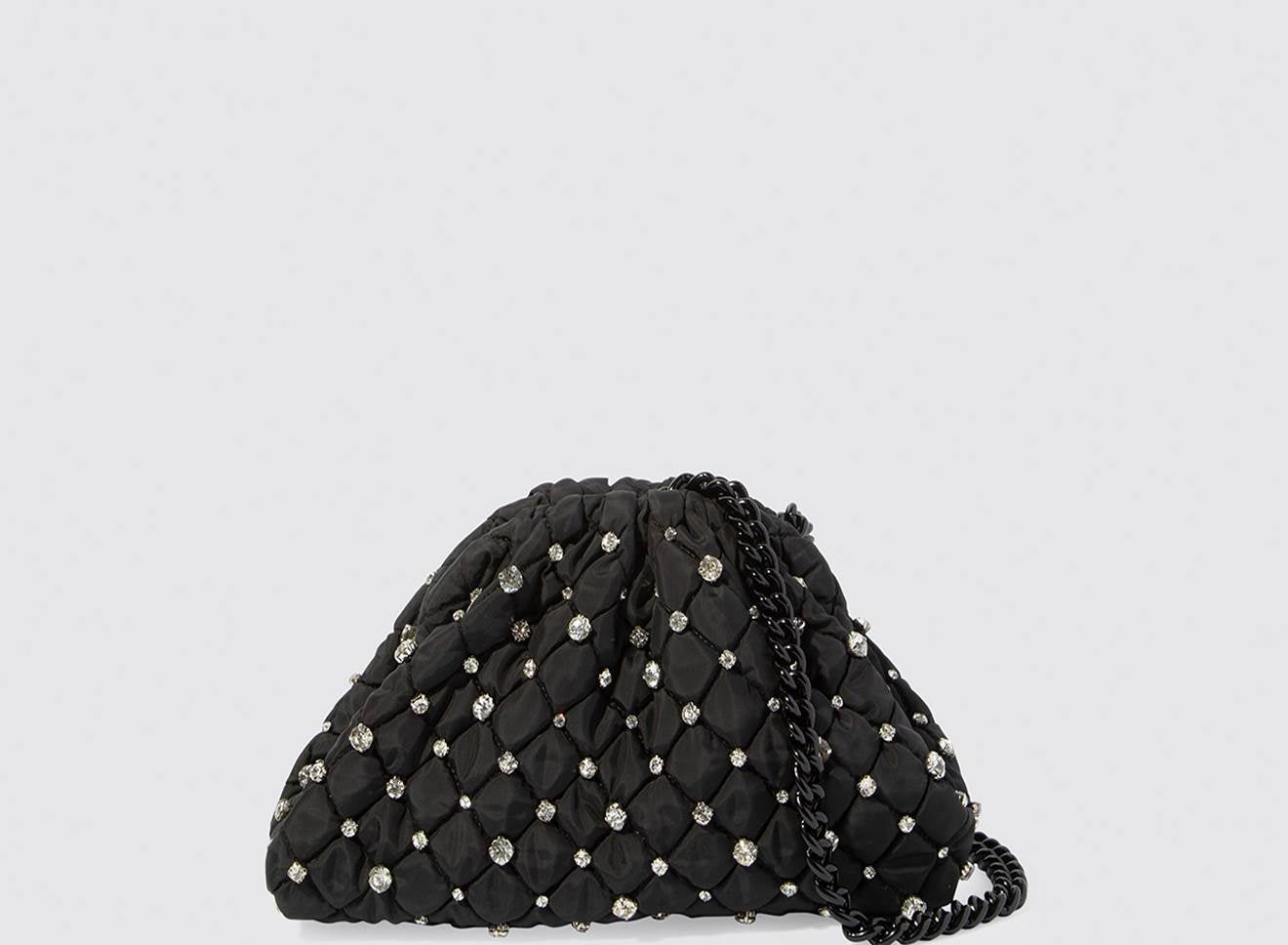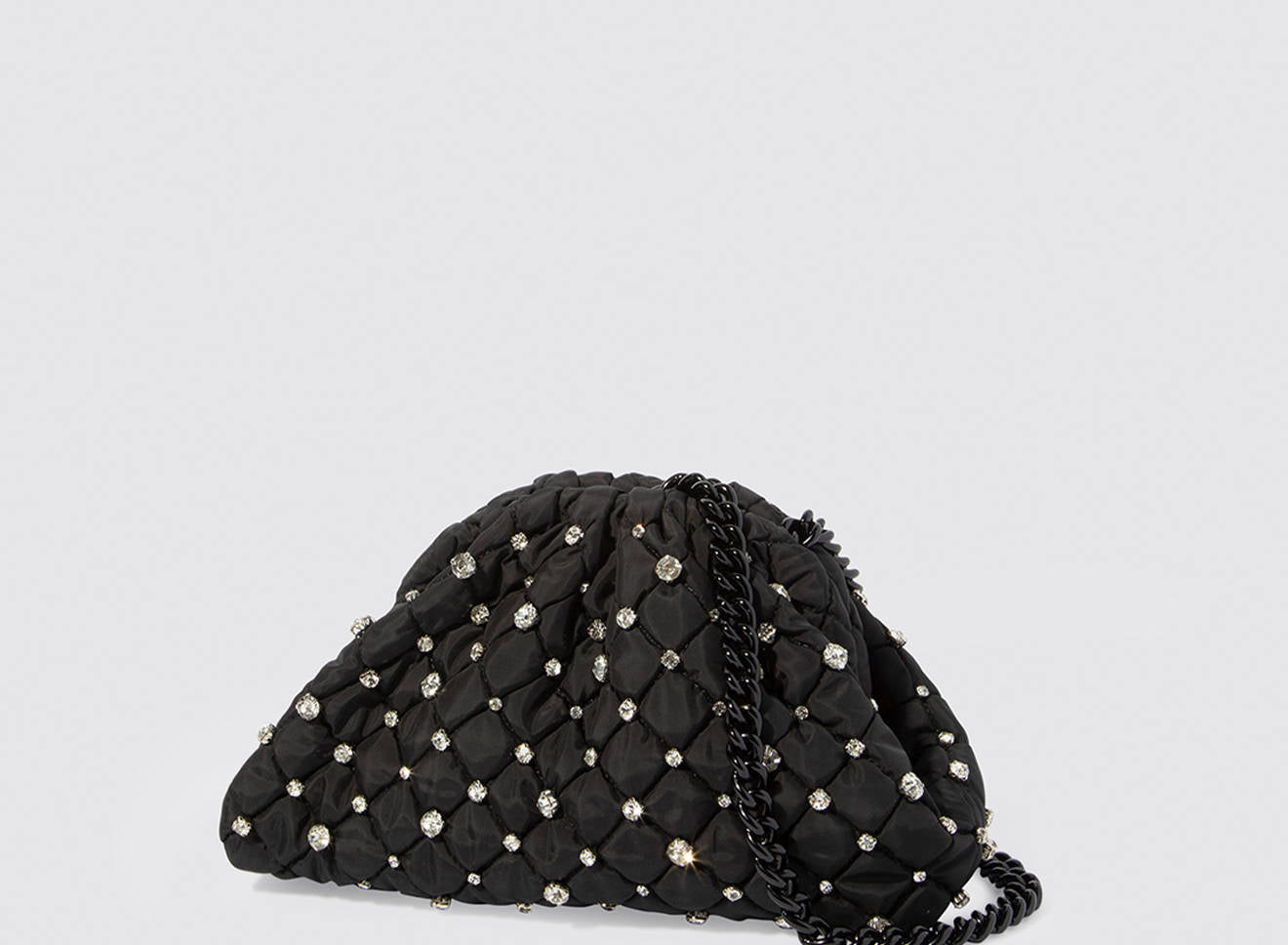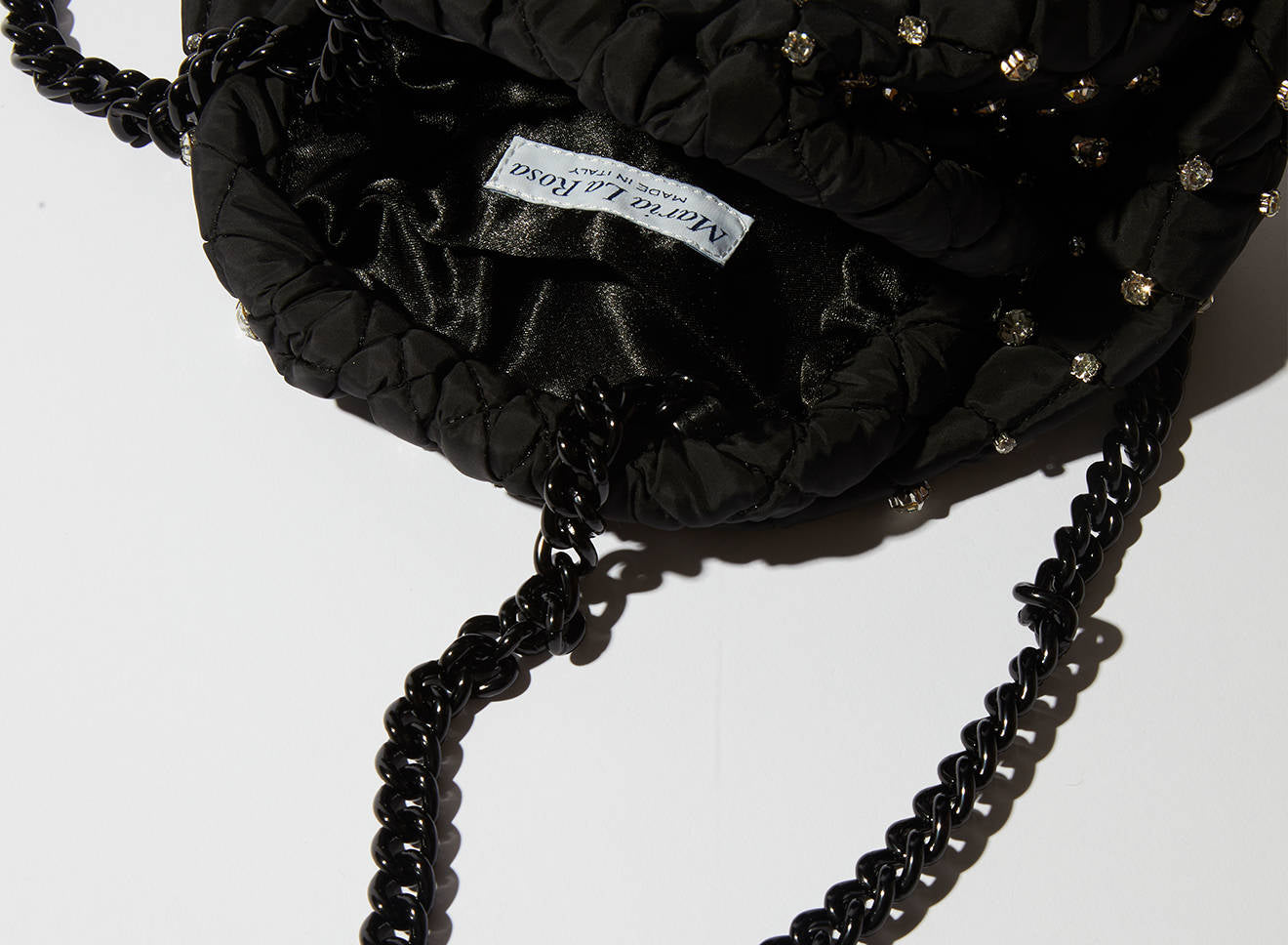 Clutch da donna di piccole dimensioni in tessuto matelassè con strass ricamati a mano. Questa inedita versione ridotta dell’icon bag Maria La Rosa, è capiente quanto basta per portare con sé l'essenziale. Perfetta per la stagione invernale, costituisce l’emblema di una nuova eleganza metropolitana. È dotata di catena ton sur ton per indossarla anche a tracolla.