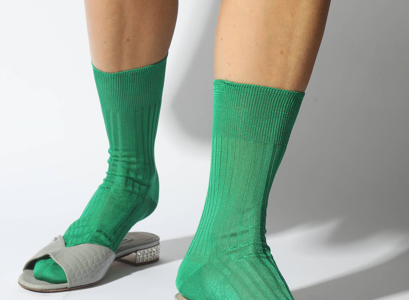 Calzini da donna a metà polpaccio, completamente realizzati in seta, a costine, adatti a tutte le stagioni.