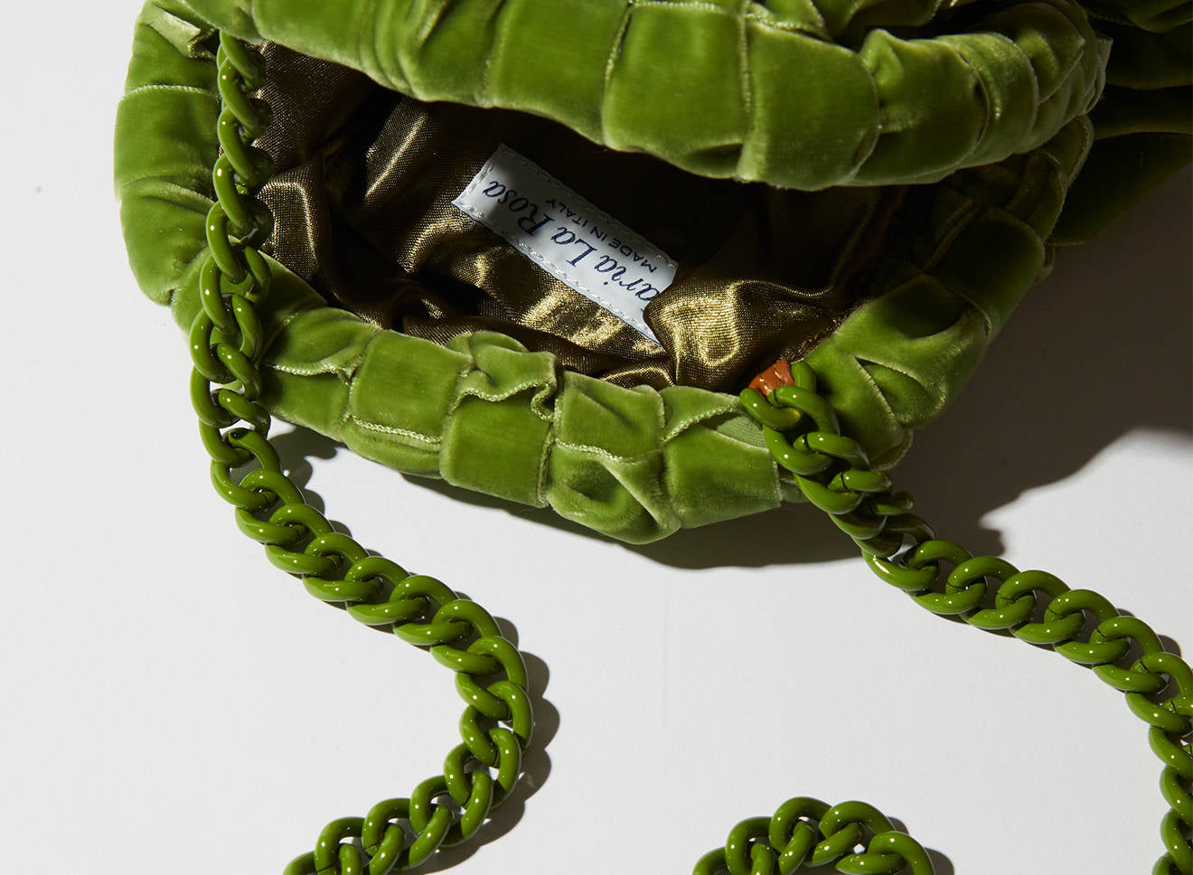 È dotata di catena ton sur ton per indossarla anche a tracolla e tante sono le varietà cromatiche tra cui poter scegliere. Interamente disegnata e prodotta in Italia.